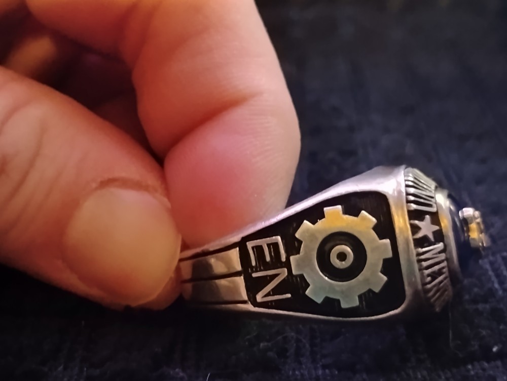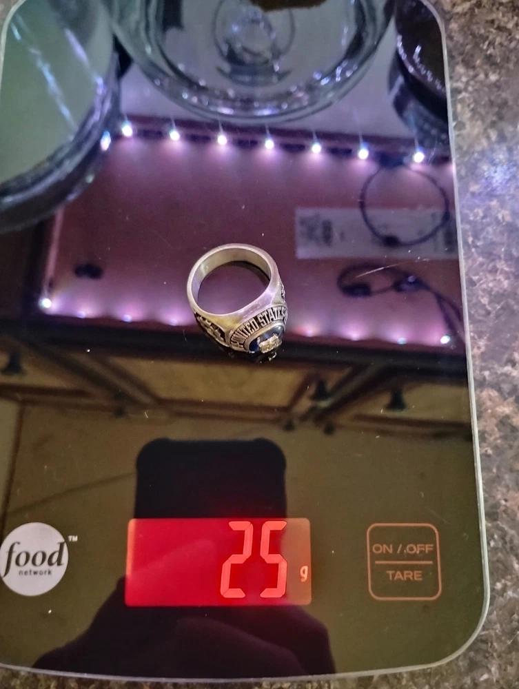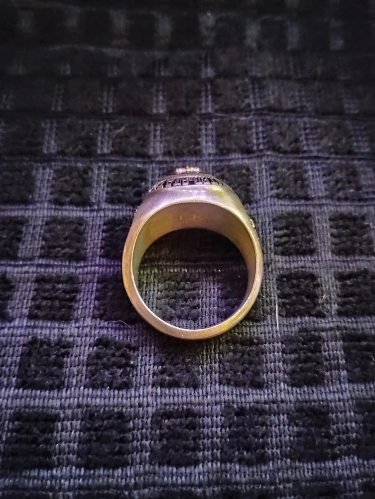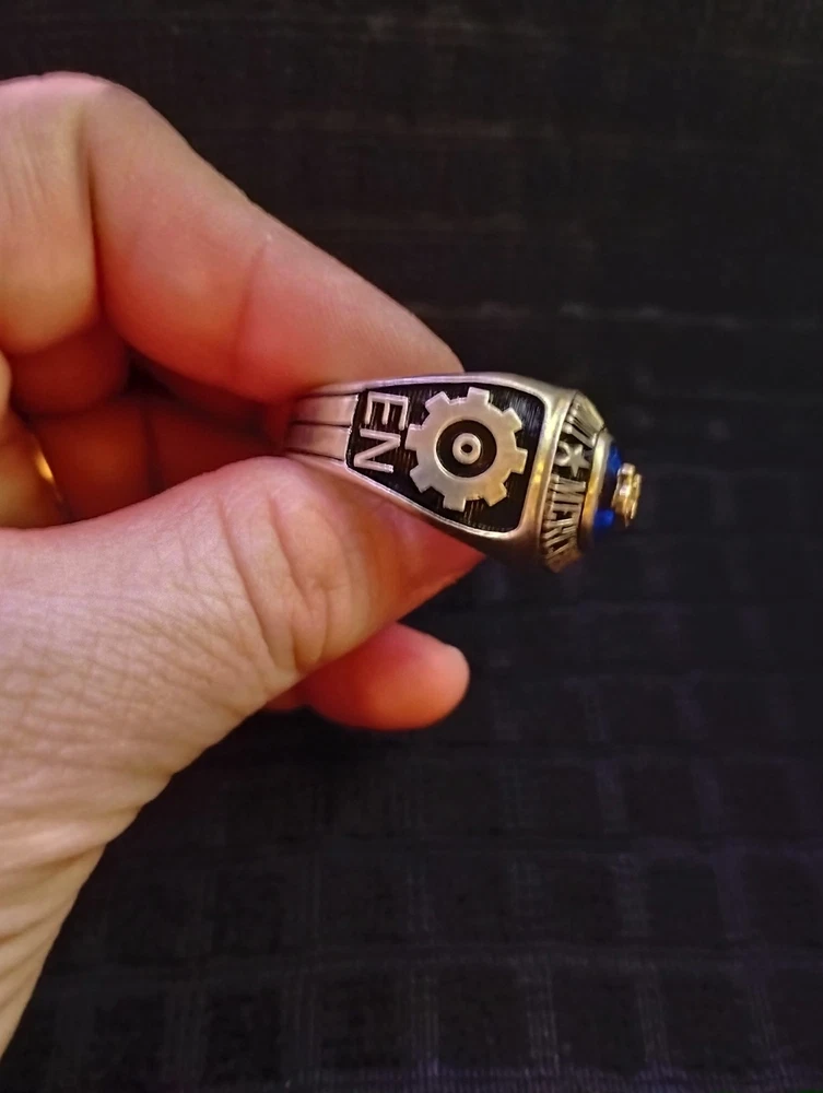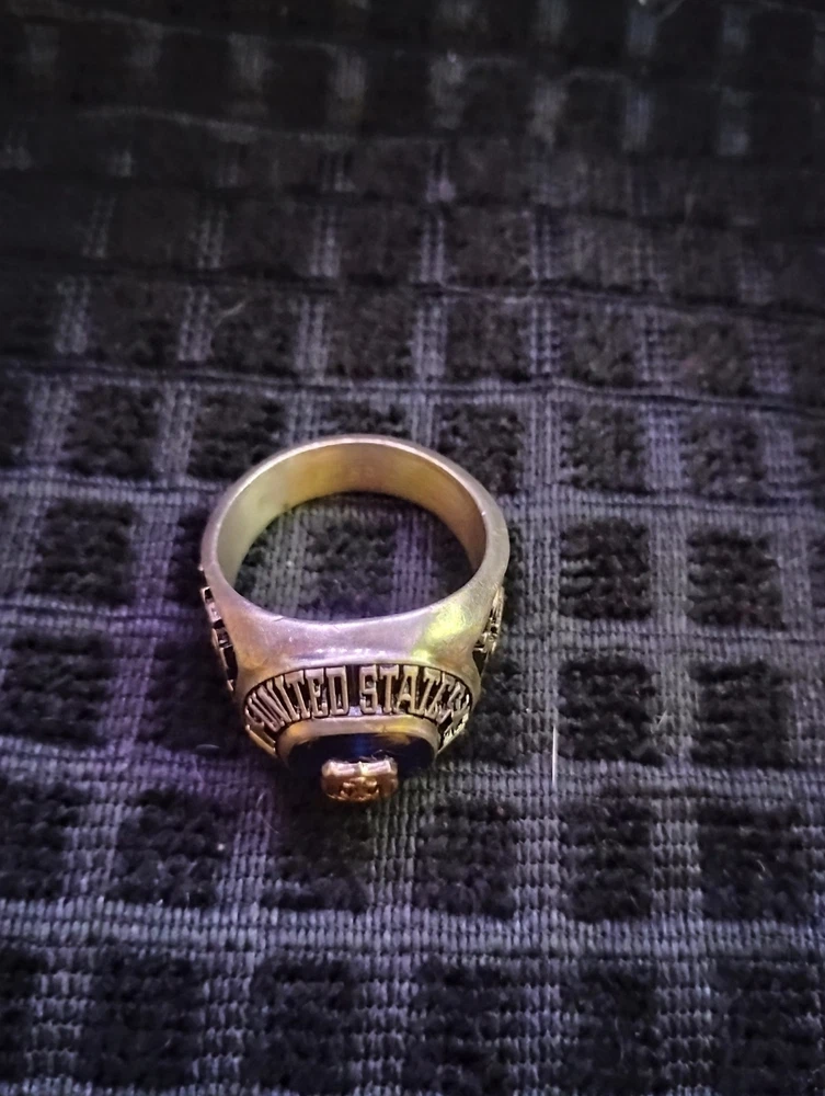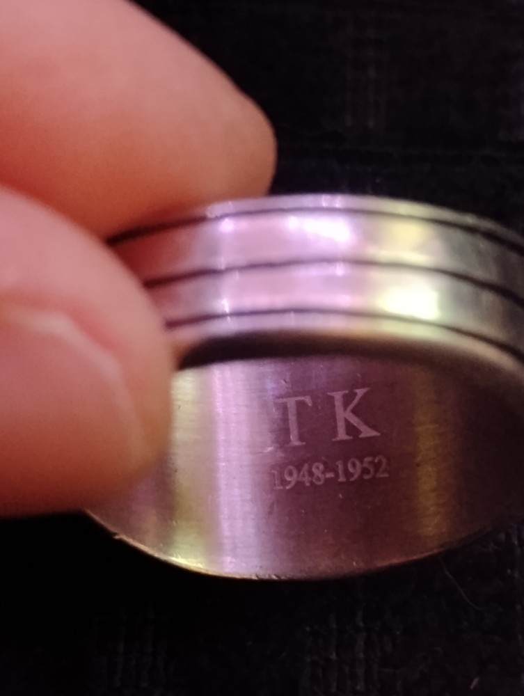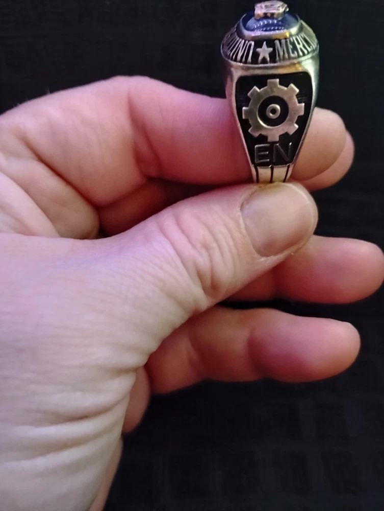 The product is a United States Merchant Marine USSM/EN ring made of sterling silver, with a size 13. This collectible item is themed around militaria, specifically the Navy force. It is a patriotic and military-themed accessory that would be a great addition to any collection or as a display piece for those who appreciate military history and symbolism. it has 1948-1952 engraved on the inside along with the initials of tk.