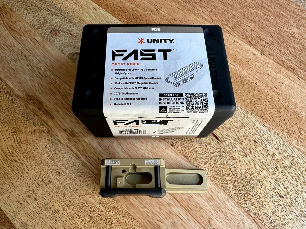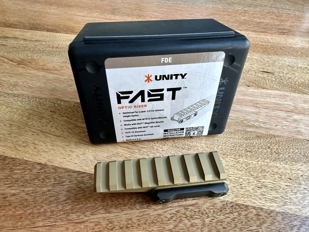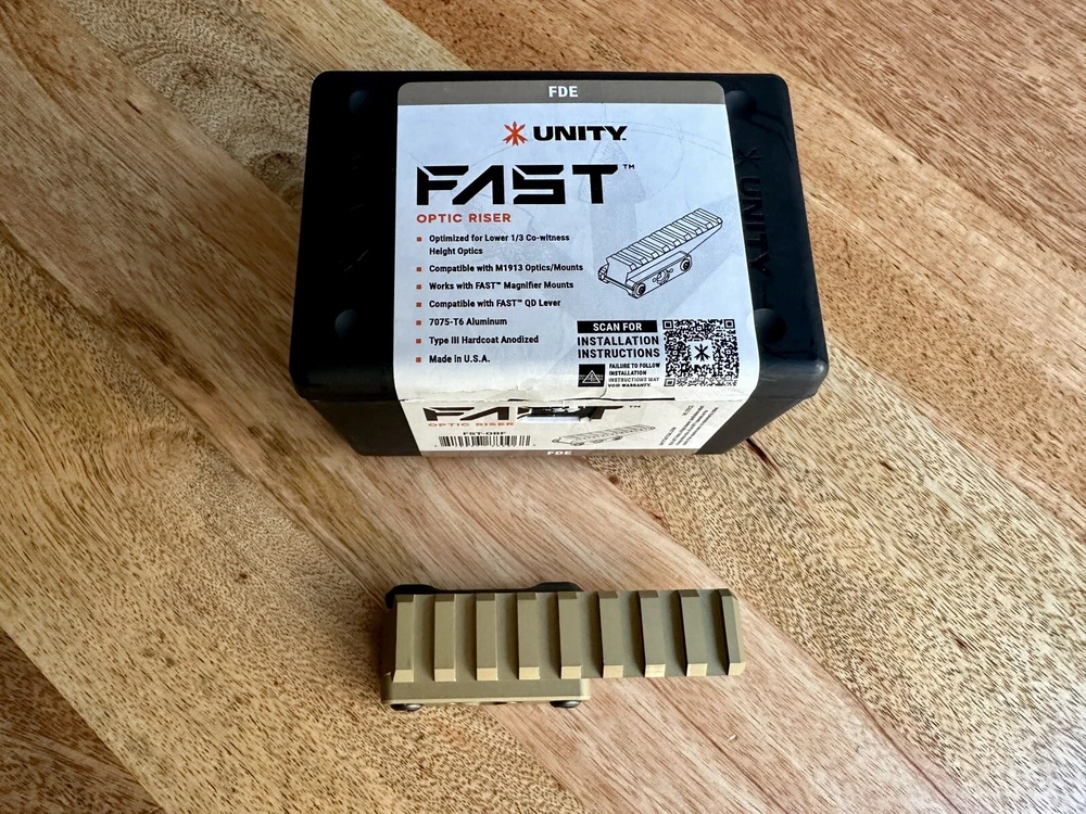 Purchased New. Lightly Used. No Damage. FAST™ is a series of optic mounts and platforms that provide end users with a quicker sight picture than standard height mounts. A 2.26” optical centerline height provides faster/easier reticle acquisition while wearing electronic earpro/communications headsets, night vision goggles and gas masks and allows for more rapid visual processing of the battlefield by promoting a heads-up posture. A heads-up posture also helps users maintain a neutral spine position which is more comfortable while wearing helmets, plate carriers, and other heavy gear. FAST™ Riser securely elevates block-type red dot optics with a standard lower 1/3 cowitness picatinny mount to a 2.26″ optical center line. FAST™ Riser provides an elevated M1913 Picatinny platform for direct attachment of optics such as EOTech EXPS®, Leupold LCO®, Vortex UH-1®, and other “lower 1/3” optics*. *Technically, the FAST™ Riser will support “absolute cowitness” optics such as EOTech XPS®, Sig Sauer Romeo8H®, etc. But, compatibility with the FAST™ FTC Magnifier Mount will be limited. The FAST™ Riser comes standard with a rail-grabber clamp. The FAST™ Riser is built from 7075-T6 Aluminum and Type III Hardcoat Anodized Black or FDE*. DIMENSIONS: 2.50″(L) x 1.21″(W) x 0.67″(H) WEIGHT: 2.8 oz. MATERIAL: 7075-T6 Aluminum COATING: Type III Hardcoat Anodized MOUNT TYPE: Rail Grabber COMPATIBILITY: All Direct-to-Rail Mounted Optics. Optimized for Lower 1/3 Height Optics Note if using Absolute Cowitness Height Optics: If used in conjunction with one of our FAST FTC Magnifier Mounts, you will notice a minimal occlusion of the bottom of the sight picture when the magnifier is stowed. *NOTE* Unity's “FDE” references a spectrum of colors that include tan, brown, bronze, earth, and everything in between. Due to the chemical process that takes place during Type III Hardcoat, the final finish can vary from part to part (even parts done in the same batch). Therefore, your “FDE” product may vary from other parts from UNITY and other companies, and may vary from the photos shown online.