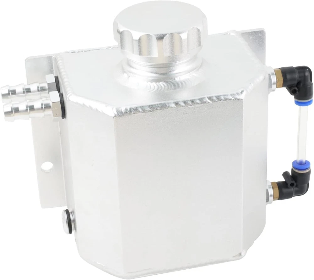 [Size] The Male to barb fitting thread size is M14*1.5.can work with 3/8" ID fuel hose.Overflow tank storage volume1L. [Fitment]Universal coolant reservoir tank, fit for mostly of vehicles.Please measure before purchase to make sure there is enough space for installation. [Note]Tight closed cap, fully TIG welded and thread come with O-ring gasket, let coolant reservoir can keep a good closed environment and prevent coolant leakage.It is high recommended use Tetflon tape when install, it can enhance airtightness prevent interface leakage. [Function]When the coolant pressure in the radiator exceeds the pressure cap setting, the coolant is sealed through the pressure cap and flows through the overflow tube into the radiator coolant overflow tank.Bottom port is radiator overflow Universal coolant reservoir tank, fit for mostly of vehicles.Please measure before purchase to make sure there is enough space for installation. Feature: Capacity:1L Pipe ID :3/8" Thread size:M14*1.5 Size:165mm/6.5inchx80mm/3.15inchx112mm/4.41inch Package: Coolant Overflow Tank * 1 Hollow Nut & Pneumatic Connector *2 Hose Connector *2 Aluminium Cap *1 1L Universal Coolant Overflow Tank,Reservoir Expansion,Aluminum Coolant Radiator Expansion Tank Universal coolant reservoir tank, fit for mostly of vehicles 1L storage capacity It can enhance airtightness and prevent interface leakage Please measure before purchase to make sure there is enough space for installation High Quality & Durable Color: Silver Material: Aluminum alloy Anodized polished and durable,it has the advantages of good corrosion resistance,high hardness,wear resistance and heat resistance Level indicator Level indicator,easy to read level Bottom drain valve with o-ring.Easy to clean,seals well and reusable constantly When the coolant pressure in the radiator exceeds the pressure cap setting, the coolant is sealed through the pressure cap and flows through the overflow tube into the radiator coolant overflow tank