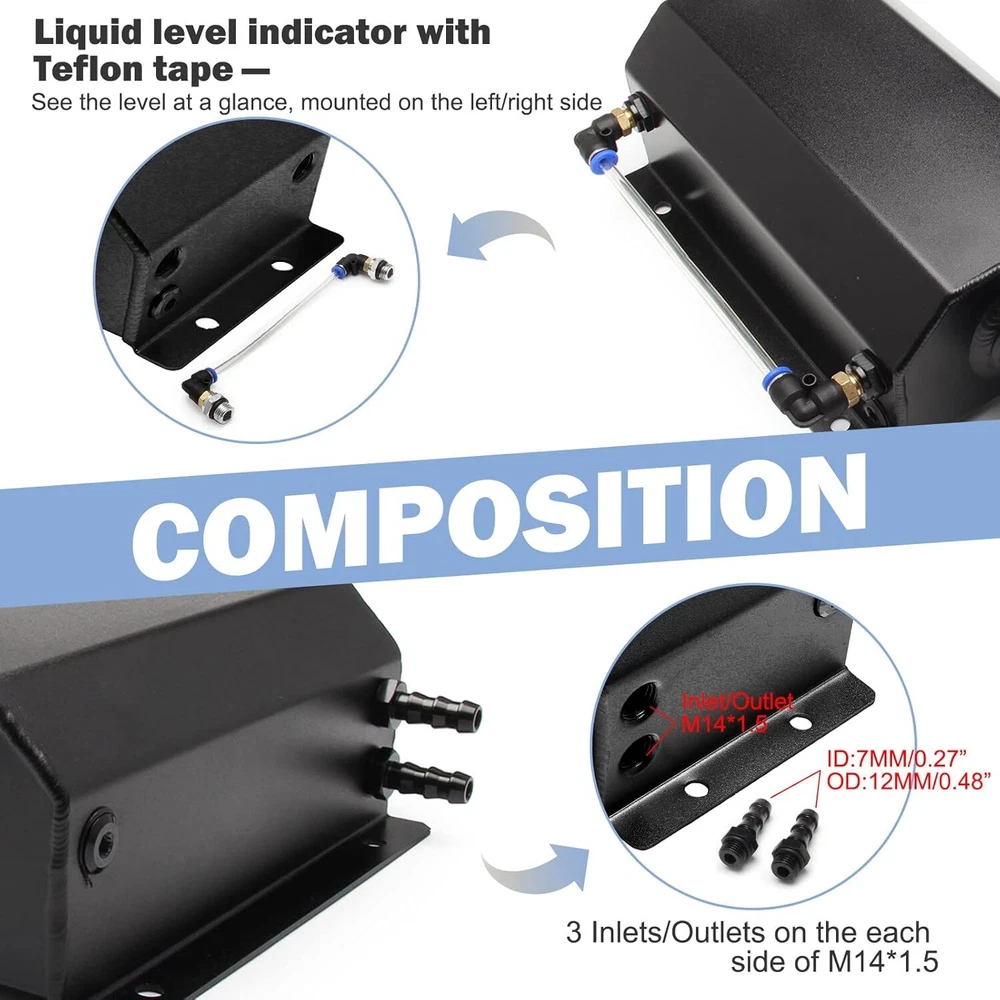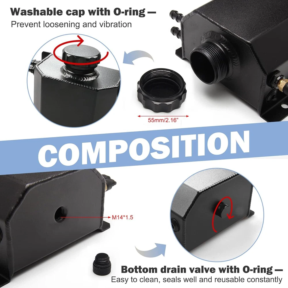 Specification: Capacity: 2 Litre Color: Black(if you need Silver , please remark ) Width: 170mm (Inc flanges) Body length: 250mm (Inc Cap) Inlets / Outlets Size: 12mm Height: 85mm Thread Size: ORB-6 Material: Aluminium anodized Installation instruction is not included Package Included: 1 x 2 Litre Tank 1 x Cap (not available to breathe) Universal Coolant Overflow Tank 2l Aluminum Coolant Radiator Overflow Reservoir Expansion Tank Black This is a coolant expansion reservoir containing overflow coolant/water from the radiator. It is constructed of high-quality aluminum alloy, high temperature and corrosion resistance. It can keep your engine at the right temperature under a variety of conditions. Specifications: Condition: 100% brand new Material: Aluminum Color: Silver / Black Size: 245MM x 170MM x 85MM (8.6" x 5.1" x 3.3") Capacity: 2L Inlet and outlet port: 12 mm (0.47") CNC billet aluminum filler neck: 36 mm (1.42") ID Bottom and side drain hole: 9/16-18UNF (6AN/ORB -6) Thickness: 3 MM (0.12") Package: 1*coolant expansion reservoir with cap; accessory as photo shows