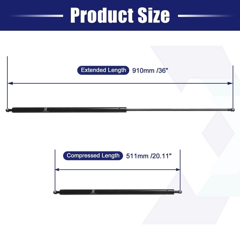 Feature: Easy to install with simple hand tools in just few minutes. The gas springs are powerful, can support small,medium to heavy object. Such as car window, car bonnet or car tailgate. With easy fittings to any surface, just attach and lift, your gas spring lifts and holds any weight's object. This gas spring is universal, which fits for RV window, car hood and trunk, pickup truck tonneau cover, tailer cover, bus luggage door, motorcycle seat cover and so on. Specification: Material: Metal Color: Black Placement on Vehicle: Rear Pickup Truck Tonneau Cover Force: 80lbs Extended Length:910mm /36" Compressed Length:511mm /20.11" Total Length: 922mm / 36.30" Rod Length: 399mm / 15.70" Housing Diameter: 22.1mm / 0.87" Connecting Rod Diameter: 10mm / 0.40" Feature: Easy to install with simple hand tools in just few minutes. The gas springs are powerful, can support small,medium to heavy object. Such as car window, car bonnet or car tailgate. With easy fittings to any surface, just attach and lift, your gas spring lifts and holds any weight's object. This gas spring is universal, which fits for RV window, car hood and trunk, pickup truck tonneau cover, tailer cover, bus luggage door, motorcycle seat cover and so on. Specification: Material: Metal Color: Black Placement on Vehicle: Rear Pickup Truck Tonneau Cover Force: 80lbs Extended Length:910mm /36" Compressed Length:511mm /20.11" Total Length: 922mm / 36.30" Rod Length: 399mm / 15.70" Housing Diameter: 22.1mm / 0.87" Connecting Rod Diameter: 10mm / 0.40" Note: If the temperature is lower than minus 20 degrees, the oil density of the gas spring turns high (frozen) and it is difficult to press down. Package Included: 2pcs Gas Struts