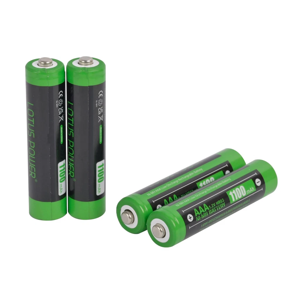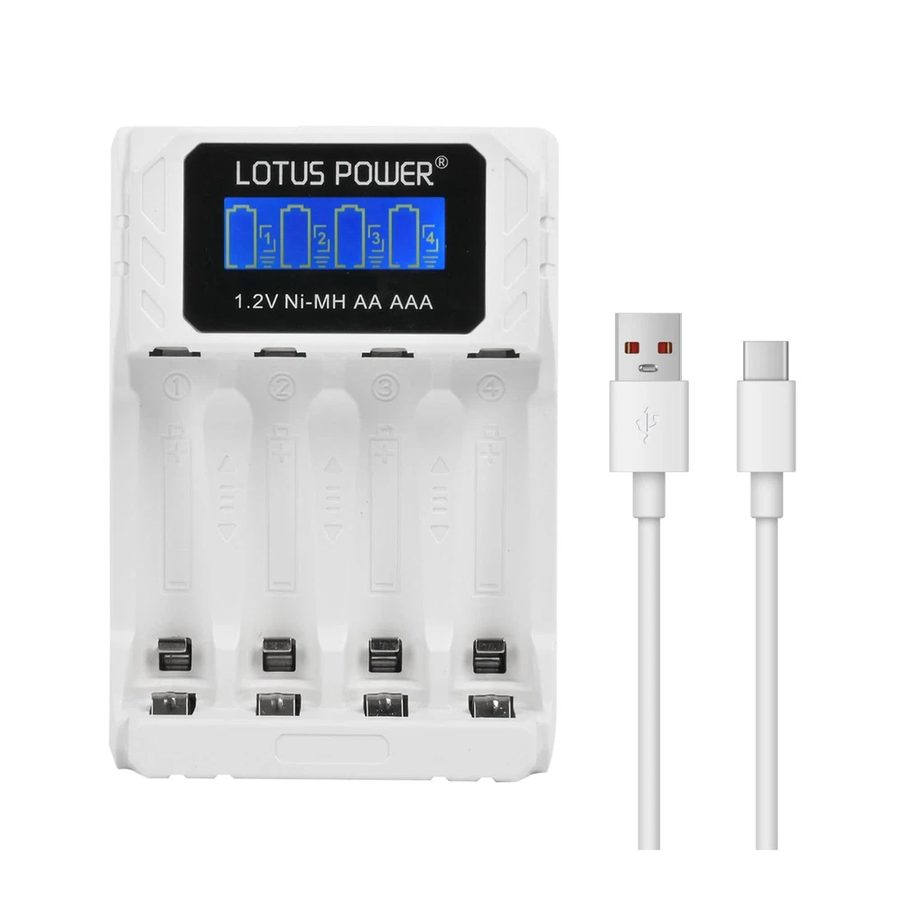 Ni-MH AA / AAA Battery Charger & 4 AAA Batteries Set - Attention: Because of the characteristic of Ni-MH battery, when the battery is fully charged, please cut off the power immediately. - With USB to Type-C cable, the charger can charge 4 batteries at once from car battery, power bank, computer or other DC power source. - The indicator on the LCD display keeps you informed of the battery status and allows you to check the progress of each charge. - Parameter of the Charger: Input: 5V 2A Output: DC 1.4 V 0.45 A * 4 Size: 92 * 65 * 30 mm Weight: 89 g - The AAA batteries (size: 10.1 * 43.6 mm, capacity: 1100 mAh) are small and easy to carry when traveling. They are rechargeable, recyclable and low self-discharge. Package Includes: 1* 4-Slot Ni-MH Battery Charger 1* Type-C Cable 4* AAA Rechargeable Battery Convenient and Save Time: Four independent charging slots, no interference. With USB to Type-C cable, you can charge your battery everywhere at any time. In addition to the charger, the set already contains 4 rechargeable AAA batteries. Attention! Because of the characteristic of Ni-MH battery, when the battery is fully charged, please cut off the power immediately.