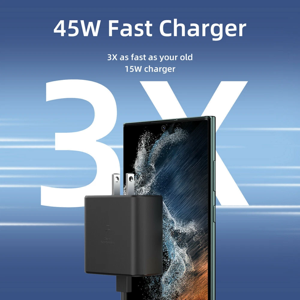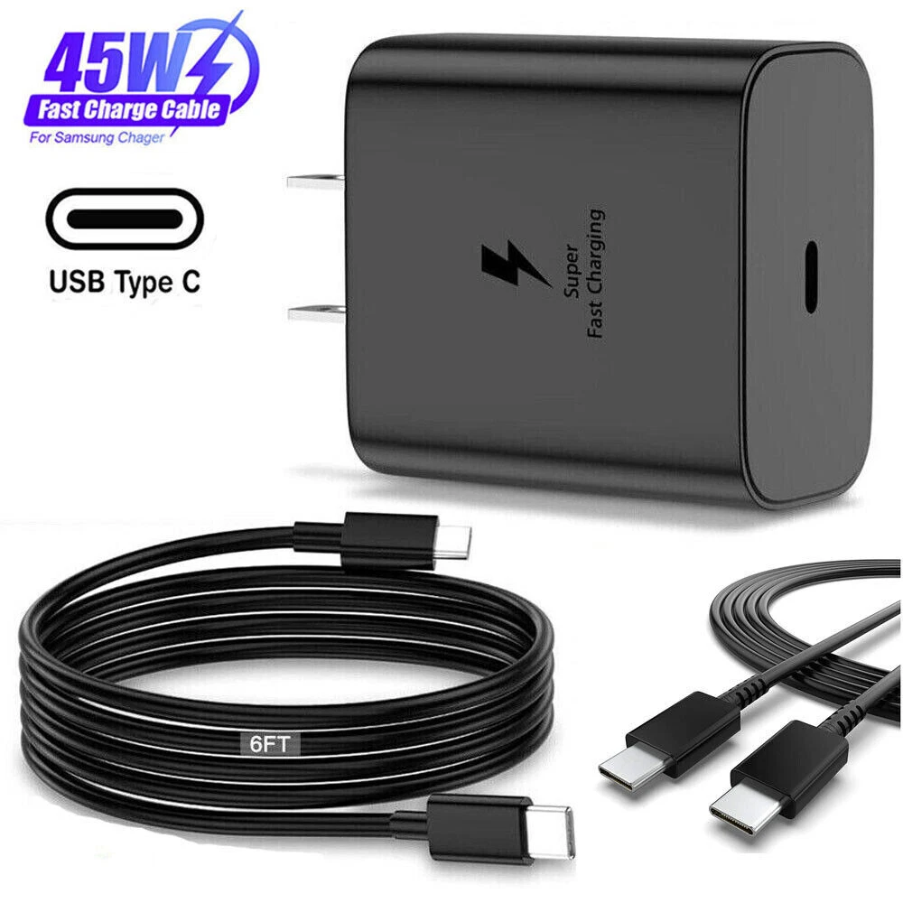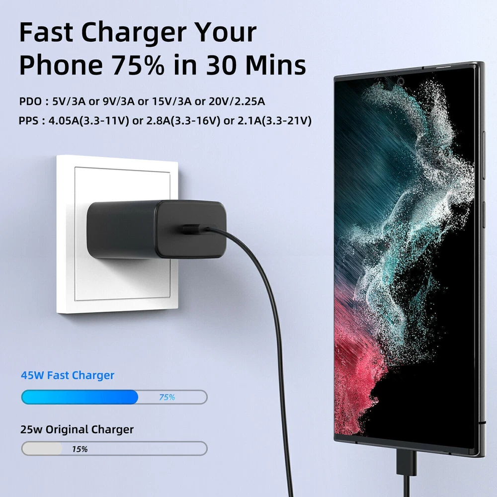 Features: 1.【45W Fast Charging】This super fast USB C charger with maximum power of 45 Watt Super Fast Charge capability uses Power Delivery technology to provide the most efficient charge possible. Super fast charge for Samsung Galaxy S22 Ultra from 0% to 50% in just 20 min, higher and faster than 15W or 25W charger. 2.【USB C to USB C Cable】 The 45 watt usb c charger block kit come with a detachable USB-C to USB-C cable , so you can charge your phone from any other USB-C power source such as your phones, tablets, and computers. Use the cable to sync and transfer files at blazing speeds with your Galaxy or any other compatible smartphone or laptop. 3.【Compatible Models 】 Super Fast Charging 2.0 maximum 45W consistent with Samsung Galaxy S22, S22+, S22 Ultra, S20 Ultra, Note 10+, Note 10+ 5G, A91 and future compatible devices. Super Fast Charging max. Super Fast Charging maximum 25W consistent with Samsung Galaxy S21/S21 Ultra/ S21+ 5G, S20/ S20+/ S20 FE, Note 10/ Note 10 5G, Note 20/ 20 Ultra 5G/ S10 5G, Galaxy Z Fold 3 5g, A90 5G, A80, A70, Book S, Tab S7/S7+/S8/S8+/S8 Ultra. 4.【Portable Wall Charger】 This charger itself is compact which makes it highly portable. Ideal for taking with you on holidays or short trips. Easy to store and carry around with you for quick and convenient charging. 5.【Safe & Reliable】 Over-current, over-voltage and short-circuit protection effectively protect your devices from damage. Specification: .Type: 45W PD3.0 fast charge charger .Output power: 45W .Material: Fireproof ABS Plastic + PC .Port Type: USB-C .Input voltage: AC 100-240V 50-60Hz .Working temperature: 0-70℃ .Output voltage: PDO : 5V/3A or 9V/3A or 15V/3A or 20V/2.25A .Output current: PPS : 4.05A(3.3-11V) or 2.8A(3.3-16V) or 2.1A(3.3-21V) .Output protection: Over-current protection,short circuit protection, overvoltage protection, overheat protection. .Compatible Models .For Samsung Galaxy S22 5G/For Samsung Galaxy S22+ 5G/For Samsung Galaxy S22 Ultra 5G .For Galaxy S22/ S22+ / S22 Ultra / S21/ S21+ / S21 Ultra / Z Fold 3 / Z Fold 2 / Z Flip 3 / S10 series/ S9 series/ S8 series; Note 20 series / 10 series / S23 series / S20 series .For Google Pixel, Pixel 2, Pixel 3, Pixel XL, Pixel 2XL, Pixel 3XL, Pixel 4XL, Pixel 3A, FOR LG G7 Thing, G8, G6, G5, Stylo 4, V20, V30, V35, V30S, V40 ThinQ Plus, FOR Motorola Moto .For Samsung Galaxy Tab S7 / S7+ / Tab A series .For Samsung Galaxy Buds / Galaxy Watch, Package Included: (optional) 1XThe type what you choose