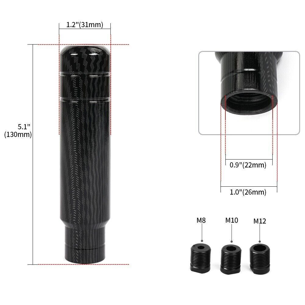SPECIFICATIONS: Type: Gear Shift Knob Material: Aluminum Diameter: 31mm (1.2'') Height: 130mm (5.1'') Thread Size of Adapter: M8, M10, M12 INSTALLATION: 1. Remove the original factory gear knob from shifter. 2. Measure the diameter size of the screw rod. 3. Place the new knob over the shifter and fasten the correct adapter. 3. Make sure the knob is firmly attached. FEATURES: Comes with 3 thread adapters, M8, M10, M12. Easy to install, direct screw on installation. No modification required from stock application so long as thread adapter matches. Improves the look and style of your vehicle. FITMENT : Universal fit for most vehicles so long as threaded adapter matches your vehicle. PACKAGE INCLUDED: 1 x Shift Knob 3 x Adapters All items are Brand New unless stated otherwise on the listing. We sell DIY (Do It Yourself) Items with a few exceptions. We take no responsibility in teaching you how to install. Professional installation is strongly recommended. Payment Delivery details Return Policy About us Contact us Payment We will only ship to eBay confirmed shipping addresses. It is buyer responsibility to provide correct shipping address before purchasing. Buyer is responsible for any reshipping cost due to wrong or undeliverable addresses. Delivery details Items are shipped within 1-2 business days of receiving payment verification. Domestic shipping fees are applied to the lower 48 Continental States only (AK, HI, GU, PR, VI, Base Addresses, may require additional shipping cost) Please e-mail us for a shipping quote. INTERNATIONAL shipping available through eBay's global shipping. But Buyer might pay some VAT and Duties; seller is no responsible with any VAT and Duties. Deliveries are generally done within 3-5 business days nationwide and 10-20 days worldwide. Damaged item due to shipping must reported to us within 48 hours of delivery in order to place claim with shipping company. Return Policy No returns or exchanges once item has been installed, used or modified. We will exchange the item only if is defective or if customer receive the wrong parts. Returns and/or exchanges must be done within 30 days from delivery date. All returns and/or exchanges must be in brand new/uninstalled condition. About us Always Free Shipping with your Parts orders. Lowest price on brand new, in-the-box auto parts. Business time is Monday - Saturday 8:30 am to 5:30 pm HKT except all Holidays. Contact us Always Free Shipping with your Parts orders. Lowest price on brand new, in-the-box auto parts. Business time is Monday - Saturday 8:30 am to 5:30 pm HKT except all Holidays.