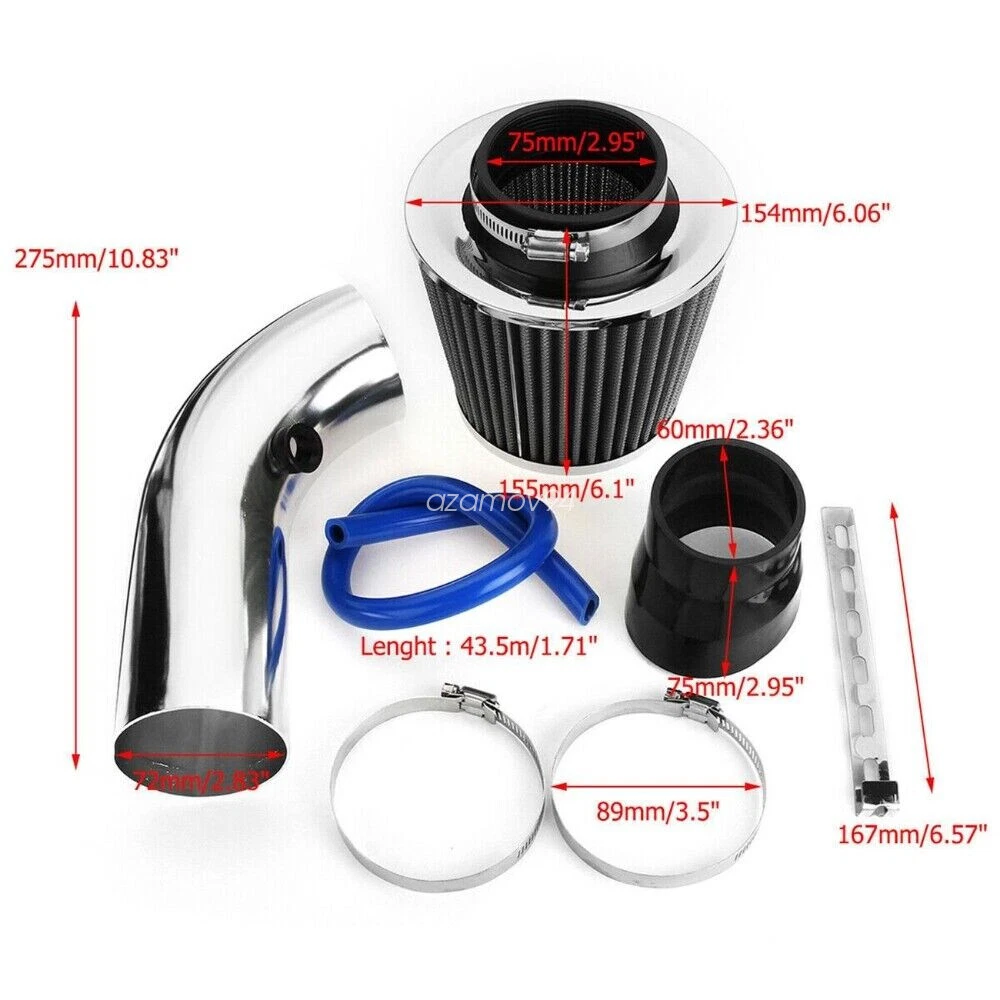 Car Cold Air Intake Filter Induction Kit Pipe Power Flow Hose Universal System Fitment: Universally fit to vehicle with the diameter of air intake hose measures at 76mm/3" or 64mm/2.5"(using inclusive reducer). Also applicable to air intake systems on modified on modified vehicles. Specification: Condition: New Manufacturer Part Number: JU63Q1852 Application: Universal fit for most car, auto, truck etc. Air filter inner diameter: 75mm / 3" Material: aluminum Color: chrome UPC: 6212805830889 Model number: A31852 Product name: air intake kit Length of the mounting bracket: Features: Filter made with dry density fibers for maximum protection from foreign materials entering the engine. Funnel-shaped air filter to direct cold air inward, boost air speed and generate. Optimize throttle response, improve torque and fuel / gas mileage. The aluminum injection pipe coupled with the funnel-shaped air filter allow cold airflow channeling leading to minimal intake turbulence, air speed boosting and, in turn, creating pure horsepower and improving fuel / gas mileage. This air intake kit system is the complete solution to optimize throttle response and generate explosive horsepower output. Installation: Blue hose connected to car vacuum sensor Filter features: High air flow with excellent filtration. Designed to increase horsepower and acceleration. Washable and reusable. Package included: 1 x air intake filter 1 x hose 1 x silicone joiner 1 x tube hose 1 x mounting bracket 2 x clamp Notes: Due to the difference between different monitors, the picture may not reflect the actual color of the item. Please allow 1-2cm difference due to manual measurement and slight color variation for different display setting