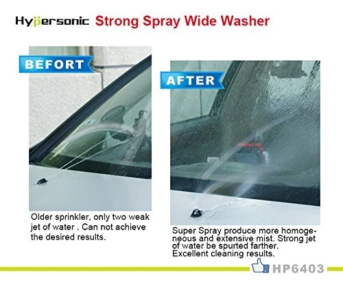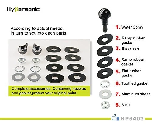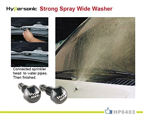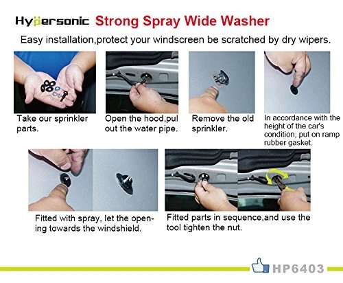 How to use the sprayer 1.Carefully remove existing washer jets(it may be helpful to warm the pipe) 2.Lightly tighten nuts and refit pipes 3.Check spray direction and turn to optimum position 4.If tool low remove jest and re-assemble using tapered washers to raise the angle as shown in diagram 5.When spray pattern correct secure nuts taking care not to over tighten 6. This washer sprayer fits the vehicle which the sprayer is on the hood, but doesn't fit the vehicle that the sprayer hide in the hood. Aluminum material with black finish. The item with small pads, please use them to adjust the angle to get wide sprayed. Produces a wide mist spray for greater windscreen coverage . This windscreen washer nozzle for car that the nozzles are exposed on the hook. The items are small but they can expand the cleaning area of front windshield. The washer sprayer fits the vehicle which the sprayer is on the hood, but don't fit the vehicle that the sprayer hide in the hood.
