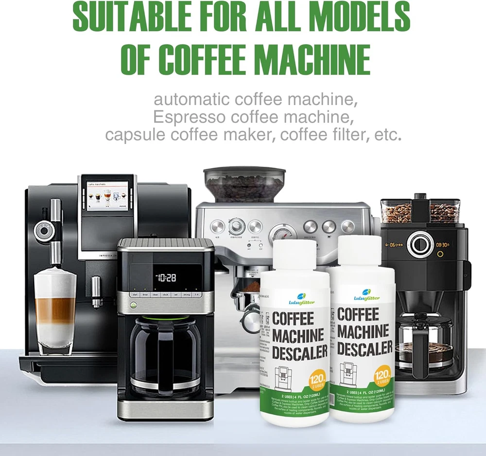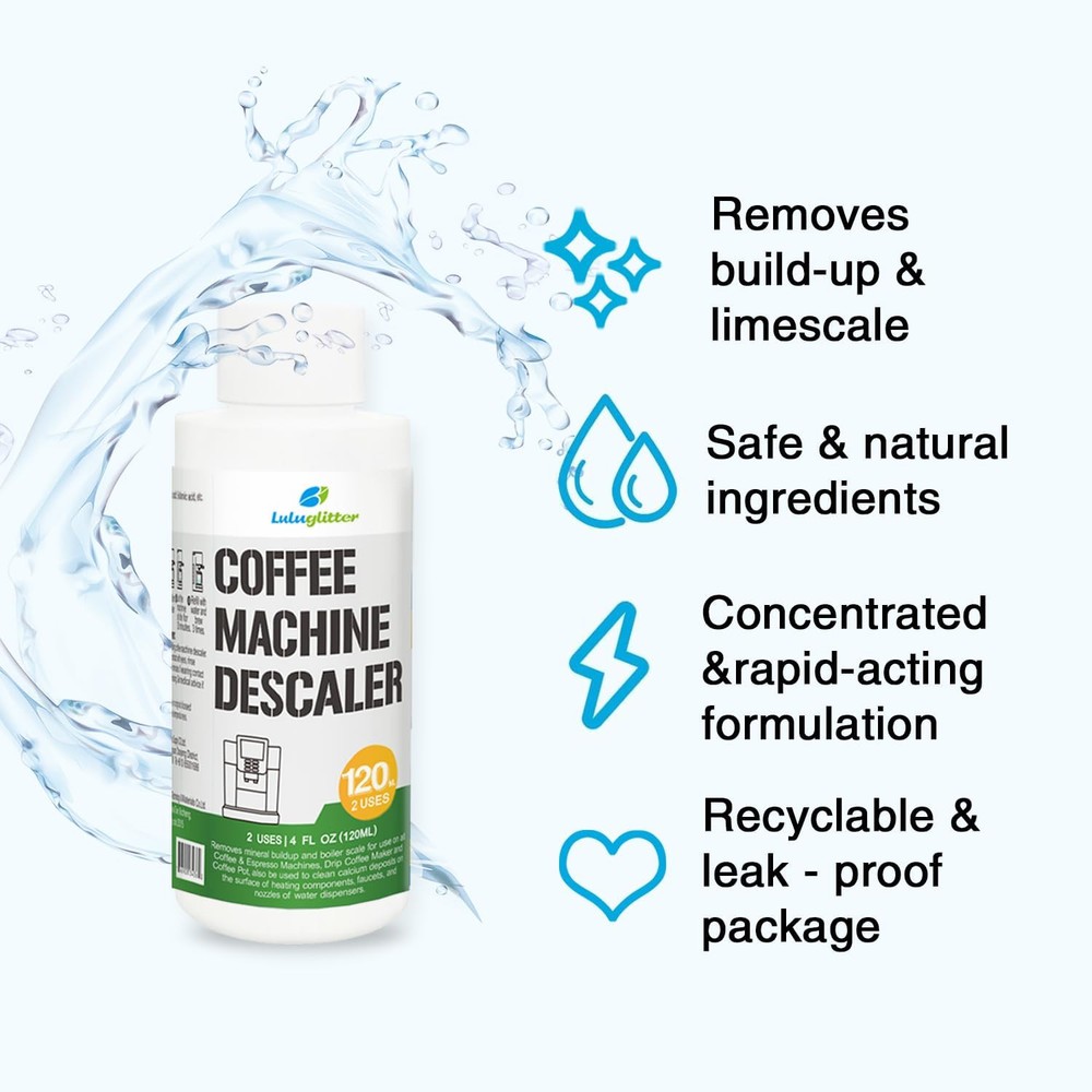 Coffee Machine Descaler, Universal Descaling Solution For Coffee Makers & Espresso Machines,Coffee Maker Cleaner And Descaler, Limescale Remover Product Details Package Dimensions : 5.35 x 3.66 x 1.89 inches; 11.36 ounces Item model number : descaler120 Manufacturer : junjing cleaner Brand: LULUGLITTER Unit Count: 1.0 Ounce Number of Items: 1 Contains Liquid Contents: Yes Manufacturer: junjing cleaner POWERFUL DESCALING SOLUTION: Our coffee descaler and cleaner is a multipurpose solution meant to remove mineral and limescale deposits on a wide variety of machines. It deeply penetrates oil and can work as a decalcifier for other home appliances SAFE For Use: Our coffee maker cleaner and descaler is made from natural concentrated citric acid that is odorless, powerful, and safe for your coffee maker and your family Extend Machine Life – Regular use of our coffee descaler significantly extends the lifespan of your machine. By using our solution, you can keep your coffee maker functioning like new for years Universal Descaling Solution -- Compatible with Keurig, Nespresso, Breville, Delonghi, Jura, Ninja, OXO, Gaggia, and Philips, is eco-friendly and specially formulated to clean your machine safely 2 BOTTLES, 4 USES - This package comes with 2 bottles of descaling solution, for a total of 4 uses. It can be used in any model machines.
