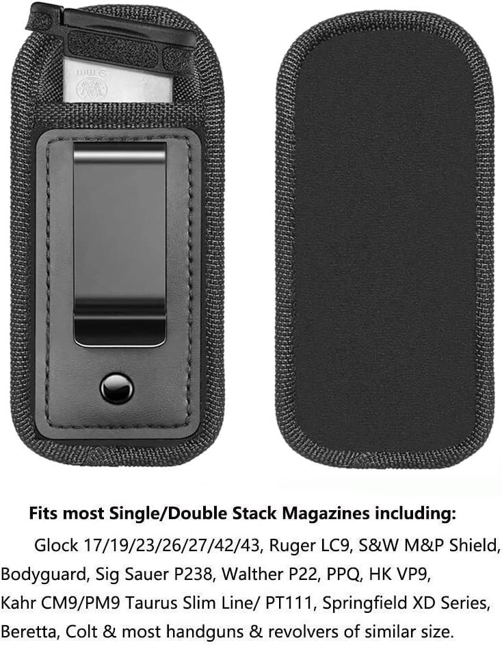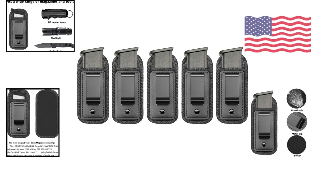 Universal Concealed Carry Mag Holder Pouch Set - Fits Glock, Sig Sauer, and More ‹ › ‹ › ‹ › ‹ › ‹ › ‹ › ‹ › ‹ › ‹ › Universal Concealed Carry Mag Holder Pouch Set -Fits Glock, Sig Sauer, and More Features: Made with soft neoprene and leather for sweat-proof and skin-friendly wear Linen inside for maximum mag protection Secure steel belt clip for concealed carry Fits most Single/Double Stack Magazines including popular brands Set includes 5 PACK magazine holders Best deal for Pistol Mag Pouches Benefits: Comfortable and sweat-proof material Durable and secure steel belt clip for concealed carry Fits a wide range of magazine types Great value with 5 magazine holders included High quality at an affordable price Why choose our Universal Concealed Carry Mag Holder Pouch Set? Looking for a reliable and comfortable way to carry your magazines? Our Universal Concealed Carry Mag Holder Pouch Set is the perfect solution. Made with soft neoprene and leather, it's sweat-proof and easy on the skin, with a secure steel belt clip for concealed carry. It fits a wide range of magazine types and comes in a set of 5 for a great value. Don't settle for less - choose our high-quality mag holder pouch set for all your concealed carry needs. Order your Universal Concealed Carry Mag Holder Pouch Set today and experience the difference! Shipping Free & Fast Shipping - We offer free shipping to most of the USA with a normal delivery time of 3-7 days. However, due to the current situation, additional delivery time (up to 3 weeks) may be required for some items. Alternative Carriers - We may use alternative carriers (e.g. USPS, FedEx, UPS, etc.) to ensure your package arrives safely and on time. Due to the use of multiple carriers, we are unable to provide a tracking number automatically. Handling Time - Orders are processed and shipped within 1-2 business days of receiving cleared payment. Shipping Restrictions - Shipping to Alaska, Hawaii, Puerto Rico, Guam, and other US territories may incur shipping charges or delivery restrictions. Please contact us before ordering, or your order can be refunded/cancelled. State Restrictions - There may be restrictions based on your state of purchase. For example, certain items may not be shipped to California due to state regulations. Contact for Tracking Updates - If you require tracking updates or have any concerns about the delivery of your order, please feel free to contact us, and we will be happy to assist you. Return 30-Day Hassle-Free Returns - We want you to be completely satisfied with your purchase. If you are not, you can return the item within 30 days of receiving it for a full refund or exchange. Easy Return Process - To start a return, simply contact us and we will provide you with a prepaid return shipping label and detailed instructions. Restocking Fee - There are no restocking fees for returns. However, the buyer is responsible for return shipping costs if the return is not due to a seller's error. Refund Processing Time - Refunds will be processed within 5 business days of receiving the returned item in its original condition. Payment We accept all major credit cards, PayPal, and Apple Pay for your convenience. Your payment information is secure and encrypted to ensure a safe and seamless transaction. Please complete your payment within 3 days of purchase to avoid any delays in shipping. Feedback Your feedback is extremely important to us. We strive to provide the best products and customer service possible. If you are satisfied with your purchase, please take a moment to leave us a positive review. If you have any concerns or issues with your order, please contact us before leaving negative feedback. We are committed to resolving any problems and ensuring your satisfaction. Contact Us If you have any questions or concerns, please feel free to reach out to our customer support team. You can contact us through the eBay messaging system. We are available Monday to Friday, 9:00 am to 5:00 pm EST, and we will do our best to respond to your inquiry within 24 hours. Thank you for supporting our small family business!