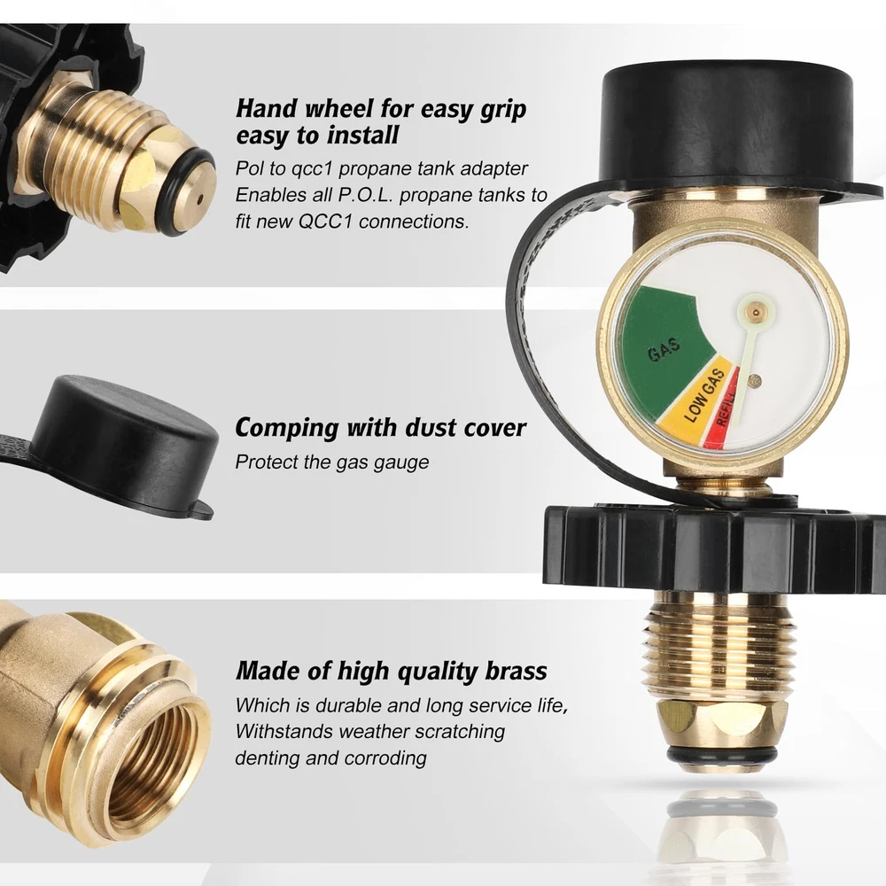 【Fluorescent Pointer】The pointer of this 100 lb propane tank gauge is made of fluorescent material, you can clearly know the propane level of the propane tank in dark environment. The rotatable gauge allows the gauge to be in a position suitable for reading. (Tips: This propane tank gauge 100lb only provides a reference interval and it is not accurate to every pound.) 【Role and Function】The upgraded pol to qcc1 adapter converts your large propane tank's POL connection to QCC Type1 & POL connection, It offfers both types of connections for your propane tank. It is more convenient for daily use by using this pol propane tank gauge. 【Packing list】Propane adapter pol to qcc1 X 2, dust cover X 1. This pol to type 1 propane adapter is equipped with an handwheel, you just need to tighten the propane tank adapter by the handwheel and then you can put it into use, tools is no need. (tips: before starting to use, please make sure the installation is correct, no gas leakage) 【Preferred Material】The propane tank refill adapter pol lp tank valve to qcc1 kit is made of 100% solid brass with high strength and hardness, so it can withstand harsh weather and hot and cold changes, dent corrosion, scratches, etc. It will provide you with long term secure connection, more worry free.