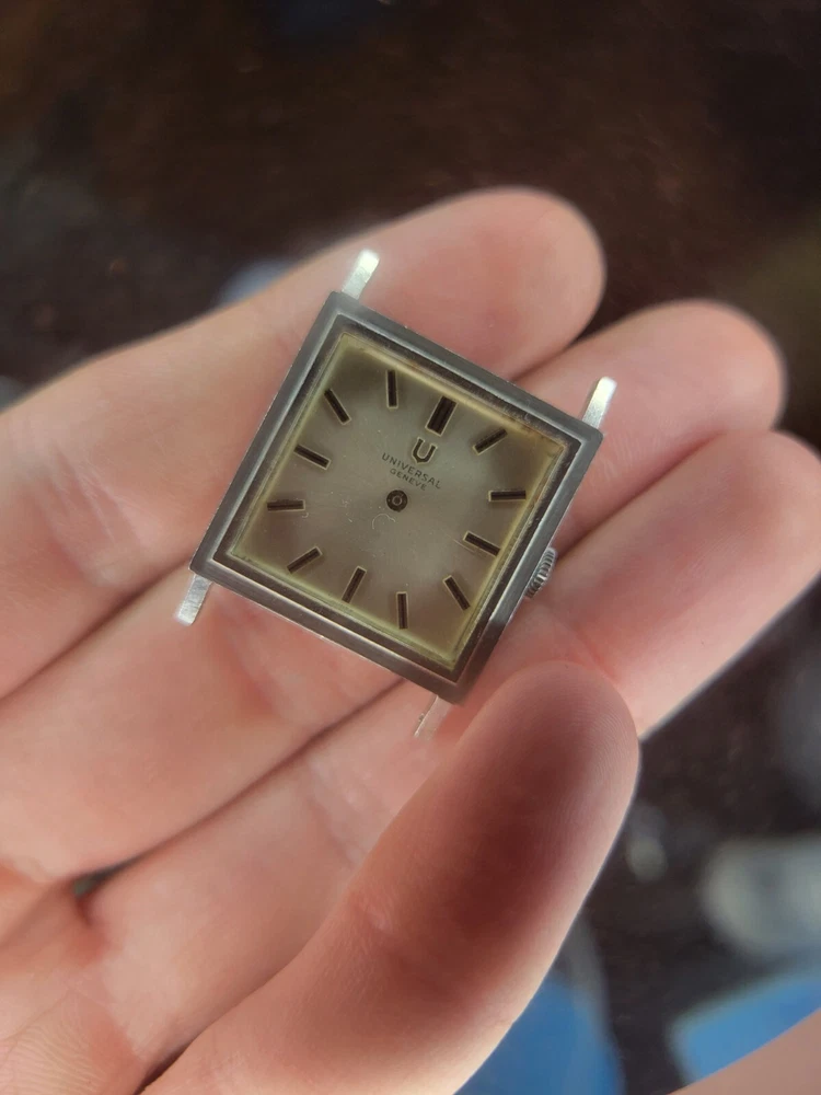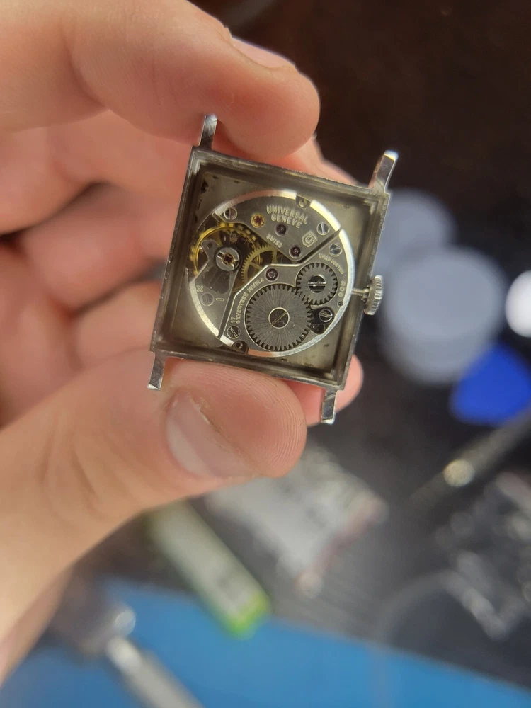 Universal Geneve Cal. 800 Movement, Dial And Case. The movement has a working balance that does engage with the escapement wheel, but no other gears work that would indicate that it works functionally. That being said it comes with a dial and it's case.