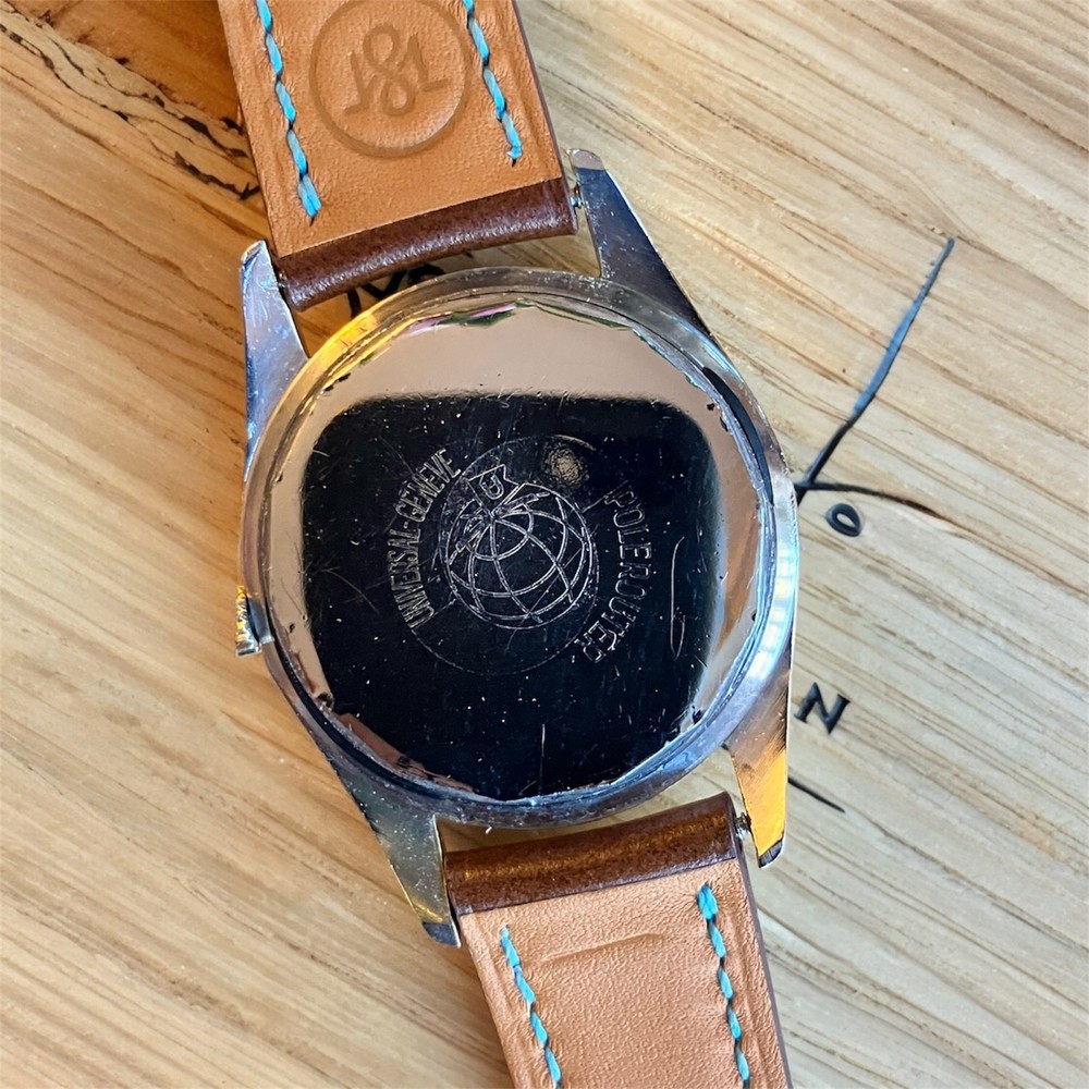 Universal Geneve Polerouter Date with micro-rotor automatic in-house manufacture movement made in Switzerland, 1960s with patented case design gold plated, Leather cordovan strap with monogram buckle, cream color dial for Polerouter models with ring on side with marking for hour marks. Generic Plexiglass. Most iconic swiss watch of 1960 designed by most famous swiss watch designe Mr. Geral Genta and with the first microrotor automatic movement in world.