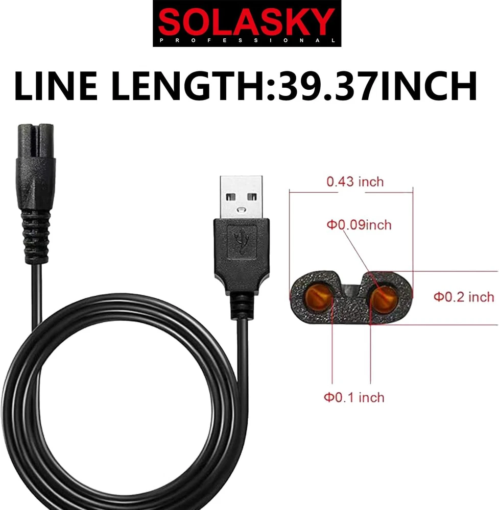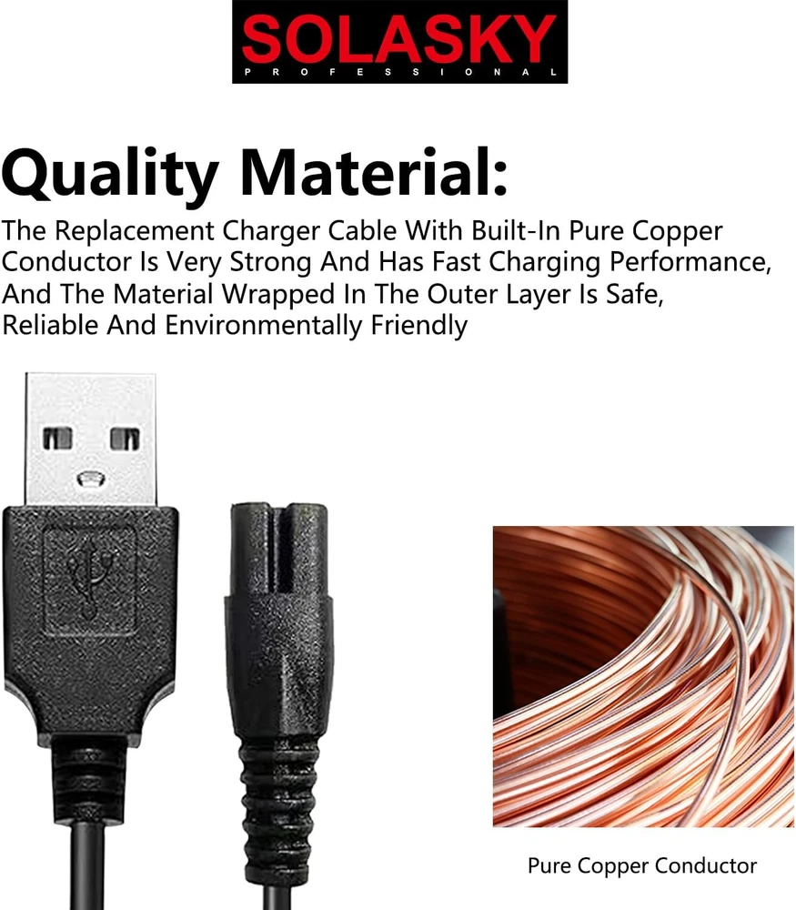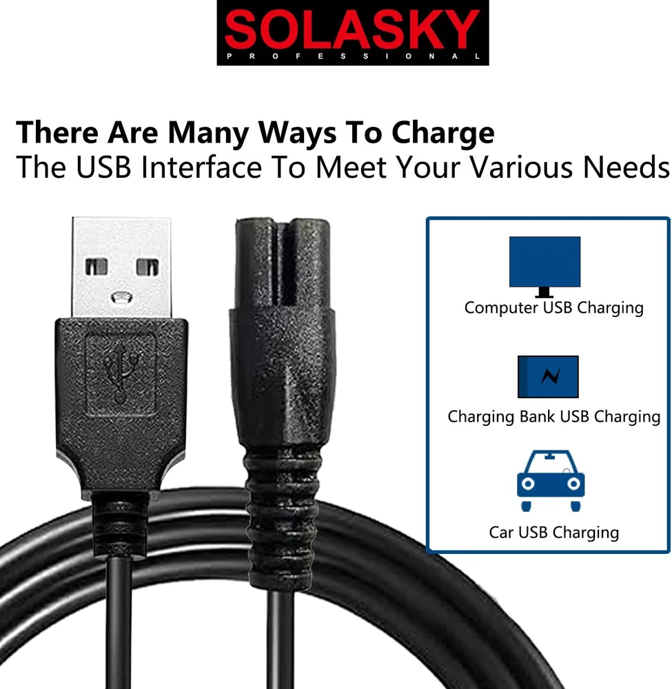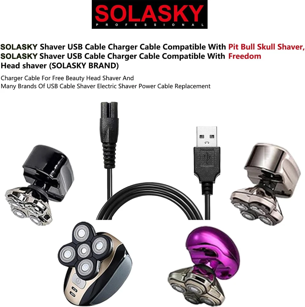 SOLASKY USB Charging Cable Compatible with Skull Shaver, SOLASKY USB Charging Cable Compatible with Freebird (Only showing compatibility, not Freebird brand, The Cable Brand is SOLASKY) , USB Charging Cable ,SOLASKY Head shaver Power Cord Compatible with Freedom Shaver ( The Cable Brand is SOLASKY), Charger cord USB Cable Shaver Power Cord. (Before purchase, please compare the interface of charging cable and shaver to avoid buying the wrong model.) ★ Universal Connectivity ★: The 5V USB charging cable for the electric shaver is a versatile accessory that can be connected to any USB power source, such as a computer, laptop, or wall adapter. This universal compatibility ensures that users can easily charge their shaver whenever and wherever it is needed, without the need for a specific power outlet or bulky power adapter. Buckle the same head shaver models, can be used. At present, it is compatible with many brands. SOLASKY charger cord USB Cable Compatible with hontec shaver charger, AidallsWell**, Vifyci*, Rozi*, Roziap**, Roziahom* shaver....., Notes: Any brands mentioned above are just applied to show the compatibility, our brand is SOLASKY . Replacement charging line is approx. 39.37 inches. Packing include: 1 pcs electric shaver power cord (electric shaver not include) ★ Durable and Reliable ★ : The USB charging cable is made with high-quality, durable materials that are designed to last. It is resistant to common issues such as fraying and bending, ensuring that it remains functional for a long period of time. This reliability reduces the need for frequent replacements and provides better value for the user. ★ Safety Features ★ : The electric shaver's USB charging cable is equipped with multiple safety features to protect both the device and the user. It includes protection against overcharging and overheating, which can potentially damage the shaver's battery or pose a safety risk. These features ensure that the charging process is safe and the device's longevity is preserved. Product Description SOLASKY Universal Head Shaver Power Charger Cord Compatible with FREEDOM Skull Shaver (Charger Cord is SOLASKY Brand) Buckle the same head shaver models, can be used. At present, it is compatible with many brands. SOLASKY charger cord USB Cable Compatible with Freedom head shaver,BIRD ,SKULL SHAVER , hontec shaver charger, AidallsWell**, Vifyci*, Rozi*, Roziap**, Roziahom* shaver....., Notes: Any brands mentioned above are just applied to show the compatibility, our brand is SOLASKY .