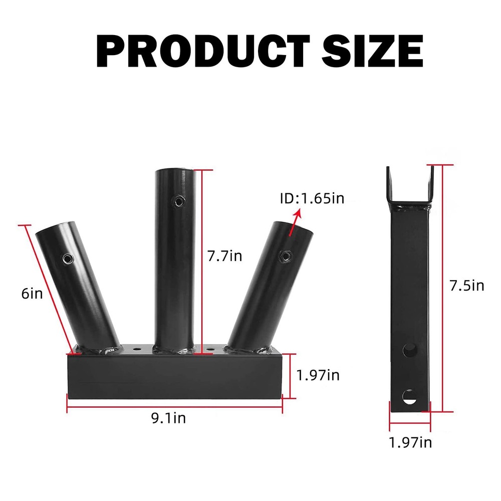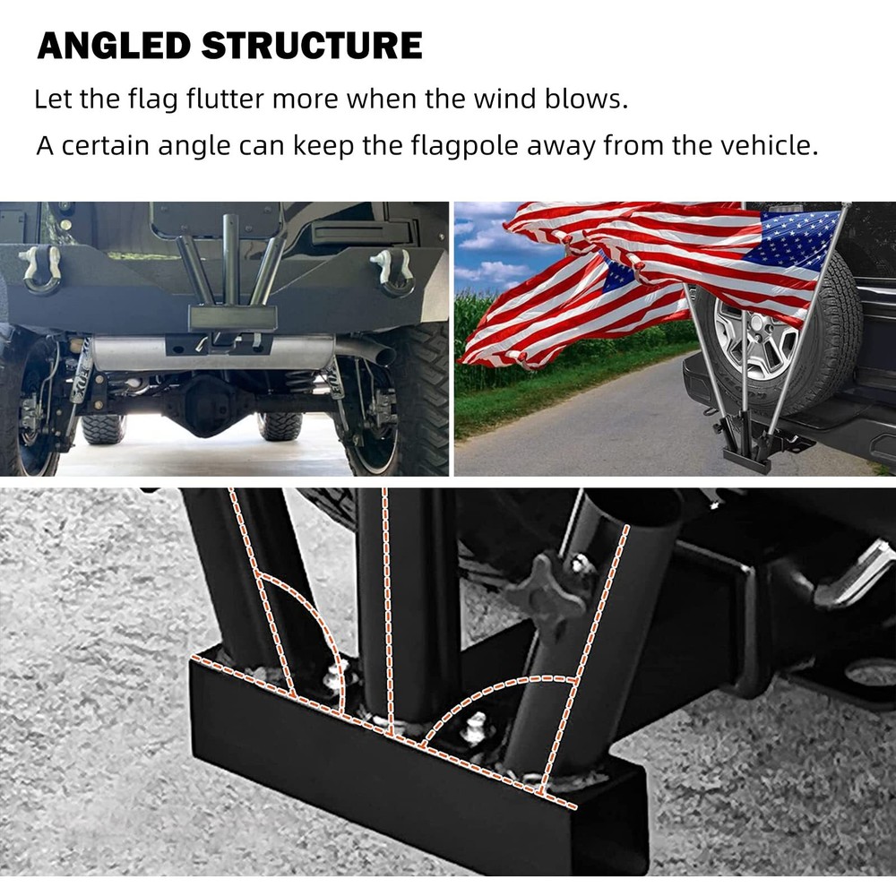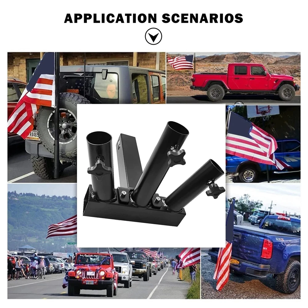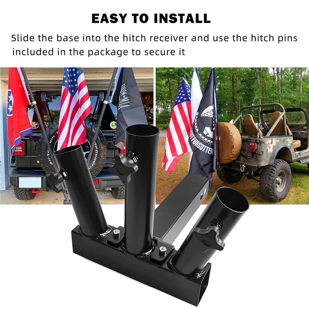 Universal Hitch Mount Flagpole Holder - 3 Head Trailer Hitch Flag Pole Holder ✔Product Details: Flag Pole holder(3 Head) ✔Colour: Black ✔Compatible for any vehicle with standard 2"hitch receiver, The flagpole holder is suitable for poles with a max diameter of 1.5". ✔Great for SUV, RV, Pickup, Truck, Camper, Trailer, etc. Features: 💎 1.The flag mount truck comes with 3 durable tightening screw knob and the angled holder could make the flag more fluttering. 💎 2.This High-quality flag holder features a design that securely holds up to 3 flags, ensuring you never have to leave your passion on the flagpole at home. 💎 3.Use premium steel material, good rigidity and stability. The surface is coated with a black oxide layer, strong and durable, anti-corrosion and anti-rust, anti-deformation and anti-impact for long-lasting reliability. 💎 4.Simple easy installation. Design with hand knob tightening screws, just insert mount into the hitch receiver and lock into place using the hitch pin. 🍏 How To Install: ➀.Slide the bracket into the hitch receiver. ➋.Put the plug through the hitch receiver and hitch mount flagpole holder. ➂.Locked the base onto the receiver with an snap pin. ➍.Put the Flag Pole into to the hitch mount flagpole holder. ➄.Adjust the height of Flag Pole, then tighten the screws. ➏.Finish the installation, NO tools required. Tips If there is a spare tire where the flagpole holder is installed, it is recommended to install an extra 2 inch hitch extender (purchased by yourself), so that the spare tire will not block the flagpole mount. An extra hitch tightener (purchased by yourself) can help you secure the connection between the flagpole holder and the hitch receiver on your vehicle. Package Contents: 1 x Hitch mount flag pole holder(3 Head) 1 x Hitch pin 3 x Plum Screw - Your Professional Tool House PREMIUM MATERIAL - Flag pole holder is made of heavy duty steel and rust-resistant powder coating, with a Drain-off Hole on the bottom to drain away raindrops or melt snow, better enhance longer lifespan.The flagpole holder has been upgraded, it can fix up to 3 flags, and come with 3 durable tightening screw knob, which is safe and practical. SCOPE OF APPLICATION - Camper rv hitch mount flagpole holder fit for standard 2 inch receiver, including SUV, RV, Pickup, Truck, Camper, Trailer, etc. If there is a spare tire where the flagpole holder is installed, it is recommended to buy another extender. This way the spare tire will not block the flagpole mount. The flagpole holder is suitable for poles with a max diameter of 1.5". EASY INSTALLATION - Flexible to use,slide the mount into the hitch receiver, and then fix it with the hitch pin in the package. After the flagpole is inserted, it can be fixed by tightening the plum screw without using any tools. PACKAGE INCLUDING - Car receiver flag pole mount come with 1 x Hitch Mount Flagpole Holder, 3 x Plum Screw, 1 x Hitch Pin. Firmly holds your national flag, team flag or other thing you want to display, perfect for showcase your character/passion with a big flag in car show, sport event, off-road races, travel, family vacation, etc. - Universal fitment 3 trailer hitch flagpole holders for any vehilcle with standard 2" hitch receivers. We offer a 12-month , feel free to us with any questions.