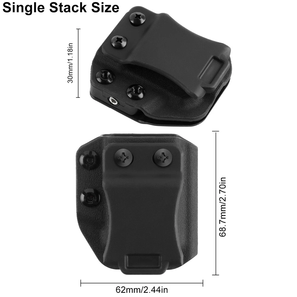 Product Description Ambidextrous gun mag pouch for right/left side carry and usable in IWB/OWB for concealed carry. Use the included Allen key to obtain your preferred tension of your pistol mag in the magazine holster. For .380 Single Stack magazine case Made in the U.S.A. with a lifetime warranty Features: left and right universal 100% and NEW Weight: 48g Size: 68.7*62*30mm Payment Shipping Terms Returns Contact Us We accept PayPal only. If buyer want to delay the payment because of financial problem, please contact me by the ebay message within 3 days Payment via PayPal (PayPal accepts all major credits/debit cards and eCheque) ECheque payment will tak e 3-10 days to get clear, thus DELAYing the shipment. Handling time: 1 business day (Orders are not processed on weekends & holidays) Tracking information will be sent once item is shipped. Local pick-up is unavailable at the moment. For international shipping and shipping to Guam, Hawaii and Alaska, Please contact us before placing the order. Item is shipped to ebay address. Leaving correct address can minimize delay. For any issues with Defects, Return, Item Exchange request, please contact us first and send us a message first before opening any type of case or request. We devote ourselves making EVERY CUSTOMER in 100% Satisfactory and resolve any problem. We highly value and appreciate your business. Thank you. No returns will be accepted without an RMA number. Please contact us for the RMA number. Return is acceptable within 30 days of delivery. Return for replacement or money back is optional. Returned items must be in the brand new, unaltered and resalable condition. Seller is not responsible for any labor cost, expense in a dealer store, or damage due to wrong installation. Return is accepted within 14 days after the buyer's receiving the item. (Excluding contrived damagement or misusage).100% money-back Guaranteed! All product will be tested in 100% before delivery.If the item is defected by the processing of postage,Buyer has up to 14 days from date of receipt for exchange of a new one.All shipping charges for returned products are to be paid by the buyer,Please contact us for the return address All messages will be answered within 24 office hours. Please contact us either by clicking "contact seller" in the "purchase history" section or simply click "ask a question" at the bottom of this page. If you are unsatisfied with our item or service, please contact us before leaving any feedback. We are committed to resolve all issues in a friendly and satisfactory manner. We always reply to messages within 2 business days (off-duty at weekend). If you do not get a response from us, then please check your junk or spam mailbox. Payment We accept PayPal only. If buyer want to delay the payment because of financial problem, please contact me by the ebay message within 3 days Payment via PayPal (PayPal accepts all major credits/debit cards and eCheque) ECheque payment will tak e 3-10 days to get clear, thus DELAYing the shipment. Shipping Handling time: 1 business day (Orders are not processed on weekends & holidays) Tracking information will be sent once item is shipped. Local pick-up is unavailable at the moment. For international shipping and shipping to Guam, Hawaii and Alaska, Please contact us before placing the order. Item is shipped to ebay address. Leaving correct address can minimize delay. Terms For any issues with Defects, Return, Item Exchange request, please contact us first and send us a message first before opening any type of case or request. We devote ourselves making EVERY CUSTOMER in 100% Satisfactory and resolve any problem. We highly value and appreciate your business. Thank you. No returns will be accepted without an RMA number. Please contact us for the RMA number. Return is acceptable within 30 days of delivery. Return for replacement or money back is optional. Returned items must be in the brand new, unaltered and resalable condition. Seller is not responsible for any labor cost, expense in a dealer store, or damage due to wrong installation. Returns Return is accepted within 14 days after the buyer's receiving the item. (Excluding contrived damagement or misusage).100% money-back Guaranteed! All product will be tested in 100% before delivery.If the item is defected by the processing of postage,Buyer has up to 14 days from date of receipt for exchange of a new one.All shipping charges for returned products are to be paid by the buyer,Please contact us for the return address Contact Us All messages will be answered within 24 office hours. Please contact us either by clicking "contact seller" in the "purchase history" section or simply click "ask a question" at the bottom of this page. If you are unsatisfied with our item or service, please contact us before leaving any feedback. We are committed to resolve all issues in a friendly and satisfactory manner. We always reply to messages within 2 business days (off-duty at weekend). If you do not get a response from us, then please check your junk or spam mailbox. powered by