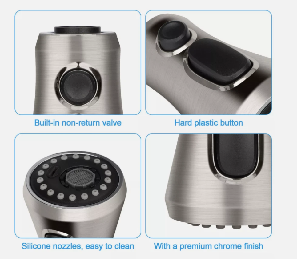 1. This spray head replacement is a game-changer! The ABS plastic and chrome finish make it sturdy and stylish, while the 9 adapters ensure it fits most major brands. The pull-down function is smooth, and the water pressure stays strong—perfect for rinsing dishes or filling pots. Easy to install, and the rust-resistant design means it’ll last. Highly recommend for an affordable, high-quality upgrade!