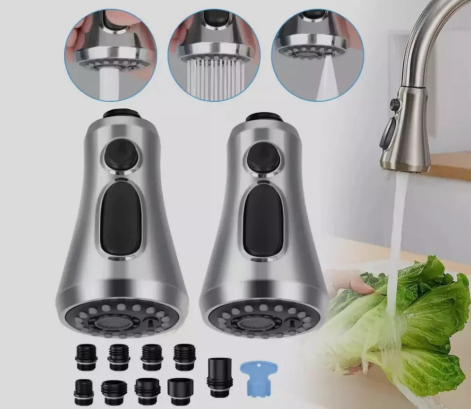 Style: Modern Suitable For: Kitchen Sink Type: Pull-out Faucet Brand: Unbranded UPC: Does not apply gtin13: Does not apply Colour: Brushed Nickel Model: Kitchen Faucet Features: 3-Function, Pull-Out, Quick Cleaning, with 9 Adapters Material: Engineering-grade ABS plastic