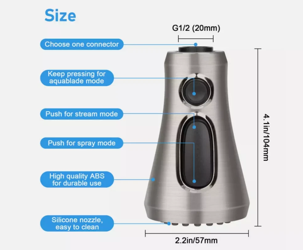 Product Feature : 【Premium Quality】 Crafted from high-grade ABS plastic with a premium chrome finish, our pull-down faucet spray head ensures durability and rust resistance, providing everyday convenience for various rinsing and filling needs. 【9 Different Adapters】 Our faucet spray head replacement includes 9 adapters, catering to various connections. Compatible with major brands of faucet hose connectors such as Moen, Delta, AquaSource, Kohler, Hansgrohe, Grohe, and so on. Please note that it is not compatible with most Pfister or Glacier Bay hoses. 【3-Mode Spray Options】 Enjoy three water modes: stream, spray, and aquablade. The aquablade mode provides powerful flushing to remove food debris. Easily switch between water modes with the push of a button. 【Removable & Washable Faucet Aerator】 We provide a free aerator key for easy removal or replacement of the faucet aerator for cleaning purposes. The interior multi-mesh aerator ensures a quiet, no-splashing aerated stream, filtering out most impurities. Cleaning the aerator ensures a continuous flow of clean water. 【Easy to Install】 Installation is a breeze! No tools required. In just minutes, unscrew your old faucet head and replace it with our new one for immediate use. Product Specification: Type: Pull Down Faucet Material: Engineering-grade ABS plastic Outer Diameter: G1/2 (20mm) Connection: G1/2 Male Thread, 5/8-16 UN, 5/8-18 UNF,4 Male Thread(17.1mm, 16.4mm, 15.5mm and 14mm) Overall Height: 4.09". (104 mm) Max. Width: 2.24". (57 mm) Package Included: 1 x Faucet Spray Head 9 x Connectors 1 x Aerator Key Tool Shipping * All items are in US warehouse and will be dispatched within 24 hours after receipt of payment. Please note that items purchased on weekends and Bank Holidays will be dispatched on the next working day. * It usually takes 3-5 working days for the delivery. But, the transit time is highly depend on Postal Service after we dispatched.If you have any problems, please feel free to contact us. * We ship items to your eBay confirmed address only. Please make sure your address on eBay is matched with your shipping address before you pay. * We are unable to take any responsibility for wrong address, any custom delay or tax. Returns * If the item can't works fine, please check twice to confirm that the item is defective, and contact our customer service representative asap let's know the detailed problem, we will do our best to server you. * If the package damaged during the freight, please refuse to sign for the package and return to us, then contact us promptly. * All of the Non-Seller mistake returns for refund are subject to 20% re-stock fee. And buyer should pay for the return shipping fee.(E.g choose the wrong size or wrong item) * We only accept the original package. Please make sure the item have No man-made sabotage. If you purchased in improper condition, please Note that the shippping and handling fee will not be refunded, all return shipping fee should paid by the buyer unless item DOA. * Guaranteed to Not be DOA and 100% working. Warranty covers replacement or repair. * Buyers are responsible for part return shipping fees on return package. * We reserve the right to refuse any returns for objective reasons. Contact Us * If you are dissatisfied for any reason, please don't leave negative/neutral feedback without asking. We work hard to make sure EVERY CUSTOMER 100% SATISFIED and resolve any problem for you. We always l eave positive feedback to all our customers. * If you are satisfied with the product you received,please leave us Positive Feedback and 5 Scores DSR * We are strive to providing 100% satisfaction services for our customers. Your satisfaction is our greatest pursuit. Positive Feedback is very important to us! Thank you!