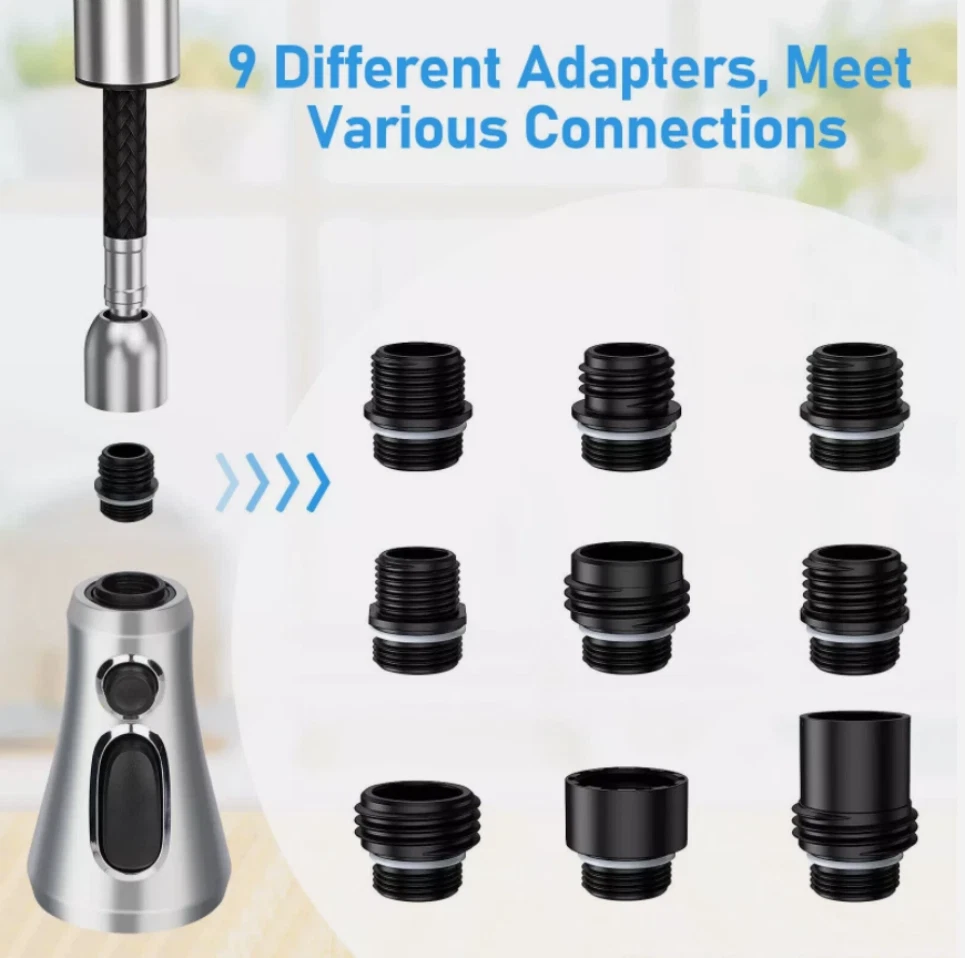Type: Pull-out Faucet UPC: Does not apply Material: Engineering-grade ABS plastic Model: Kitchen Faucet Colour: Brushed Nickel Suitable For: Kitchen Sink Features: 3-Function, Pull-Out, Quick Cleaning, with 9 Adapters Style: Modern Brand: Unbranded gtin13: Does not apply