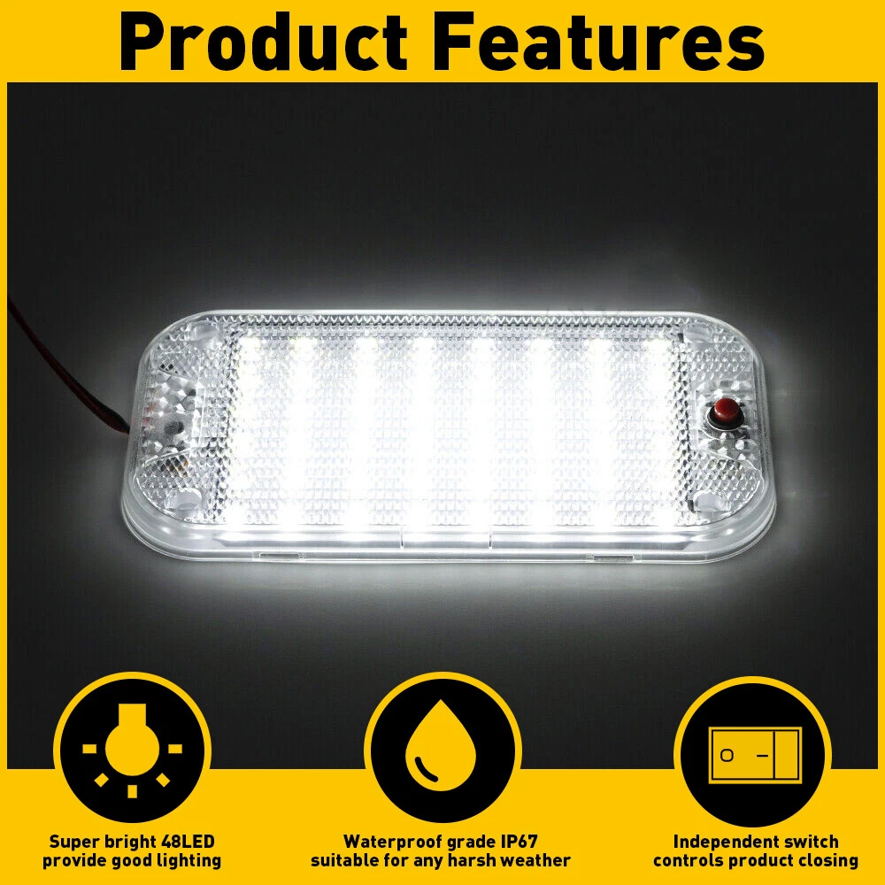 Specification: Waterproof IP: IP67 LED quantity: 48LED Light color: white Service life:50000h Voltage:12-85v Power: 10 w Suitable for: fit for 12 volt to 85 volt vehicle. Such as cars/RVs/trailers/camper/boats. Features: *High-brightness and Comfortable Light Source Super bright light with 48LED natural white color gives a better lighting for safety guarantee. *Simple installation Simple and convenient installation. It can be punched or use double-sided adhesive for installation. *IP68 waterproof Prevent from water, snow, moisture, rusting and dust, don't worry about leak inside problem. *Special material Universal RV Interior Car Vehicle Indoor Roof Dome Ceiling Light White Lamp Specification: Waterproof IP: IP67 LED quantity: 48LED Light color: white Service life:50000h Voltage:12-85v Power: 10 w Suitable for: fit for 12 volt to 85 volt vehicle. Such as cars/RVs/trailers/camper/boats. Features: *High-brightness and Comfortable Light Source Super bright light with 48LED natural white color gives a better lighting for safety guarantee. *Simple installation Simple and convenient installation. It can be punched or use double-sided adhesive for installation. *IP68 waterproof Prevent from water, snow, moisture, rusting and dust, don't worry about leak inside problem. *Special material The aluminum alloy base with high transmittance PC light cover ensures the long service life and durability of the product. *Independent switch control Easy to open and close at any time, safe and convenient Packaging include: Dome light*2 screw*8 Double-sided Tape*2 Item Specifics Brand Unbranded Performance Part Yes Brand Unbranded Lighting Technology LED Suitable For Dome Light Light Color Cold White Type Light Bulb Voltage 12-85v Service life 50000h Universal Fitment Yes LED quantity 108 LED Waterproof IP IP67 Manufacturer Warranty 1 Year Packaging include Dome light *2 Number of Bulbs 48LED Wattage 10 W Payment We can accept payment by credit, debit, and gift cards; Apple Pay, Google Pay, PayPal, and PayPal Credit. Shipping 1. All items will be shipped in 24 hours after receiving your payment . 2. We ship this item to US only via USPS first class mail. It usually takes 3-5 working days to deliver. Returns 1. We offer 60 days return policy. 2. Please contact us within 60 days from the date you receive your package if you have any questions with the products . 3. Refund will be sent after we got your returned package. 4. All returned items should be in the original packaging with tracking number. Contact Us We work from Monday - Saturday 9:00AM - 6:00PM PST, but we will reply you once we get your message .There will be some delay on response if you send message or E-Mail on Sunday. DESCRIPTION PAYMENT SHIPPING RETURN POLICY CONTACT US Hot item Help & Info Payment Policy Shipping Policy Return Policy FAQ About Us Universal RV Interior Car Vehicle Indoor Roof Dome Ceiling Light White Lamp Specification: Waterproof IP: IP67 LED quantity: 48LED Light color: white Service life:50000h Voltage:12-85v Power: 10 w Suitable for: fit for 12 volt to 85 volt vehicle. Such as cars/RVs/trailers/camper/boats. Features: *High-brightness and Comfortable Light Source Super bright light with 48LED natural white color gives a better lighting for safety guarantee. *Simple installation Simple and convenient installation. It can be punched or use double-sided adhesive for installation. *IP68 waterproof Prevent from water, snow, moisture, rusting and dust, don't worry about leak inside problem. *Special material The aluminum alloy base with high transmittance PC light cover ensures the long service life and durability of the product. *Independent switch control Easy to open and close at any time, safe and convenient Packaging include: Dome light*2 screw*8 Double-sided Tape*2 Payment Shipping Returns Contact Us We can accept payment by credit, debit, and gift cards; Apple Pay, Google Pay, PayPal, and PayPal Credit. 1. All items will be shipped in 24 hours after receiving your payment . 2. We ship this item to US only via USPS first class mail. It usually takes 3-5 working days to deliver. 1. We offer 60 days return policy. 2. Please contact us within 60 days from the date you receive your package if you have any questions with the products . 3. Refund will be sent after we got your returned package. 4. All returned items should be in the original packaging with tracking number. We work from Monday - Saturday 9:00AM - 6:00PM PST, but we will reply you once we get your message .There will be some delay on response if you send message or E-Mail on Sunday. All rights reserved. On Feb 6, 2025 at 13:03:16 PST, seller added the following information: