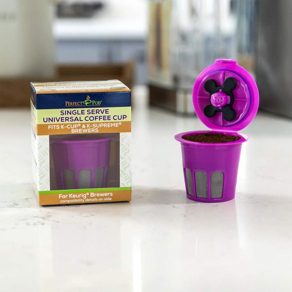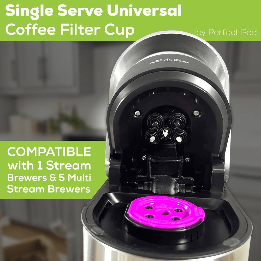 Universal Compatibility! Take the guesswork out of reusable, this cup is designed to work with both 1-Stream and Multi-5 Stream Single Serve Brewers, so you don't need any extra parts or adaptors. Constructed from high-quality BPA-free plastic and durable stainless mesh for long-lasting durability. The Single Serve Universal Reusable Coffee Filter Cup is compatible with the Keurig 1.0, 2.0, K-Mini, and K-Supreme brewers & more! (See Compatibility Graphic). Feel confident that your purchase is 100% Satisfaction Guaranteed! Get brewing today with Perfect Pod's Universal Coffee Cup. Save Money, Enjoy Better Coffee, & Reduce Waste with Perfect Pod. Make the switch to reusable and Save Money, Reduce Waste, and enjoy a Better Cup of Coffee. Universally Compatible works Keurig 1-Stream Brewers (Keurig 1.0, 2.0, K-Mini, K-Elite, K-Duo & More) and Multi-Stream Technology (5-stream) Brewers (K-Supreme, K-Slim, K-Supreme Plus & more). See compatibility graphics in photos for full. No extra parts or adaptors are required - simply fill, place, and brew. Constructed from high-quality materials. BPA-free plastic with durable stainless-steel mesh for brew after brew. Easy to fill, use & clean - top rack dishwasher safe.