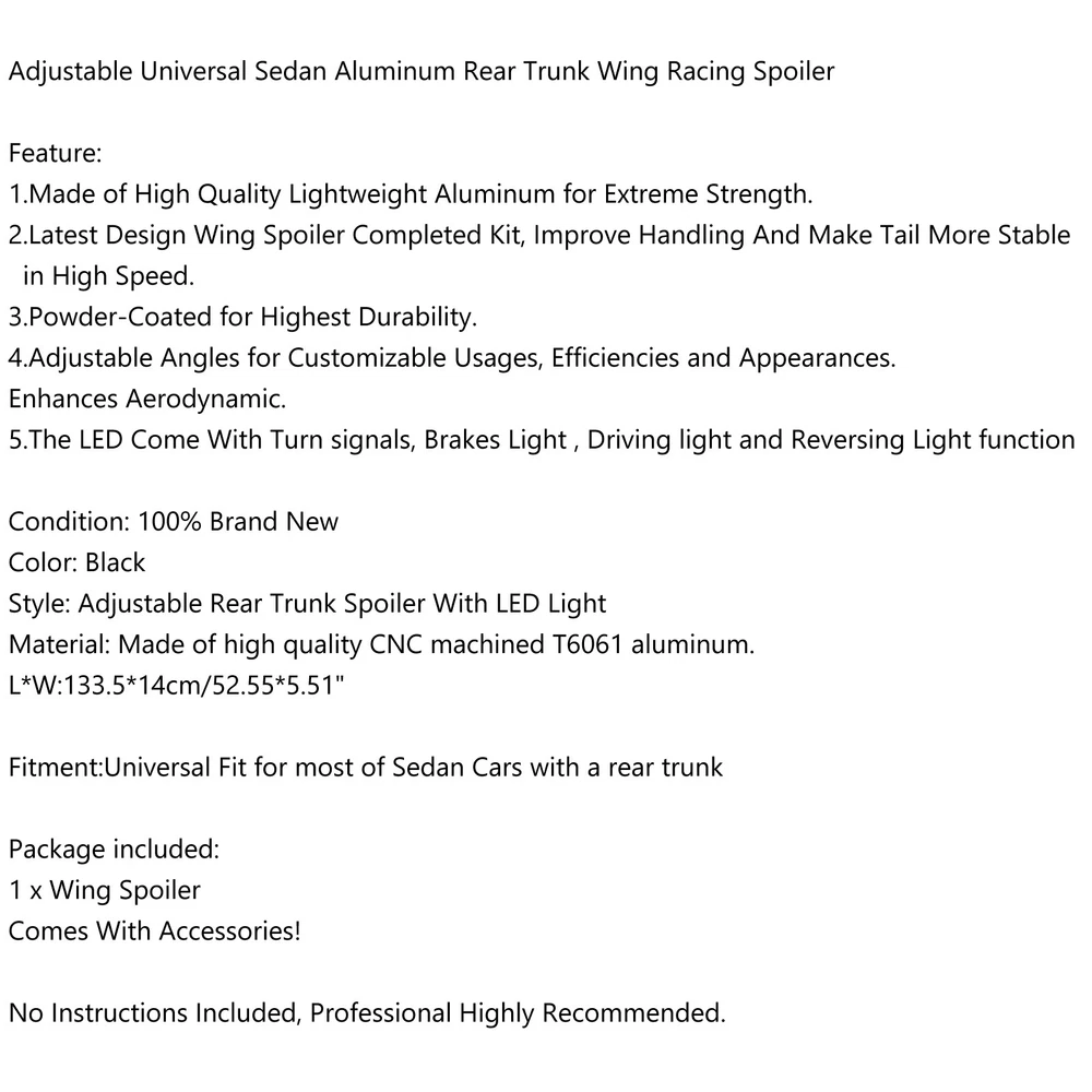You may also like Universal Sedan Aluminum GT Rear Trunk Wing Racing Spoiler With Red Light S #E1 74.85 USD Free shipping M3 Style Rear Trunk Spoiler Wing Fit BMW 3 Series F30 F35 2012-2019 Gloss Black 53.85 USD Free shipping Adjust 53" No Drilling GT Rear Truck Wing Racing Spoiler Aluminum Universal BLK 75.85 USD Free shipping 57" 145cm Universal Racing GT Style Down Force Trunk Spoiler Wing Glossy Black 139.85 USD Free shipping Black Rear Roof Spoiler Wing Fit Volkswagen VW Golf 7 MK7 7.5 GTI R 2014-2018 44.85 USD Free shipping P Style Rear Trunk Spoiler Wing Fit BMW 3 Series F30 F35 2012-2019 Gloss Black 53.85 USD Free shipping Universal Mini Spoiler Car Auto Tail Decoration Spoiler Wing Carbon Fiber 10.85 USD Free shipping R style Rear Roof Cover Spoiler Wing Diffuser Fit 16-21 HONDA CIVIC 10th Sedan 54.85 USD Free shipping Universal Adjustable Lightweight GT Aluminum Rear Trunk Wing Racing Spoiler 82.85 USD Free shipping Universal Sedan Aluminum GT Rear Trunk Wing Racing Spoiler With Red Light B #E2 82.85 USD Free shipping Glossy Black Rear Window Roof Spoiler Fit Toyota Camry LE SE XSE XLE 2018-2024 57.85 USD Free shipping Glossy Black Rear Spoiler Wings Fit For Toyota Camry LE SE XSE XLE 2018-2024 18 94.85 USD Free shipping Adjustable Universal Sedan Aluminum Rear Trunk Wing Racing Spoiler Feature: 1.Made of High Quality Lightweight Aluminum for Extreme Strength. 2.Latest Design Wing Spoiler Completed Kit, Improve Handling And Make Tail More Stable in High Speed. 3.Powder-Coated for Highest Durability. 4.Adjustable Angles for Customizable Usages, Efficiencies and Appearances. Enhances Aerodynamic. 5.The LED Come With Turn signals, Brakes Light , Driving light and Reversing Light function Condition: 100% Brand New Color: Black Style: Adjustable Rear Trunk Spoiler With LED Light Material: Made of high quality CNC machined T6061 aluminum. L*W:133.5*14cm/52.55*5.51" Fitment:Universal Fit for most of Sedan Cars with a rear trunk Package included: 1 x Wing Spoiler Comes With Accessories! No Instructions Included, Professional Highly Recommended. -About US Founded in 2012, VIPJQ have professional development and sales, and are involved in various products, providing customers with various high-quality products. Since its establishment, VIPJQ has always adhered to the service concept of "customer first" and the management concept of "pursuit of quality", and is committed to providing customers with high-quality original designs. We commit to provide you the best innovative, quality products & professional services with competitive prices. We value every customer, and we look forward to providing solutions for your business needs to help your business achieve its goals, please contact us immediately! We are all about you! We are a Japanese seller,but with large warehouse in USA. We are profesional on Auto Parts,Car Parts,Motorcycle Parts,3C,other hot sale items and so on. We aim to provide to customers high quality product and best service. -About Shipment&Returns The item usually will be dispatched within 3 days after you ordered.All are free shipping. And it usually takes 3-5 working days to delivery depends on buyers' address or other majeure on the way. If you are not satisfied with the items and want to return the item,we hope you could message us first,we will give you the return details, we think we could give you the best service to save your time and money.Thank you. -About Feedback&Customer Service If you are enjoy your shopping here,not only enjoy the items but also the service,we are appreciate you could give us a 5-star feedback. If you are not satisfied with the item,before you give us the negative feedback,we hope we could give you the best solution through our commutication. We think we could do it if you give us the chance.Thank you.