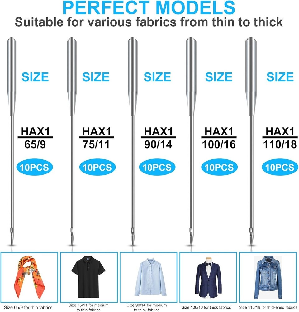 Sewing Machine Needles Set, Universal Standard Needle, Home Sewing Machines Needles, Sizes HAX1 65/9, 75/11, 90/14, 100/16, 110/18, WOILLIO Compatible with Singer, Brother, Janome, Varmax(50 PCS) About this item SUPER VALUE SET: This set includes 50 needles (5 sizes, 10 of each size), 3 spools, 1 needle threader (random color), 1 tape measure (random color), 1 thread un-picker (random color), 5 pearl needles(random color), 1 U-shaped Scissors (random color) and 1 transparent box for storage. You will enjoy the pleasure of one-stop shopping! PERFECT COMPATIBILITY: WOILLIO compatible with most household sewing machines & old-fashioned sewing machines, such as Singer, Brother, Janome, Kenmore, etc. NOTICE! Not suitable for industrial large sewing machines. HIGH QUALITY: Machine needles are made of top quality high-strength steel, high hardness, sharp needle tip, smooth needle hole, wear-resistant and not easy to bend, not easy to skip needle, the pointed tip can easily and quickly pierce the fabric. SIZE RECOMMENDATION: Size 65/9 for thin fabrics such as tulle, silk; Size 75/11 for medium-thin fabrics such as shirts, satin; Size 90/14 for medium-thick fabrics such as windbreaker, bed sheets, curtains; Size 100/16 for thick fabrics such as suits, coats; Size 110/18 for thickened fabrics such as jean fabric, cotton clothes.