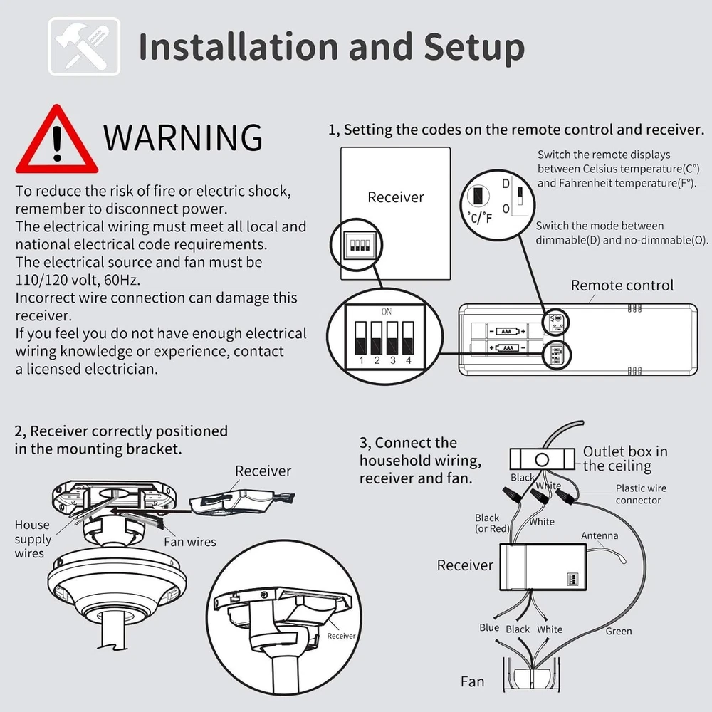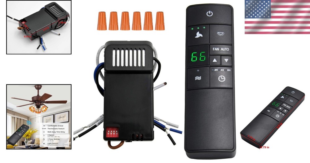 Assembly Required:NoFeatures:Adjustable, Dimmable, 3-Speed Control, Comfortable Breeze Setting, Thermostatic Feature, Timer Function, Light Dimmer, Walk Away Time DelayMounting:Free StandingPersonalized:NoMaterial:PlasticUPC:Does not applyDisplay Type:Ledgtin13:Does not applyCompatible Product:For Ceiling Fan, For Hampton Bay, For Hunter, For Home Decorators Collection, For Harbor Breeze, For HoneywellType:Remote ControlSmart Home Compatibility:NoneControl Style:Remote ControlLighting Technology:LEDPower Source:BatteryCurrent Type:ACNumber in Pack:1Color:BlackItem Weight:7.9 ouncesInstallation Area:IndoorBrand:UnbrandedCompatible Model:2AAZPHD3/HD3Smart Home Protocol:NoneProduct Dimensions:6.58 X 4.56 X 1.37 InchesVoltage:110 VPersonalize:NoBatteries:2 Aaa Batteries Required.Number of Speeds:3