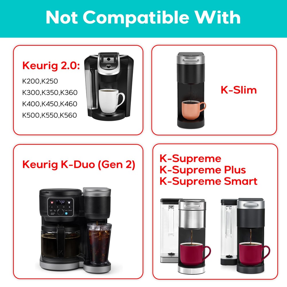 Universal Compatible: k cup reusable coffee pods are compatible with Keurig 1.0 coffee machines, and also work with Keurig K-Classic, K-Elite, K-Latte, K-Cafe, K-Select, K-Compact, and Breville K CUP, Mr. Coffee K CUP, But NOT Compatible with: Keurig 2.0 coffee machine, Keurig K-duo(Gen 2), Keurig K-Supreme/Plus/Smart, K-Slim (See full detailed list picture) Eco-Friendly & Saving Money: K cup coffee pods are made of high-quality stainless steel, recyclable for permanent use and save money, when using k cup coffee pods reusable, you can reduce the use of numerous paper filters and plastic coffee capsules. Contribute to protecting the environment Keep Coffee Flavor: The bottom and side walls of the reusable k cups are 360-degree perforated, allowing water to fully soak the coffee powder, fully retaining the coffee natural oils and flavors, ensuring delicious coffee brewing. The k cups reusable pods are a good helper for coffee lovers Easy To Use & Clean: The reusable coffee filter adopts one-piece design, tightly sealed top cover to prevent coffee overflow during use. Add the desired amount of coffee grounds to the stainless steel k cup coffee pods for each use, simply pour the grounds into the trash after use and clean the reusable k cup filter with water Our Promise To You: We are a US-based company and we care about our customers! If you're not happy, we're not happy. We want you to buy our reusable k cup coffee filters with confidence, We're here to help! please let us know if you experience any problems with our product