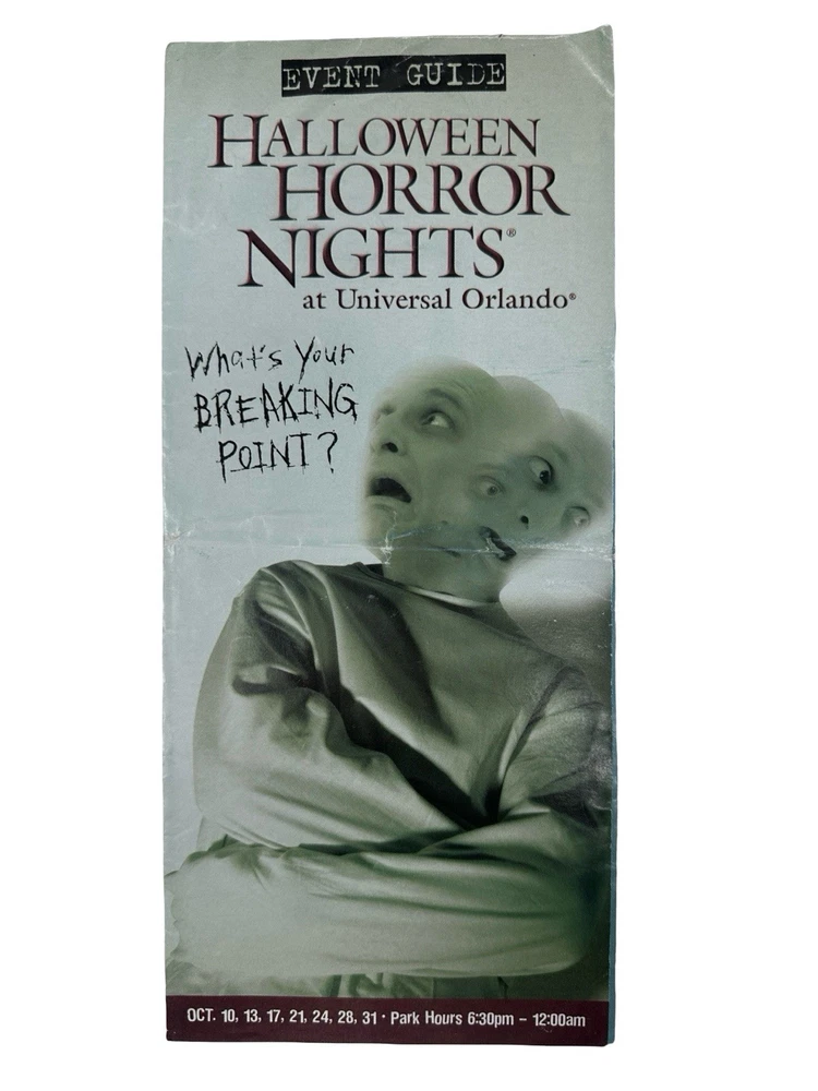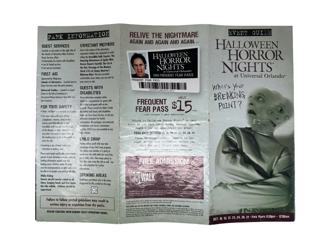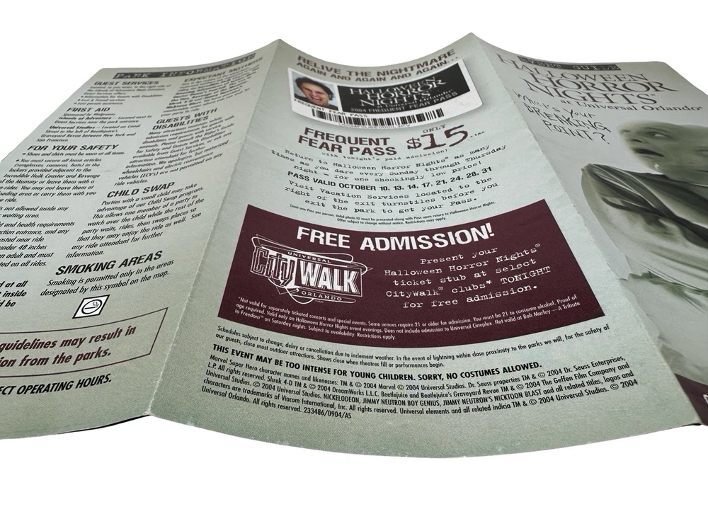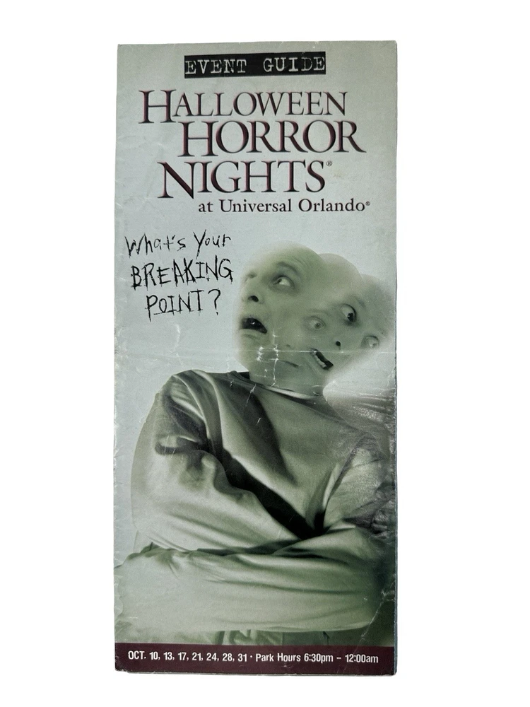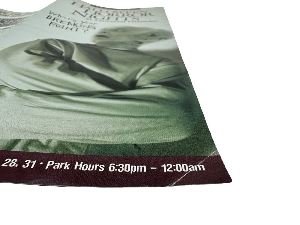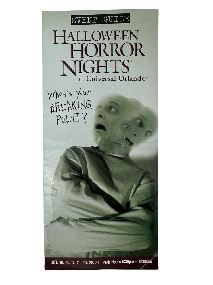 Offered here is a lot of three original event guides from Halloween Horror Nights XIV (2004) held at Universal Orlando Resort . These collectible park maps were handed out to guests during the event and feature the official HHN artwork, attraction listings, show schedules, and the event map covering both Universal Studios Florida and Islands of Adventure . The 2004 event is historically significant in Halloween Horror Nights history because it was the first and only year that Universal experimented with a dual-park format , allowing guests to experience haunted houses, scare zones, and attractions across both theme parks with a single ticket . This experimental format made HHN XIV unique among all Halloween Horror Nights events and has since become a notable milestone for longtime HHN fans and collectors. The guides feature the event theme “What’s Your Breaking Point?” and include: • Haunted house listings • Show schedules including Bill & Ted’s Excellent Halloween Adventure • Festival of the Dead Parade • Scare zones and attraction locations • A full park map spanning Islands of Adventure and Universal Studios Florida Because these guides were intended for single-night use, surviving examples are increasingly difficult to find—especially in multi-copy lots like this . This is an excellent collectible for: • Halloween Horror Nights fans • Universal Studios memorabilia collectors • Theme park history collectors • Orlando tourism memorabilia collectors Condition Summary All three original HHN XIV guides show typical park-used wear including folds, creases, and handling marks. One guide is in better overall condition, one shows moderate wear, and one example has heavier wear with a small tear along a fold line (see photo). All remain complete and fully readable. Features • Original 2004 Halloween Horror Nights XIV event guides • Lot of three (3) guides included • Features full dual-park event map • Historic first and only dual-park HHN event • Includes houses, shows, scare zones, and attraction listings • Theme: “What’s Your Breaking Point?” • Official Universal Orlando Resort event material • Vintage theme park memorabilia collectible • Condition varies from Very Good to Good vintage condition Shipping & Returns • Free US Shipping • 30 day returns (must be returned in original condition)