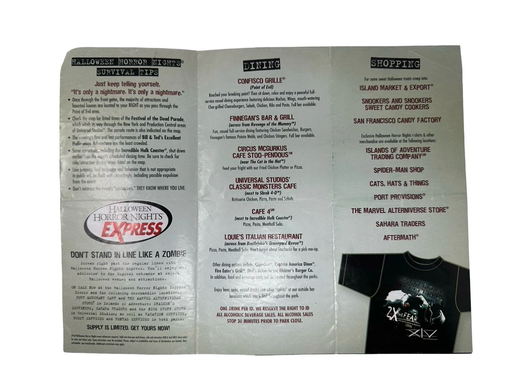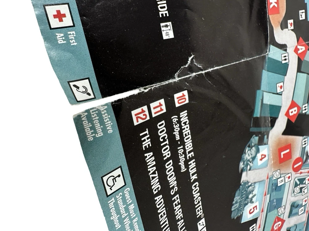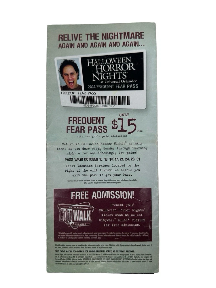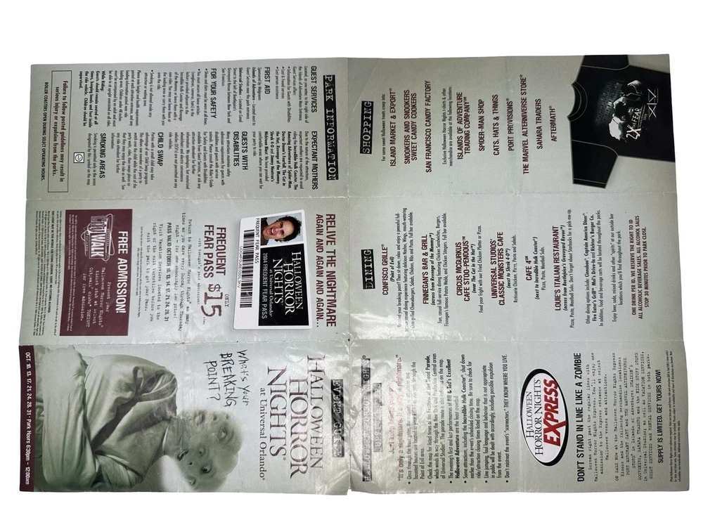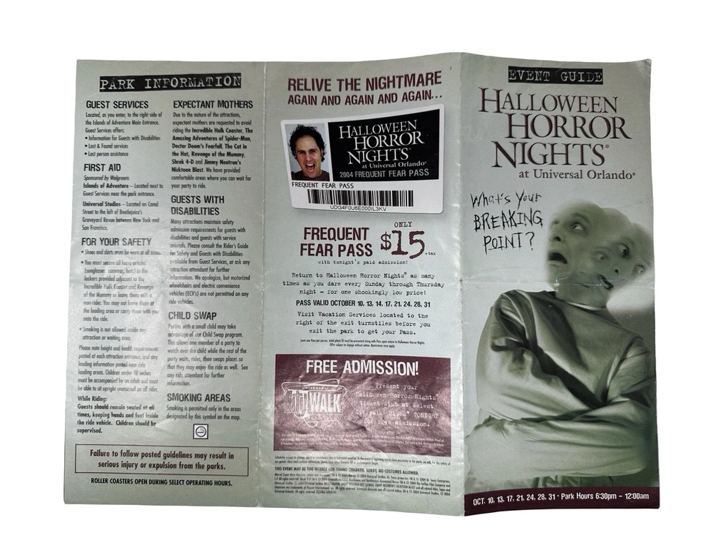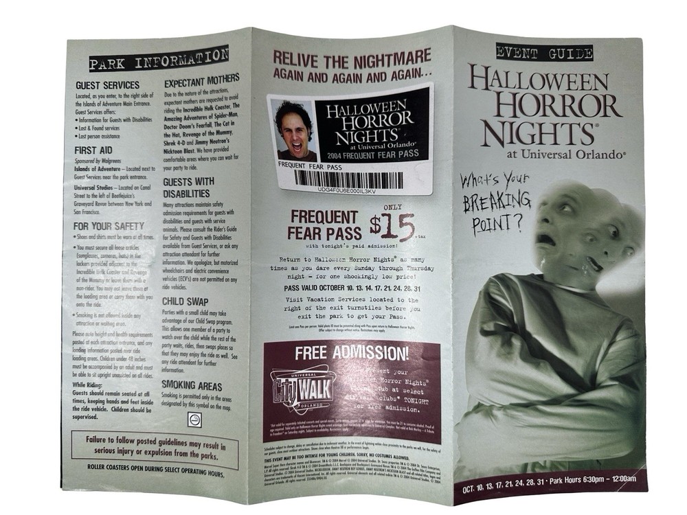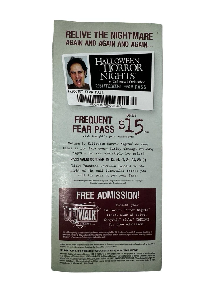 Offered here is a lot of three original event guides from Halloween Horror Nights XIV (2004) held at Universal Orlando Resort . These collectible park maps were handed out to guests during the event and feature the official HHN artwork, attraction listings, show schedules, and the event map covering both Universal Studios Florida and Islands of Adventure . The 2004 event is historically significant in Halloween Horror Nights history because it was the first and only year that Universal experimented with a dual-park format , allowing guests to experience haunted houses, scare zones, and attractions across both theme parks with a single ticket . This experimental format made HHN XIV unique among all Halloween Horror Nights events and has since become a notable milestone for longtime HHN fans and collectors. The guides feature the event theme “What’s Your Breaking Point?” and include: • Haunted house listings • Show schedules including Bill & Ted’s Excellent Halloween Adventure • Festival of the Dead Parade • Scare zones and attraction locations • A full park map spanning Islands of Adventure and Universal Studios Florida Because these guides were intended for single-night use, surviving examples are increasingly difficult to find—especially in multi-copy lots like this . This is an excellent collectible for: • Halloween Horror Nights fans • Universal Studios memorabilia collectors • Theme park history collectors • Orlando tourism memorabilia collectors Condition Summary All three original HHN XIV guides show typical park-used wear including folds, creases, and handling marks. One guide is in better overall condition, one shows moderate wear, and one example has heavier wear with a small tear along a fold line (see photo). All remain complete and fully readable. Features • Original 2004 Halloween Horror Nights XIV event guides • Lot of three (3) guides included • Features full dual-park event map • Historic first and only dual-park HHN event • Includes houses, shows, scare zones, and attraction listings • Theme: “What’s Your Breaking Point?” • Official Universal Orlando Resort event material • Vintage theme park memorabilia collectible • Condition varies from Very Good to Good vintage condition Shipping & Returns • Free US Shipping • 30 day returns (must be returned in original condition)