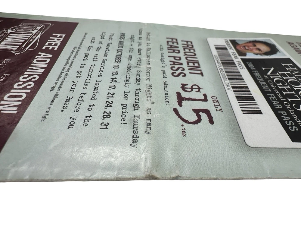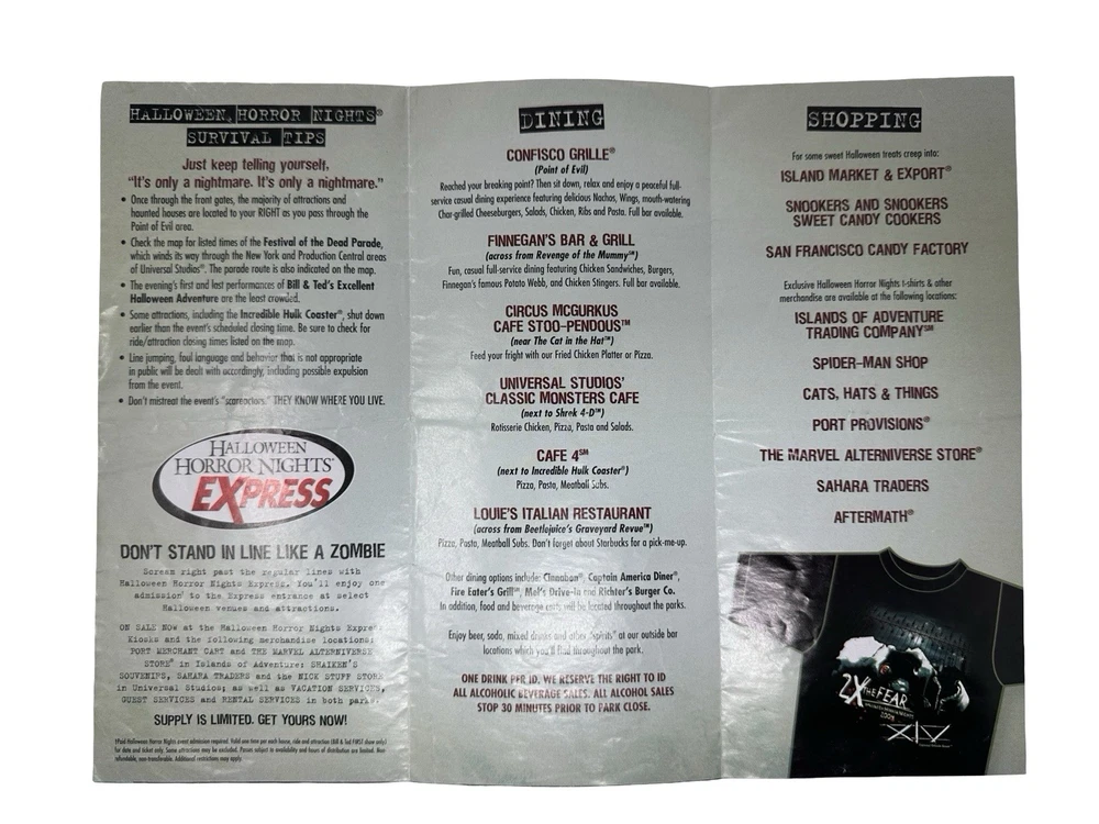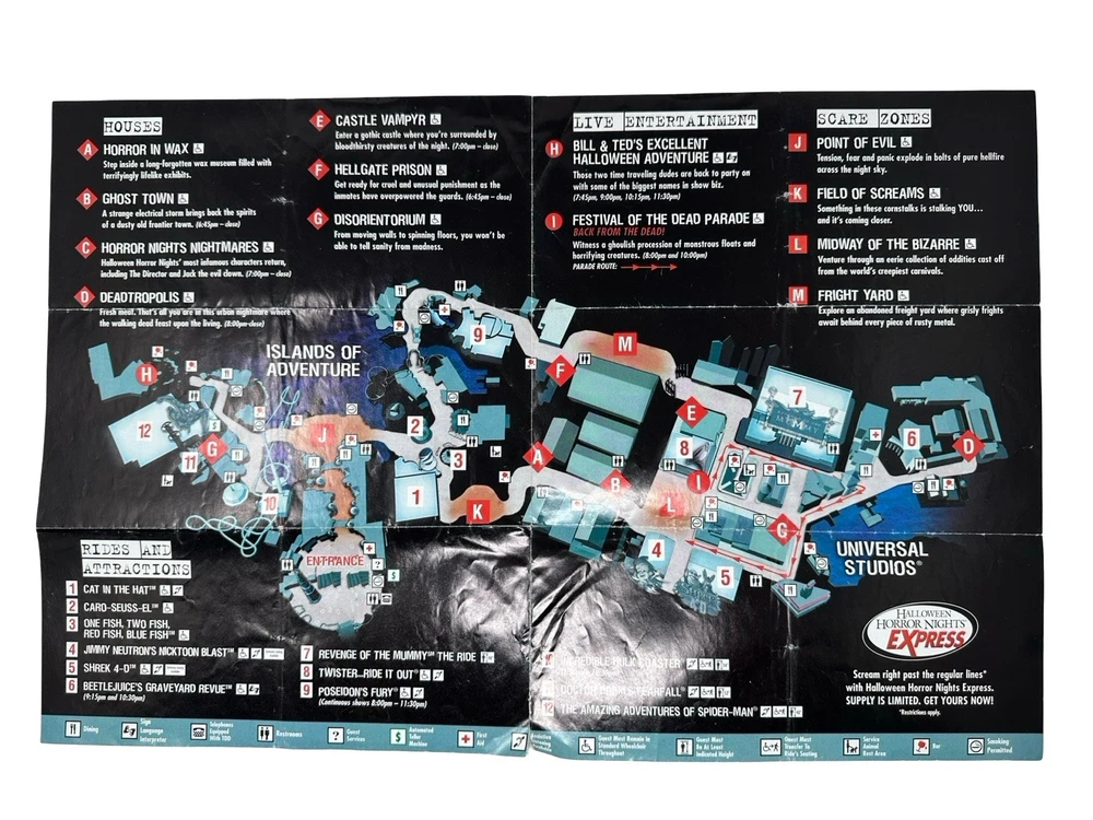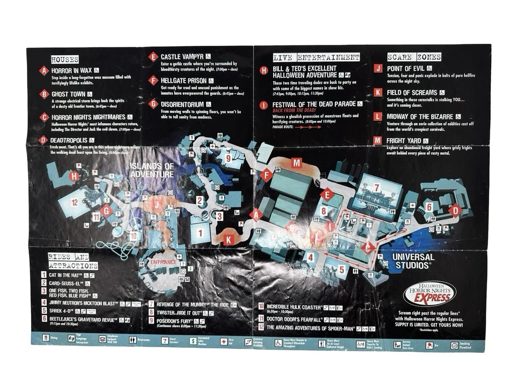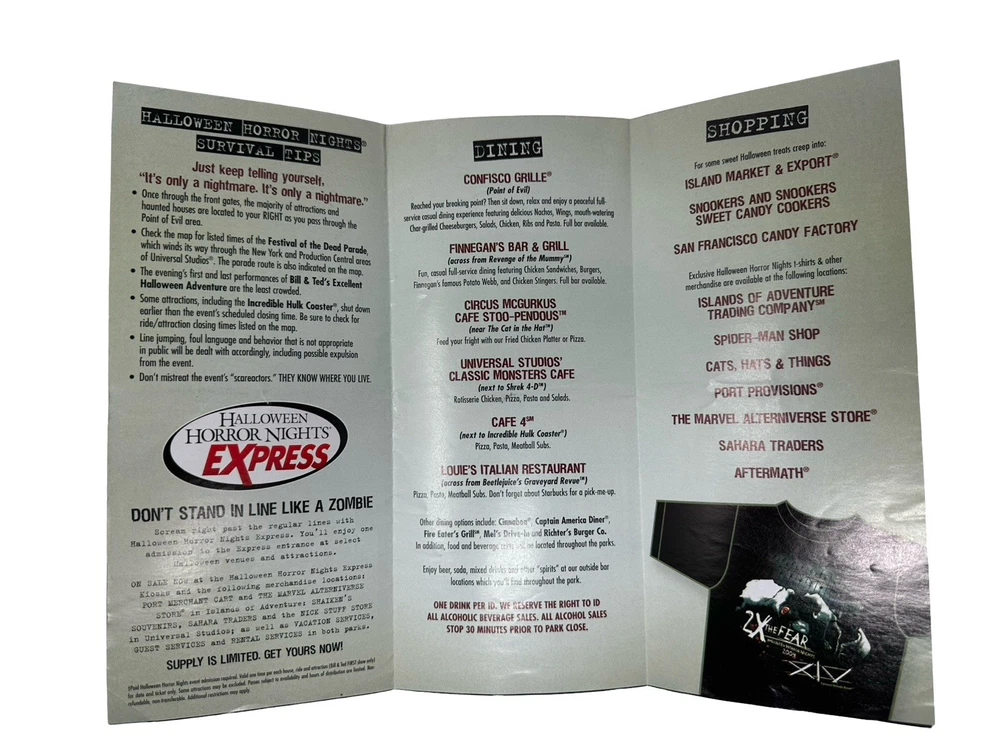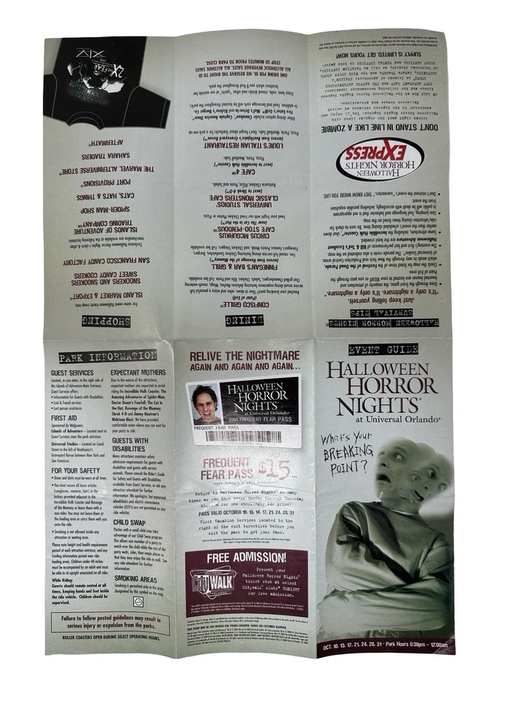Offered here is a lot of three original event guides from Halloween Horror Nights XIV (2004) held at Universal Orlando Resort . These collectible park maps were handed out to guests during the event and feature the official HHN artwork, attraction listings, show schedules, and the event map covering both Universal Studios Florida and Islands of Adventure . The 2004 event is historically significant in Halloween Horror Nights history because it was the first and only year that Universal experimented with a dual-park format , allowing guests to experience haunted houses, scare zones, and attractions across both theme parks with a single ticket . This experimental format made HHN XIV unique among all Halloween Horror Nights events and has since become a notable milestone for longtime HHN fans and collectors. The guides feature the event theme “What’s Your Breaking Point?” and include: • Haunted house listings • Show schedules including Bill & Ted’s Excellent Halloween Adventure • Festival of the Dead Parade • Scare zones and attraction locations • A full park map spanning Islands of Adventure and Universal Studios Florida Because these guides were intended for single-night use, surviving examples are increasingly difficult to find—especially in multi-copy lots like this . This is an excellent collectible for: • Halloween Horror Nights fans • Universal Studios memorabilia collectors • Theme park history collectors • Orlando tourism memorabilia collectors Condition Summary All three original HHN XIV guides show typical park-used wear including folds, creases, and handling marks. One guide is in better overall condition, one shows moderate wear, and one example has heavier wear with a small tear along a fold line (see photo). All remain complete and fully readable. Features • Original 2004 Halloween Horror Nights XIV event guides • Lot of three (3) guides included • Features full dual-park event map • Historic first and only dual-park HHN event • Includes houses, shows, scare zones, and attraction listings • Theme: “What’s Your Breaking Point?” • Official Universal Orlando Resort event material • Vintage theme park memorabilia collectible • Condition varies from Very Good to Good vintage condition Shipping & Returns • Free US Shipping • 30 day returns (must be returned in original condition)