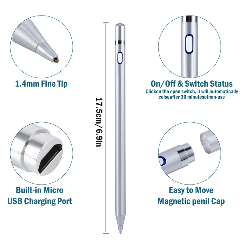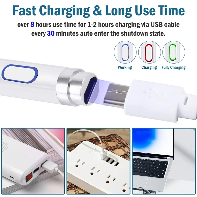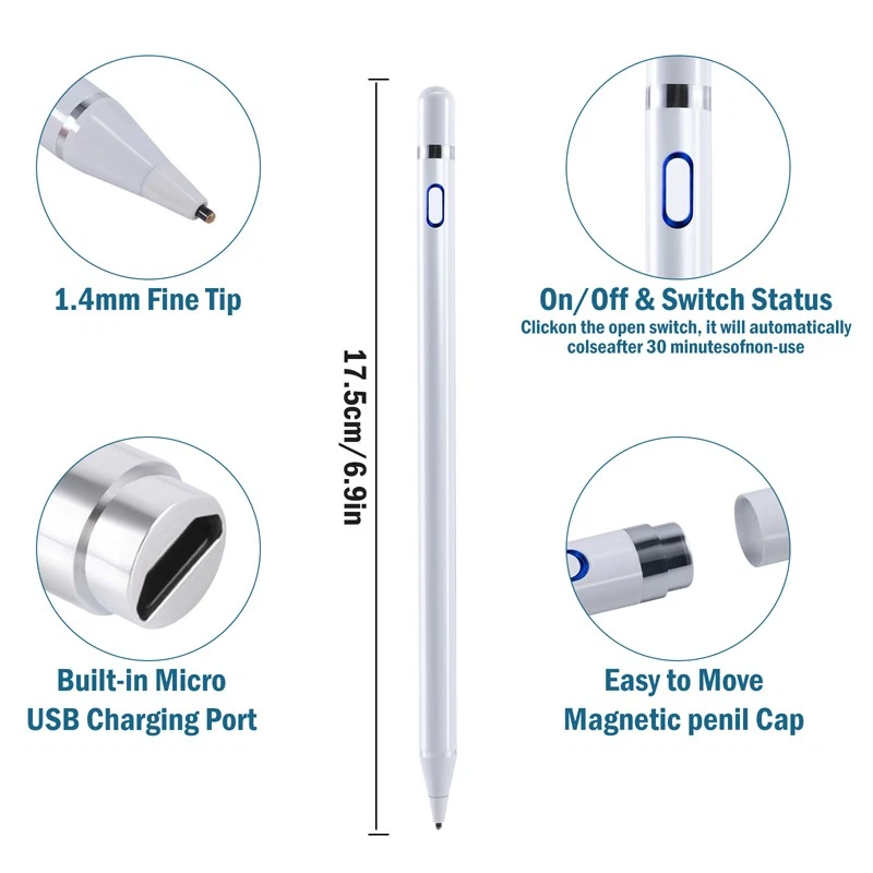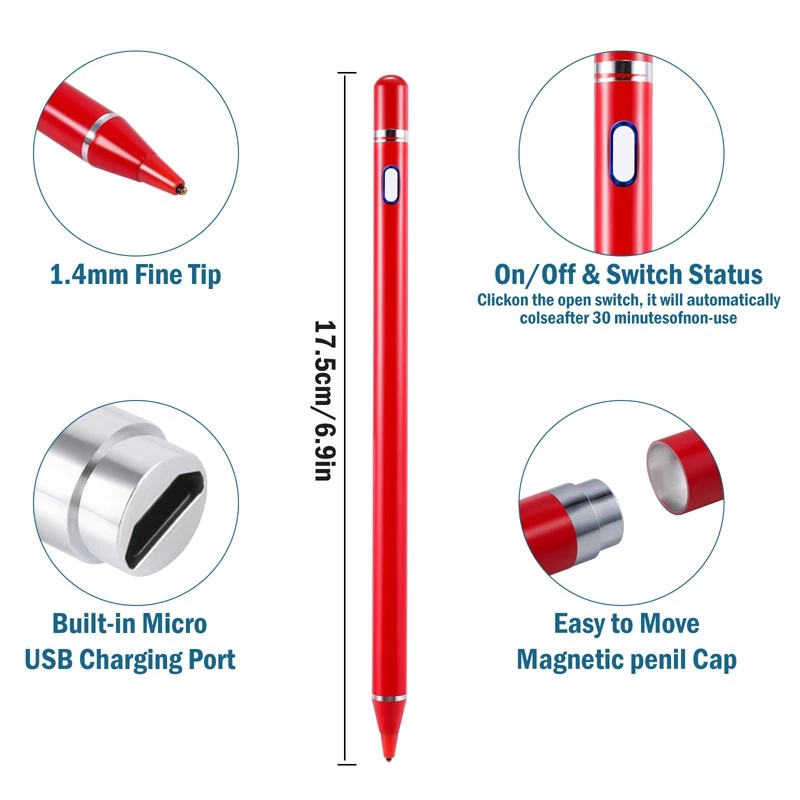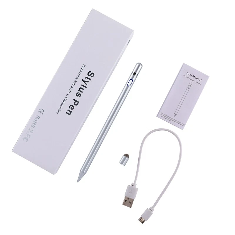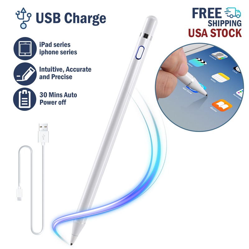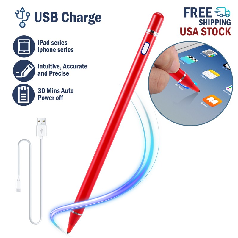Universal Stylus Pencil For iPad iPhone Android Phone Tablet Capacitive Pen New Feature: 1. Continuous use up to 8-10 hours, 30 minutes without use will automatically power off, three-color LED lights indicate activity, charging or fully charged. 2. Stylish and simple style, aluminum alloy material and painting process, the pen tip is made of special conductive material, precision grinding, which can prevent damage to the screen. 3. The stylus is sensitive to pressure and tilt, so you can easily change line thickness, create subtle shadows, and produce various artistic effects. 4. This stylus adopts the latest technology to ensure that it is widely compatible with all touch screen products, suitable for most mobile phones, tablets, capacitive screens and other electronic devices. Specification: Model: 2262 Colour: Red/White/Black/Silver Material: aluminum alloy Process: painting, electroplating Input: 5V-0.2A Applicable models: universal Battery: 100mAh Charging time: 50 minutes Working time: 8-10 hours Charging time: 50 minutes Working time: 8-10 hours Charging interface: Micro charging interface Product size: 175 (length)*8.9 (diameter) mm/6.9*0.35inch Color box size: 21*6.1*2.1cm/8.3*2.4*0.83inch Package includes: 1x Stylus 1x Manual 1x Micro Charging Cable 1x Pen Cap 1x Packing Box Payment Delivery details Terms of sales About us Contact us Payment Payments: Paypal, Google Pay, Visa, Master Card, Amerian Express, Discover. Delivery details All items are shipped from US warehouse. 😉😉 😉 We have 2 wharehouse in US, one is in NJ and the other is in CA. 😉😉 😉 We will ship from the warehouse closest to the buyer's delivery address. Don't hesitate make orders ! We ship to your eBay or Paypal address. Please make sure your eBay or Paypal address is correct before you pay. Terms of sales Free return About us Pls contact our customer service firstly if have any problems , we will help to solve the issue, and could offer free return service for full refund or free replacement after confirming. You can buy from us with confidence Contact us If have any problems, please feel free to contact us.