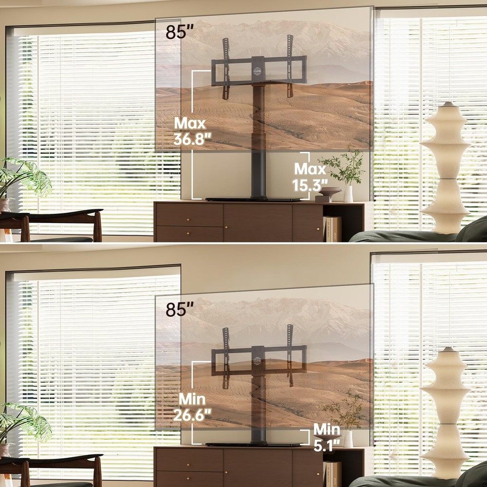 Universal TV Stand Mount for 43-80 85 inch TVs, Swivel Tall TV Mount Stand, Table Top TV Stand Base Replacement, Height Adjustable TV Table Stand, Glass Base, Max Holds 110lbs 【Universal TV Stand】Our universal TV stand is compatible with most Samsung/Sony/LG/TCL/Sharp 43-85” TVs (VESA 200x200 to 600x400).This TV stand base replacement is engineered to hold 110 lbs of cinematic power, featuring dual security locks and lab-tested stability.Always verify your TV’s VESA pattern! 【±30°Fluid Swivel for Free Control】Dominate your viewing angles with a 30° left/right swivel—This swivel TV stand mount is for gaming marathons, glare-free workouts, or hosting movie nights. The TV stand for bedroom's self-developed structure ensures the smooth rotation to match your dynamic lifestyle. 【10-Level Height Customization】This tv stand mount can be adjusted from 30.2'' to 43.2'',it will adapt your TV’s height across 5 adjustable pole positions and 2 bracket tiers,perfect for ergonomic viewing in bedrooms or living rooms. The height adjustable TV stand features the Anti-tip engineering to keep 85 inch screens rock-solid! 【Design with peace of mind for you】Our 85 inch TV stand is built with a 24.4"×13" tempered glass base and 3mm non-slip silicone pads. This table top TV stand was survived in Laboratory professional test! Hidden cable tunnels organize consoles, routers, and soundbars for clutter-free elegance. 【Easy Installation】No drills, no frustrationl.The table TV stand is Specially designed for you who prefer easy installation, this quick assembled table top TV stand from eliminates drilling, confusion, and frustration. perfect for renters and DIY newbies. Your weekends belong to you, not wall holes This adjustable desktop TV stand combines universal compatibility with heavy-duty stability, engineered to securely hold flat or curved screens from 43" to 85" (optimized for 50-80" TVs) weighing up to 110 lbs. The universal TV stand base replacement's versatile VESA mount supports 10 hole patterns from 200x200mm to 600x400mm, seamlessly fits for Samsung, Sony, LG, and other major brands. This stable TV stand mount features anti-tip base with 3mm non-slip silicone pads ensure lab-certified stability, even for high-energy gaming or movie nights. Enjoy dynamic viewing with our swivel table top TV stand's smooth 60°swivel range (30° left/right).The TV stand for bedroom adapts to bedroom low-profile setups or elevated living room entertainment centers.This quick assembled desktop TV stand simplifies installation in 15 minutes using intuitive color-coded guides and self-leveling feet for carpets, tiles, or hardwood floors—ideal for renters, gamers, or anyone seeking a clutter-free upgrade without wall drilling. Shipping We offer FREE shipping on all orders! We ship within Three business days of payment, usually sooner. We use a selection of shipping services such as UPS, FedEx, USPS etc. We only ship to the lower 48 states, no APO/FPO addresses or PO Boxes allowed. Local pickups and combined shipping options are not provided at this time. Return You can return a product for up to 30 days from the date you purchased it. Any product you return must be in the same condition you received it and in the original packaging. Please keep the receipt. Payment We accept payment by any of the following methods: PayPal Please pay as soon as possible after winning an auction, as that will allow us to post your item to you sooner! Feedback Customer satisfaction is very important to us. If you have any problem with your order, please contact us and we will do our best to make you satisfied. Contact Us If you have any queries, please contact us via ebay. We usually respond within 24 hours on weekdays. Please visit our eBay store to check out other items for sale! Thank you for shopping at our store.