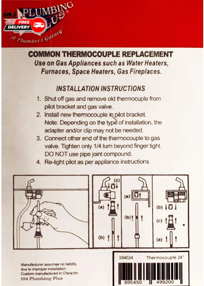 Store New Arrivals Add to Favorite View Feedback Contact Universal Thermal Coupling for Gas Appliances, Thermocouple Description Batteries Required? No Color Multicolor Connector Type Coupling Item Weight 2.39 ounces Package Dimensions 6.46 x 4.88 x 1.26 inches Reliable , Durable and Safe ; 100 % Quality Inspected Easy to Install ; Positive positioning for quick insertion ; 30 Inch Long Universal Gas Thermo couple includes universal adapter fittings and is compatible with screw-in, push-in or clamp-type pilot Use as Replacement Thermal Couple for Gas Appliances Such as Gas Water Heater , Gas Furnace , Gas Fireplace , Gas Room Heater , Gas Boiler Heater 104 Plumbing Plus Thermocouples are Reliable, Durable and Safe , made with focus on quality and ease of use. Every 104 Plumbing Plus Thermal Couple passes through stringent quality controls to ensure Complete Customer Satisfaction. Features:- Universal Fit compatible with screw-in, push-in or clamp-type pilot 30 Inch Long Positive Positioning for Quick Insertion Strong and Durable Made with High Quality Materials for Long Usage Specially Designed for Gas Appliances such as Gas Water Heater , Gas Furnace , Gas Fireplace , Gas Room Heater , Gas Boiler Heater Includes:- Universal Thermocouple with Universal Adapter Fittings Precaution:- Follow the Instructions and Warnings provided on the Packaging, when installing and using this product 104 Plumbing Plus Leading Thermocouple Brand in the Market , Focused on Quality for Long Lasting and Convenient Products. ABOUT US We offer the best prices around on high quality products. Our E-store includes media such as books, movies, music and games while offering electronics, toys, sporting apparel, clothing, tools, general home, garden items and more. SHIPPING We are always working hard to ensure your package arrives as soon as possible. Please understand that some factors like weather, high postal traffic, and the performance of shipping companies are outside of our control. We offer free shipping to the lower 48 states and ship within 2 business days of payment, usually sooner. We do not accept P.O. Boxes. Please provide a physical address. For shipping outside of the continental USA, we only use eBay's Global Shipping Program.The item is shipped to KY and then sent to the rest of the world. International customers are responsible for all duties and taxes. Continue to check out in order to calculate costs for shipping the item to your country. Messages regarding eBay's Global Shipping Program MUST be directed at eBay EXCLUSIVELY. RETURNS We offer a 30-Day Return Policy on items which you are not completely satisfied with. You have the option for a full-refund or an exchange of the item. No returns are available on items shipped outside of the USA. PAYMENT We accept PayPal. CONTACT US This page content is yet to come Please ad us to your favorite seller and visit again later Thank You CUSTOMER SATISFACTION We try our very best to make sure every customer is completely satisfied. If there's a problem, message us! We're happy to help. WE ACCEPT