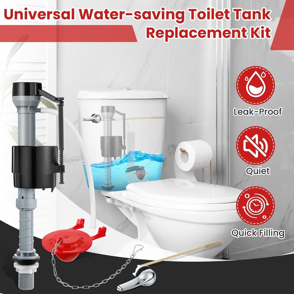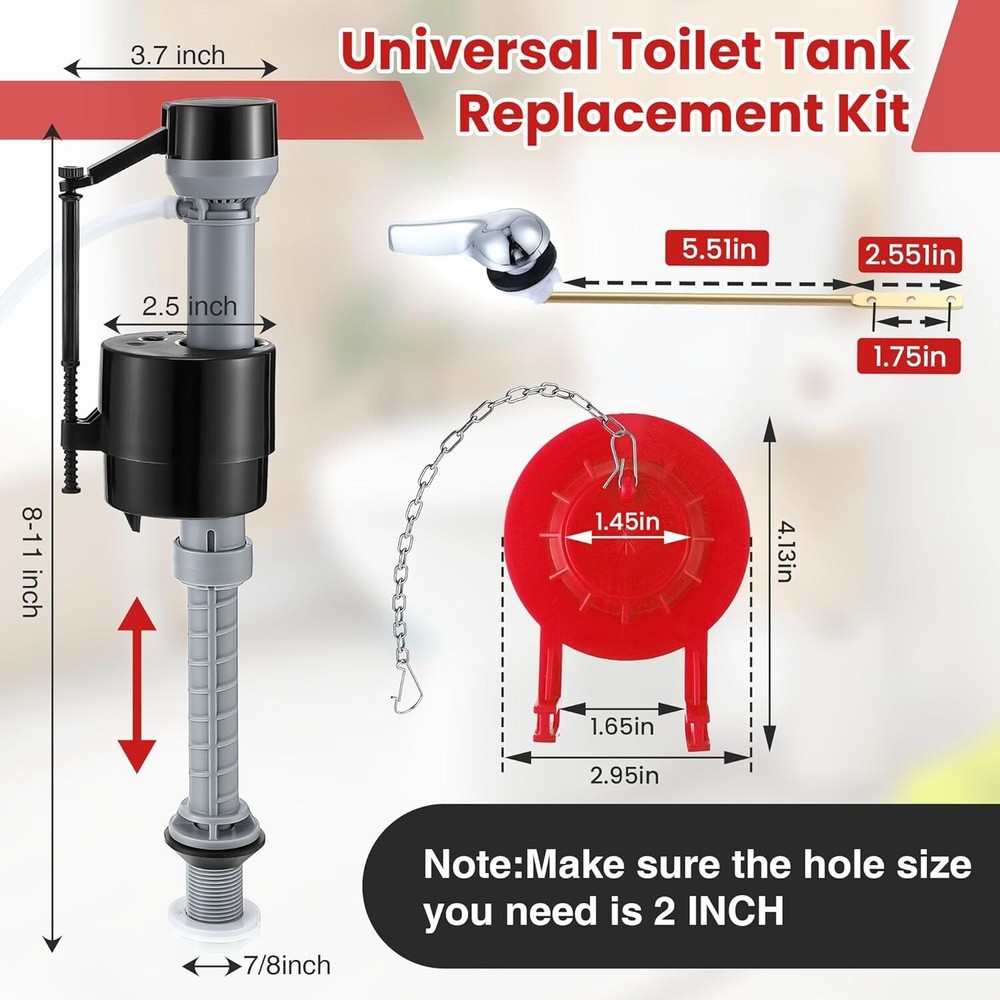 [High Efficiency and Low Flow] This toilet valve replacement kit is equipped with a fine water level adjustment screw to easily control the water level in the water tank, saving water, and reducing your water bill; Its height is flexible and easily increases from 8 inches to 13 inches, perfectly matching your toilet tank needs; Moreover, this toilet fill valve replacement kit can also remain silent during the filling process, making your life more comfortable and quiet [Durable and Leak Proof Toilet Flapper] This toilet flush valve replacement kit fits most toilets with a 2 inch flush outlet; Crafted from quality, corrosion resistant rubber, the toilet flapper is sturdy and flexible; This toilet flush flapper perfectly resists the erosion of chlorine and hard water, its excellent sealing performance effectively prevents water leakage problems [Stable & Adjustable Front Toilet Flush Lever] This toilet flush lever is made of solid brass with a metal surface treated handle, which has strong load bearing capacity, resists corrosion and is not easy to rust, ensuring a long service life; This toilet tank lever is front mounted and has three length adjustment holes to meet your specific length needs and can be bent to the correct angle for your toilet tank [Universal Toilet Pump Replacement Kit] Package Include 1 x toilet fill valve, 1 x toilet flapper, 1 x toilet handle lever; This toilet parts inside tank kit fit most US toilet tanks [Easy Installation] Our toilet tank replacement kit is well designed and easy to install; Just follow the detailed instructions included and you can install it in a short time and enjoy the convenience and comfort of a quality toilet tank