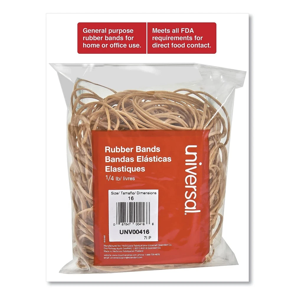 An excellent value, pound for pound—buy by the weight, and reap the savings associated with buying in bulk. High-rubber content, never less than 70%, ensures excellent elasticity and a high break point. Use them in the office, in your shop or in your kitchen. They even meet all FDA requirements for direct food contact. Sold as 475/Pack. General purpose rubber bands for home or office use. High rubber content. Meet all FDA requirements for direct food contact.
