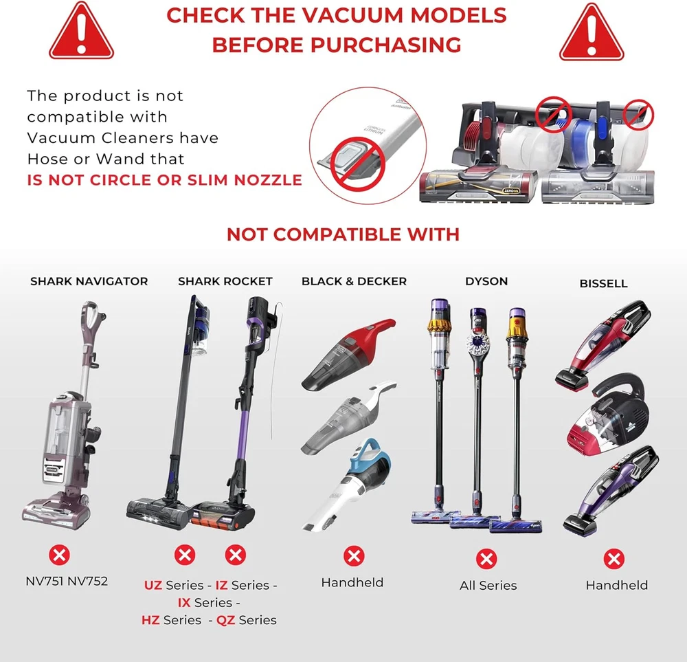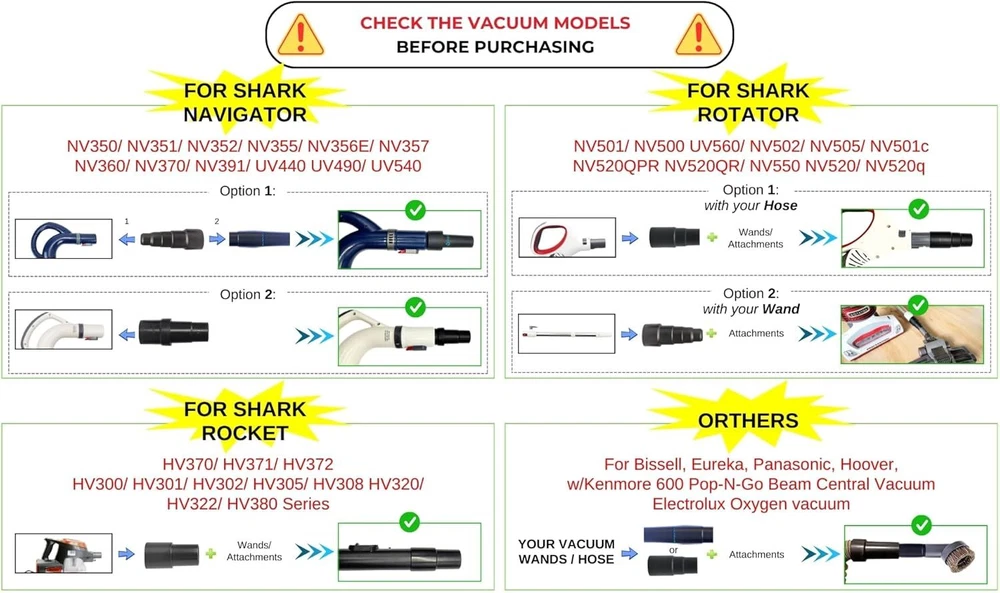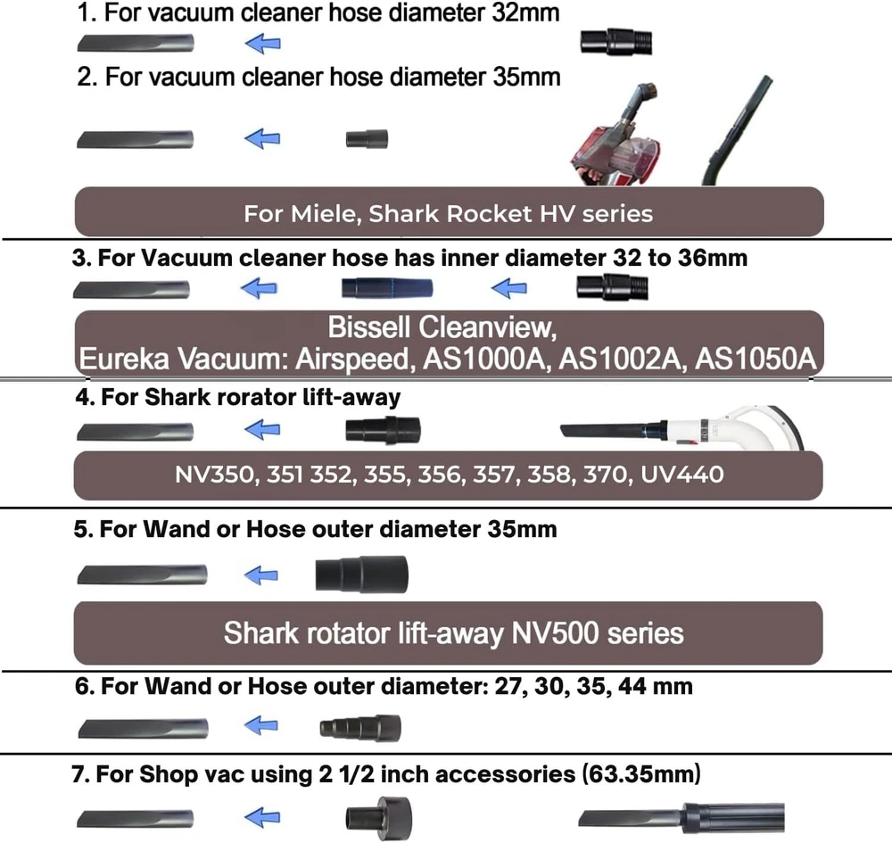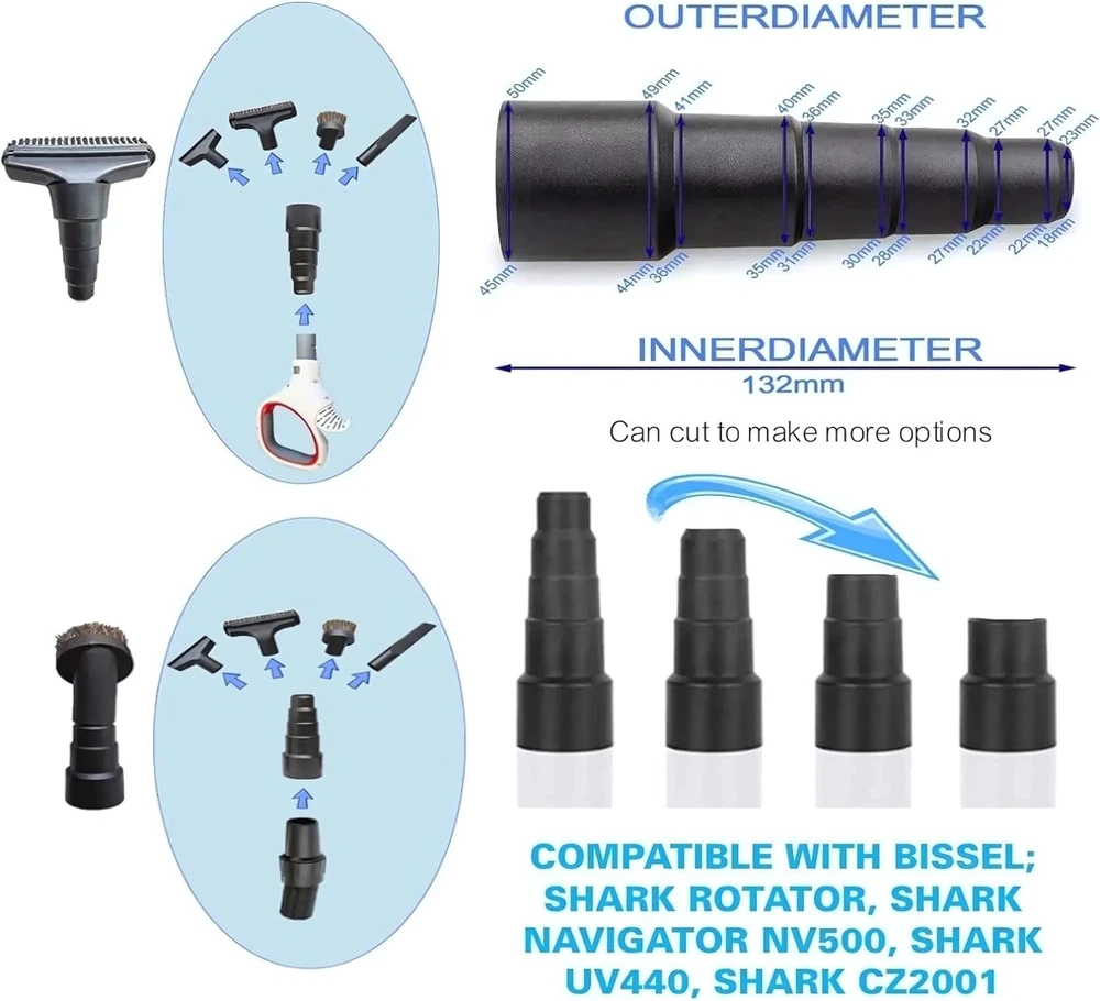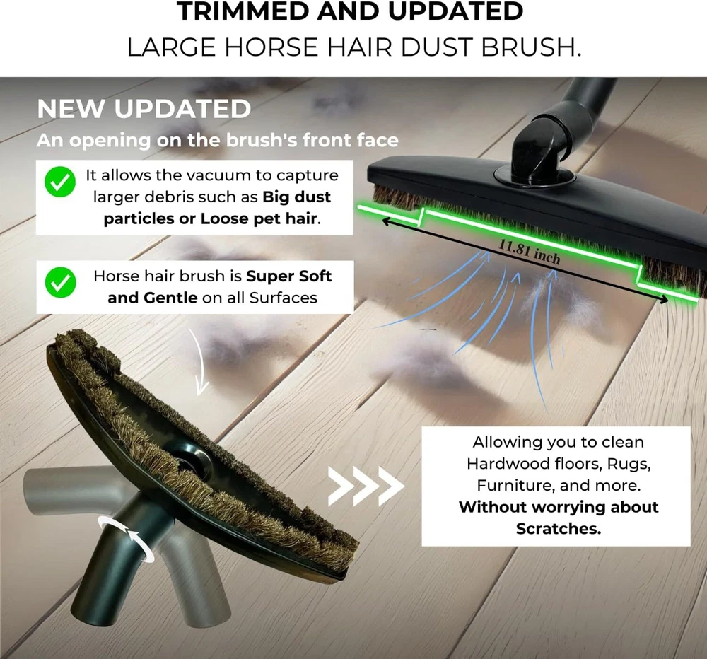 Universal Vacuum Attachments & Brushes Kit - Hardwood Floor Black Product Details Material: Plastic Brand: GHAMADE Color: Black Item dimensions L x W x H: 12.7 x 6.67 x 4.21 inches Connector Type: Adapter Exterior Finish: Plastic Thread Type: NPT Item Weight: 1.5 Pounds Number of Pieces: 9 Manufacturer: GHAMADE 【Wide Compatibility】 Vacuum attachments are suitable for Most Vaccum (not all ). Vacuum adapter kit includes 2 1/2" to 1 1/4" Vacuum Hose Adapter and 1 7/8" to 1 3/8" to 1 1/4 to 1" vacuum adapter to provide you a wide application which can meet all your different needs in daily clean, and suitable for most vacuum. Not Fit for shop vac accessories with 2 1/4 inch inner diameter. 2 1/2" to 1 1/4" Vacuum Hose Adapter】 Fits most 2-1/2" and 1-1/4" hose systems. 2.5" to 1.25" reducer enables you to use all your 1 1/4" inner diameter vacuum attachments with 2 1/2” inner diameter vacuum cleaner. Big end measures 2.44" OD and 2.26" ID. Small endmeasures 1.18" OD and 1" ID. Upgraded Vacuum Floor Attachment: Works on low carpets and all floor surfaces (hard floors, hardwood floors, bare floors). It effectively removes pet hair from floor surfaces. Flexible Crevice Tool for Hard to Reach Place: can tackle dust in hard-to-reach places around your home and car and can remove lint from the dryer vent as well, Great for corner, heating ducts, under furniture and car seat, along side the refrigerator. 【Vacuum attachments including】 2 1/2" to 1 1/4" Vacuum Hose Adapter, 1 7/8" to 1 3/8" to 1 1/4 to 1" Vacuum Adapter, 12in wide Vacuum Brush Attachment, 1 1/4" Horsehair Vacuum Brush, 1 1/4" Flexible Crevice Tool, 1 1/4" Vacuum Crevice Tool, 1 1/4" Upholstery Tool Attachment, 1 1/4" Utility Nozzle with Removable Plastic Brush, 1 1/4" Brush & Nozzle Combination Tool.