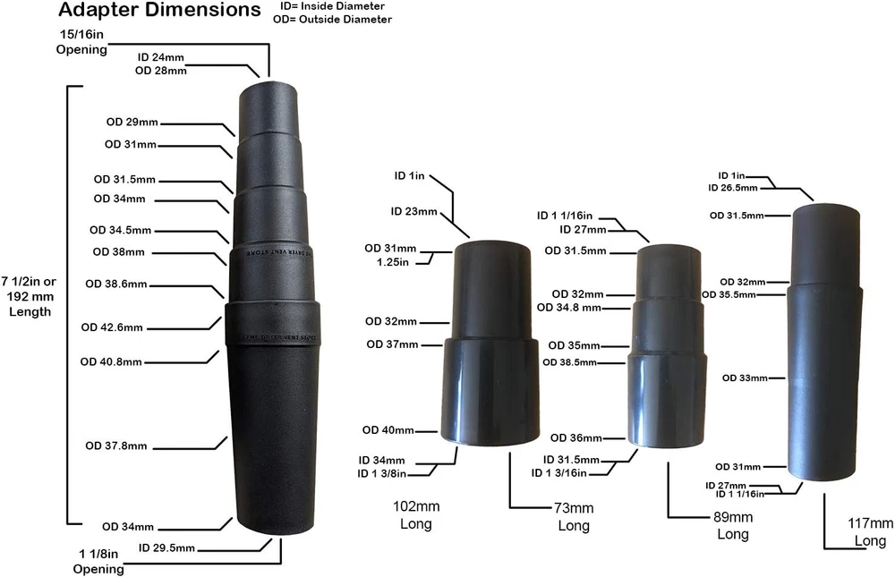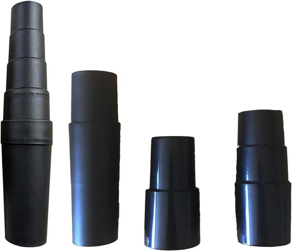 Four Vacuum Attachment Adapter Set. We had these DESIGNED TO FIT most standard vacuum hoses up to 1 1/2 inches. Use these to connect to your vacuum attachments. NOTE ***Please Measure Your Hose End And Compare With Dimensions In Photos To Confirm Fit *** These Vacuum Cleaner Attachment Adapter s will fit into each other to make a variety of connections. Just try different combinations. Both with older vacuums and newer ones measure your vacuum hose and vacuum accessories diameter to make sure that they are compatible with the adapters Combine adapters or use one by itself. Use these as a converter for your attachments to connect to your vacuum hose. If you use this with an attachment and it keeps falling off secure with a piece of tape, some heavy attachments may need to be secured. These vacuum hose connectors are made out of plastic and have either a tapered fit or a step fit. The 3 smaller adapters are made out of hard plastic. The larger adapter have some give in the material. One adapter will connect together a 1 1/4 in hose and 1 1/4 inch attachment since each side of the adapter is the same size. Use these to CONNECT your POWER TOOLS vacuum port to your hose in your work or with your home vacuum cleaner hose and attachments. Four Vacuum Attachments Universal and Versatile - Adapters For a Variety of Connections - 4 Adapters Either use one adapter by itself or use any combination of the 4 by connecting them together to create an adapter that will fit your hose. After realizing there are not really any universal adapters available on the market we worked on a design to fit the most common home vacuum cleaner hoses and then added some of our other common adapters. Both with older vacuums and newer ones measure your vacuum hose and attachment to check the size before purchase because we want you to be happy with your purchase. Use these to connect your power tools vacuum port to your hose in your work shop or with your shop vacuums, also can use with dust collection systems. Please check the size first of your vacuum hose, also feel free to message us on Amazon and we will be glad to assist you any way we can.** Just a note if you combine more than one adapter to fit a heavier floor attachment you might need a piece of tape to hold it on, just because of the weight when you pick it up and down often.**. You can even glue the pieces together.