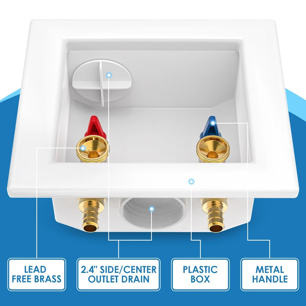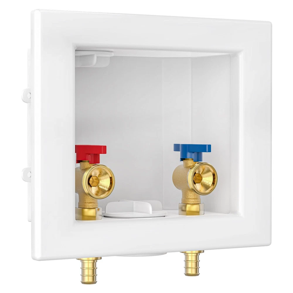 Package Includes: Washing Machine Outlet Box, 1/2-Inch Pex Crimp Connection x 3/4 Inch MHT; Support Bracket ×2 Pipe Compatibility: This pex washing machine outlet box is with crimp pex fitting system, NOT with expanding fitting system. The box is equipped with 1/4-turn hot and cold shut off valves; the inlets of washing machine box work well with 1/2 inch PEX pipes; the outlets fit well with 3/4 inch MHT washing machine hoses Long Lasting: The washing machine outlet box is made from high-quality C46500 brass, known for its high corrosion and abrasion resistance. This material ensures long-lasting performance and reliable water flow Standards Compliance: The washing machine outlet box meets American standards and complies with UPC and NSF requirements, ensuring adherence to strict safety and quality standards Versatile Applications: 1/2 pex washing machine outlet box allows for inverted installation and provides solutions for a range of residential washing machine applications. It features a recessed design and features a snap on frame which accommodates to drywall Flexible Installation: The washing machine outlet box is perfect for connecting your washing machine or water dispenser to your water supply