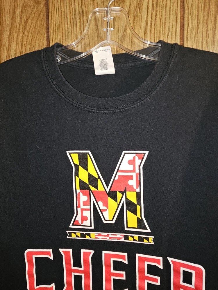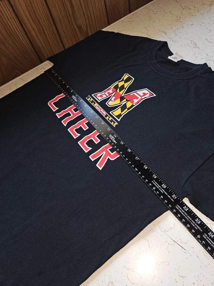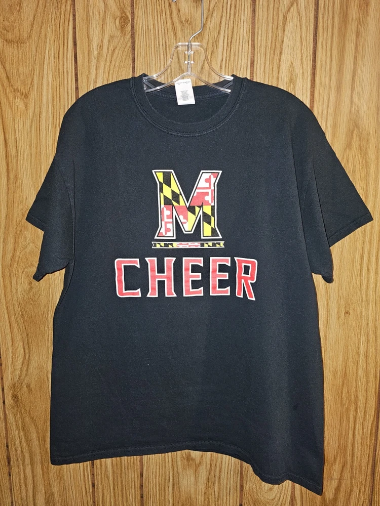Show your support for the Maryland Terrapins with this black graphic logo T-shirt. This shirt is perfect for any fan looking to represent their team during the regular season. Made by Gildan, this shirt is made to last and is perfect for showing off your team pride. The shirt is size large and is designed for men. The shirt is officially licensed and made in Haiti. Perfect for any cheerleading fan, this shirt is a must-have for any Maryland Terrapins supporter.