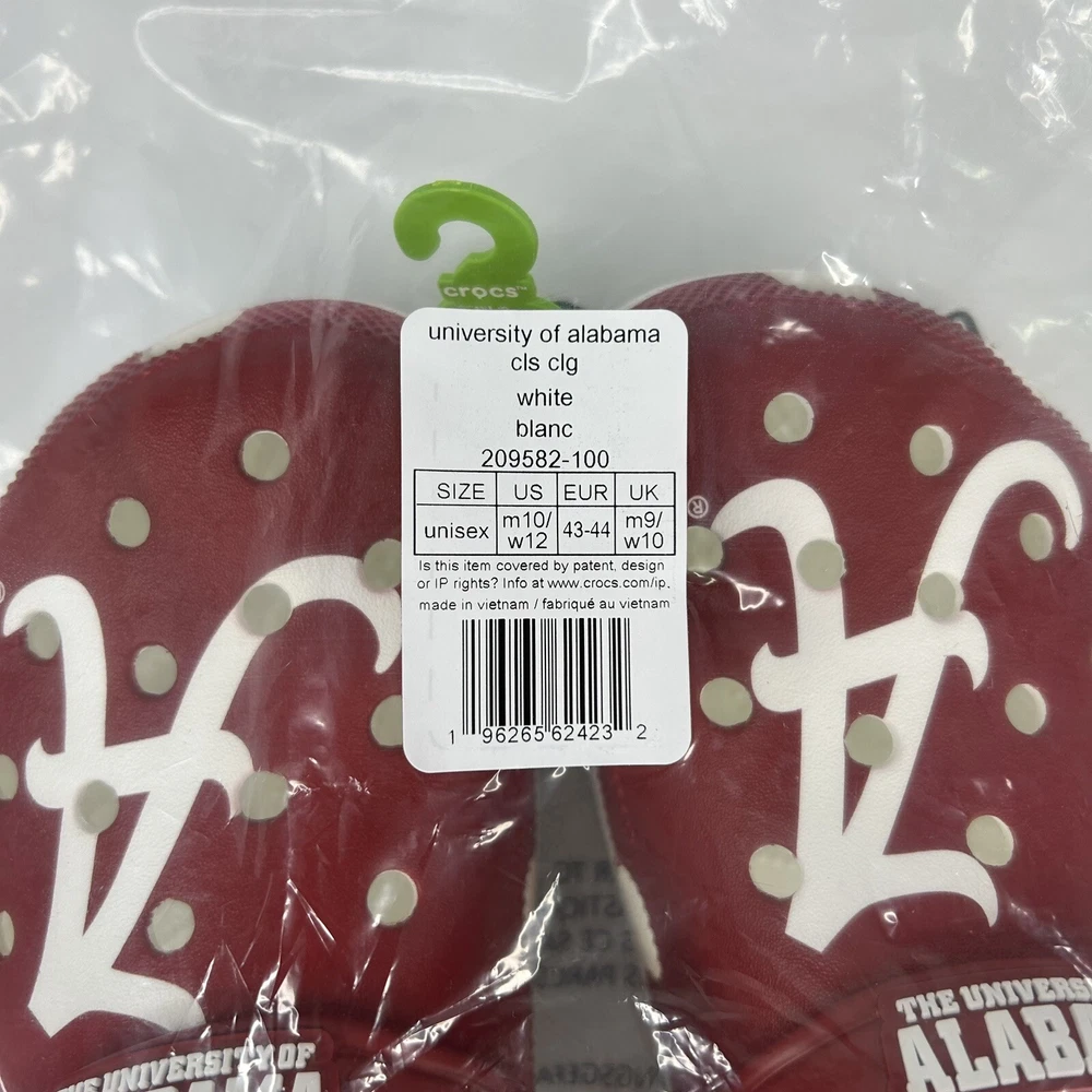 Style: Clog Features: Ankle Strap, Breathable, Comfort US Shoe Size: 10 Department: Unisex Adults Occasion: Activewear, Casual, Travel Color: Crimson Red Accents: Logo Character: Al the elephant Brand: Crocs Vintage: No Type: Casual Model: Classic Croc Theme: College, University of Alabama, University, Crimson Tide Upper Material: Synthetic EU Shoe Size: 43 UK Shoe Size: 9