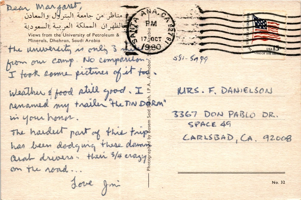 MAKE AN OFFER. THE MORE YOU BUY THE BETTER DEAL I WILL ACCEPT The postcard is a message from Jmi to Margaret, featuring views from the University of Petroleum & Minerals in Dhahran, Saudi Arabia. The sender mentions the university being only three years old in 1980 and compares it favorably to others. They also comment on the good weather and food, and mention taking pictures of the university.