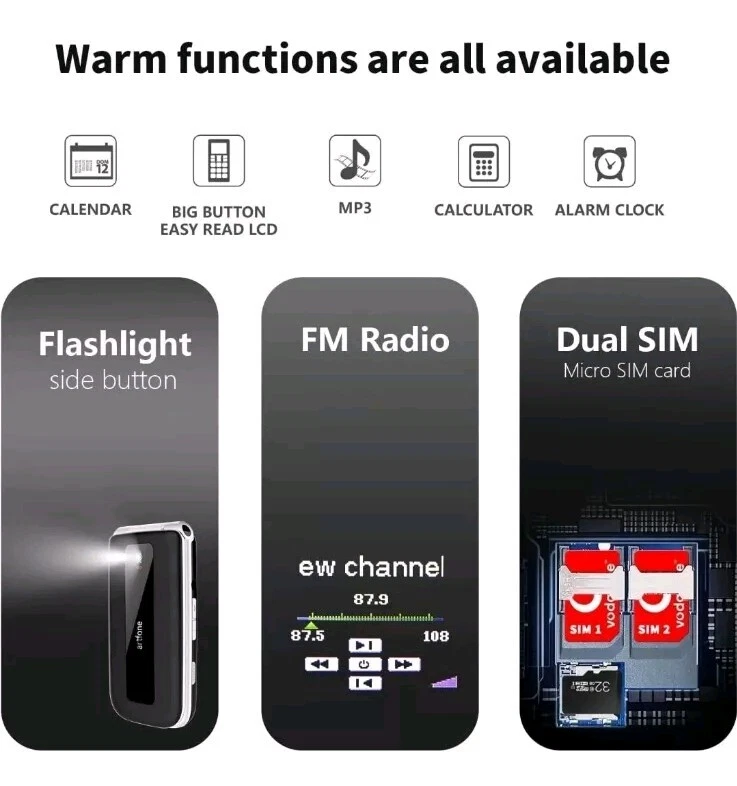 MPN: Does not apply Chipset Model: Spreadtrum T107 UPC: Does not apply Connectivity: 2G, 3G, 4G, Bluetooth, FM, Headphone Jack, USB Type-C Cellular Band 2: 3G bands:850/900/2100 Memory Card Type: MicroSD Cellular Band 3: 850/900/1800/1900 Camera Resolution: no camera Model: Artfone F30 Operating System: Android Screen Size: 2.4 inch gtin13: Does not apply Manufacturer Warranty: 1 Color: PIC Shows Contract: Without Contract Battery: BL-5L,1000mAh Storage Capacity: 128 MB Lock Status: Factory Unlocked Features: Flash Light, SOS Button SIM Card Slot: Dual SIM (SIM + SIM/Memory Card) RAM: 48MB Brand: Artfone Style: Foldable size: 53mm*34mm*5mm Country/Region of Manufacture: China Cellular Band: 4G bands: B1/B3/B7/B8/B20 Model Number: Artfone 4G Senior Flip Mobile Phone for Older People Colour: Black