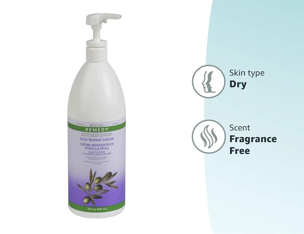 Unscented Olivamine Skin Repair Cream and Body Lotion, 32 Fluid Ounce Description: Protects and relieves damage related to frequent hand washing such as dryness, cracked, inflamed, reddened and itchy skin Blend of nutrients targeted for skin cells, as well as Dimethicone to help prevent e-TEWL Tested to be non-sensitizing, non-allergenic Body lotion beneficial for face, hands, body, and legs Skin Repair Cream to help rebuild skin's natural oils