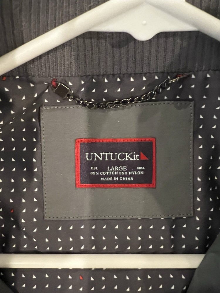 This Untuckit Jacket for men is made of softshell polyester material in a solid gray color. It features a quilted design with a zip closure and is machine washable. The jacket has a regular fit and is size L. Excellent used condition. No rips, tears or holes. Comes from a smoke free and dog free home. Jacket has spent most its life hung up on a closet. Like new.