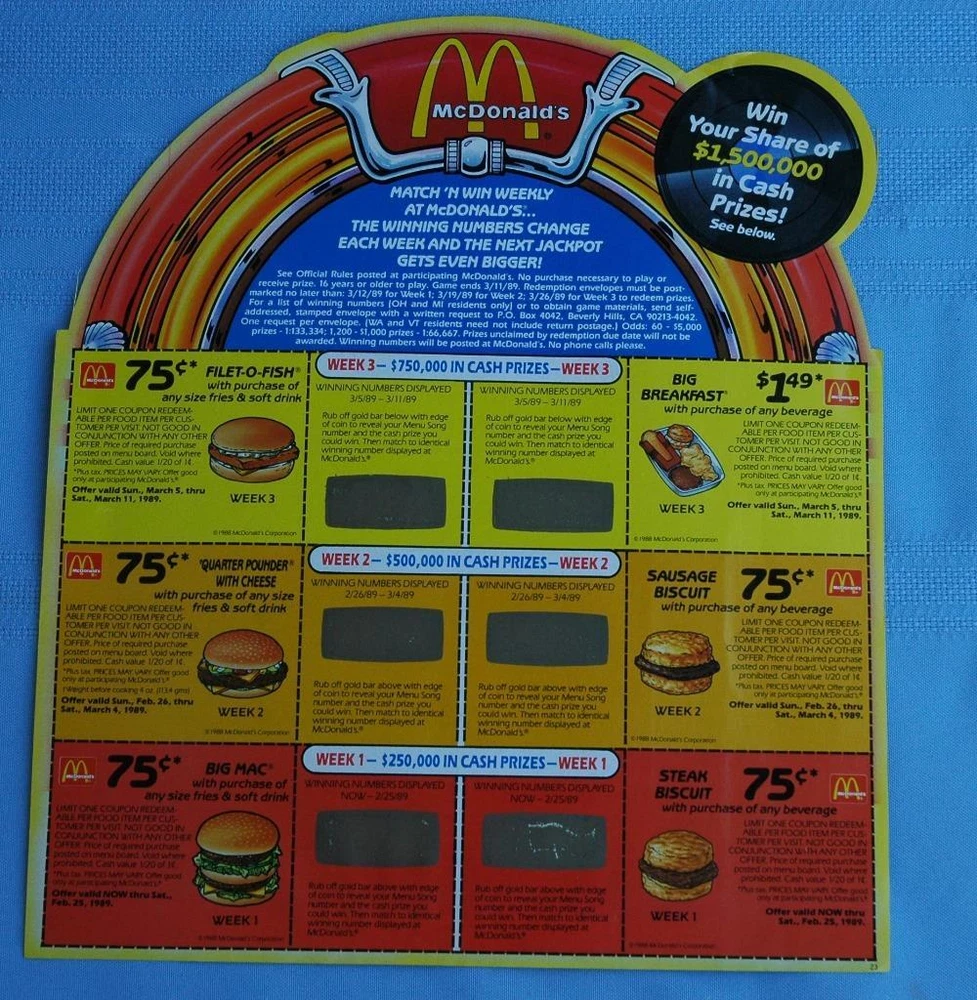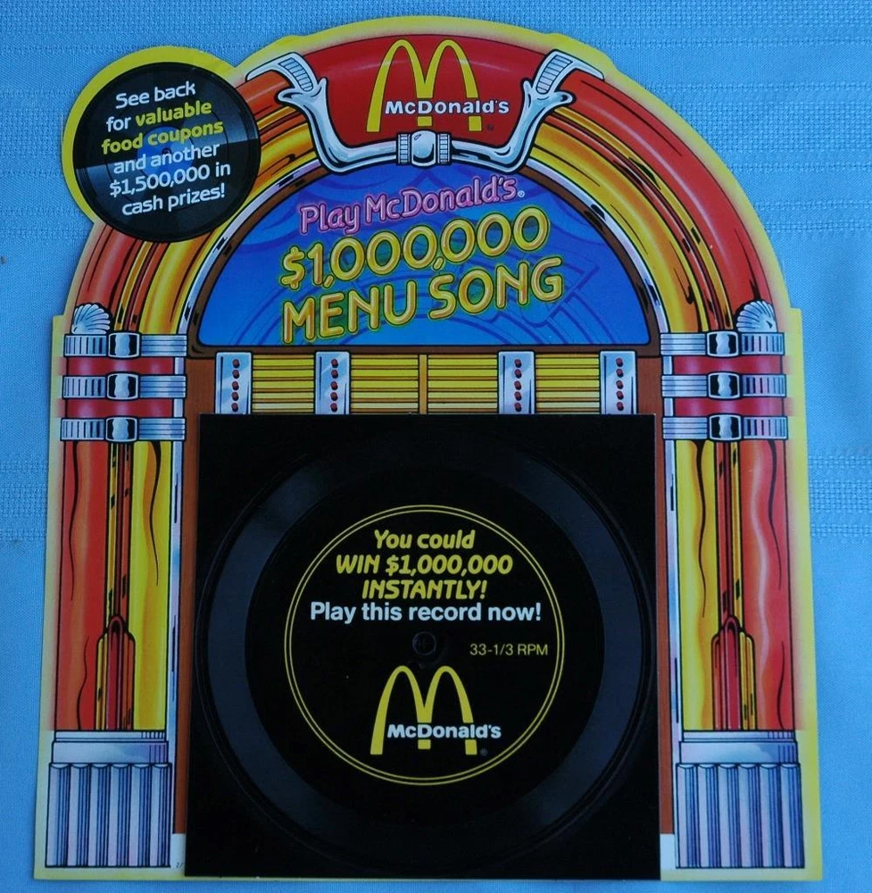 Offered For Sale is an Unused "Play McDonalds $1,000,000 Menu Song" Advertisement With 5 1/2" Flexible Record Disc - on the verso are coupons and scratch off chances to win - they have not been scratched - in exceptional condition - overall size is about 10 1/2" x 9" Unused Play McDonalds $1,000,000 Menu Song Coupon Advertisement Unused Play McDonalds $1,000,000 Menu Song Coupon Advertisement Click images to enlarge Description Offered For Sale is an Unused "Play McDonalds $1,000,000 Menu Song" Advertisement With 5 1/2" Flexible Record Disc - on the verso are coupons and scratch off chances to win - they have not been scratched - in exceptional condition - overall size is about 10 1/2" x 9" purchased at a Florida estate auction house BAY2403 Shipping Items to continental US will be send via USPS media mail, Fed Ex Ground, Or Parcel Post unless other arrangements are made. Handling time is up to 4 business days prior to shipping. There are many expenses involved in shipping your product safely including padded mailers, bubble wrap, peanuts, tape, FRAGILE stickers, and in most cases insurance since insurance is now seller's responsibility. Understand that shipping costs may reflect a charge for these items. It is also sometimes difficult to estimate shipping costs before the item is actually packaged. If you feel you have been overcharged, please contact me before leaving negative feedback. If there is a large discrepancy, I will make an adjustment, often before you ask! Terms of Sale Full refunds are available if not satisfied. Item must be returned in same condition as shipped. Kindly contact me immediately should you in any way be unhappy with your purchase, as I will make every effort to correct the situation, as evidenced by my feedback track record. Get images that make Supersized seem small. Showcase your items with Auctiva's Listing Templates! THE simple solution for eBay sellers. Track Page Views With Auctiva's Counter