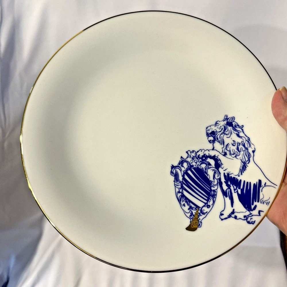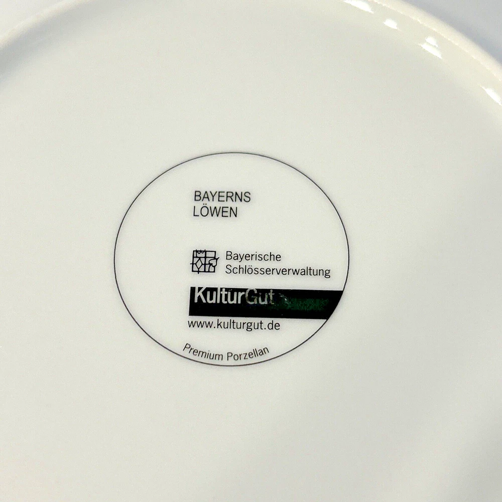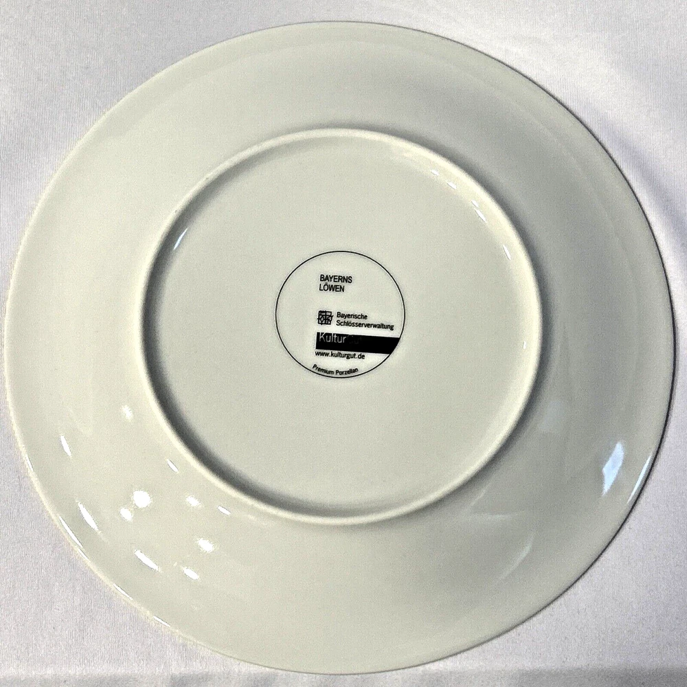This beautiful and unusual salad plate from Kulturgut is a must-have for any collector. The round white porcelain plate has a diameter of 8.25 inches and features a stunning lion design inspired by Bavaria's Bayerns Lowen. The plate is an original 21st-century piece and is printed with the brand's backstamp. Hand wash only and perfect for any contemporary style setting, this plate is a great addition to any decorative cookware, dinnerware, and serveware collection. The set includes one plate and is an ideal choice for anyone who loves Bavarian culture. Cream background with blue lion design. Gold rim and design accent. 8.25" diameter. Maker's mark on back. Thank you for looking! 56893991024
