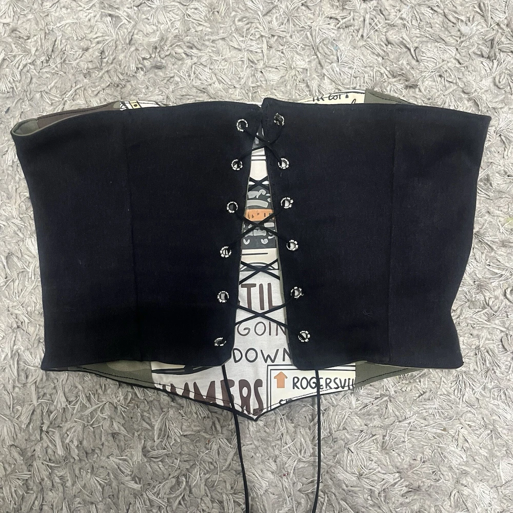 Custom made; one of a kind! Upcycled fro. Morgan Wallen tee, black denim, and cano denim Lace up corset back Strapless Adjustable Wallen decal on back panel Perfect for a country concert or a bike Morgan Wallen fan! Reversible Women’s size medium Feel free to ask questions! Available for customs