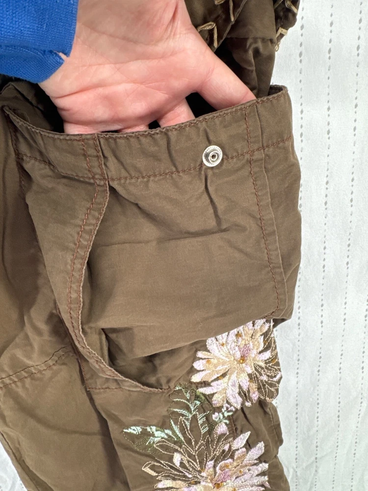 Upcycled Vintage Womens Pants Sz M Brown Parachute Cargo Floral Embroidered Boho