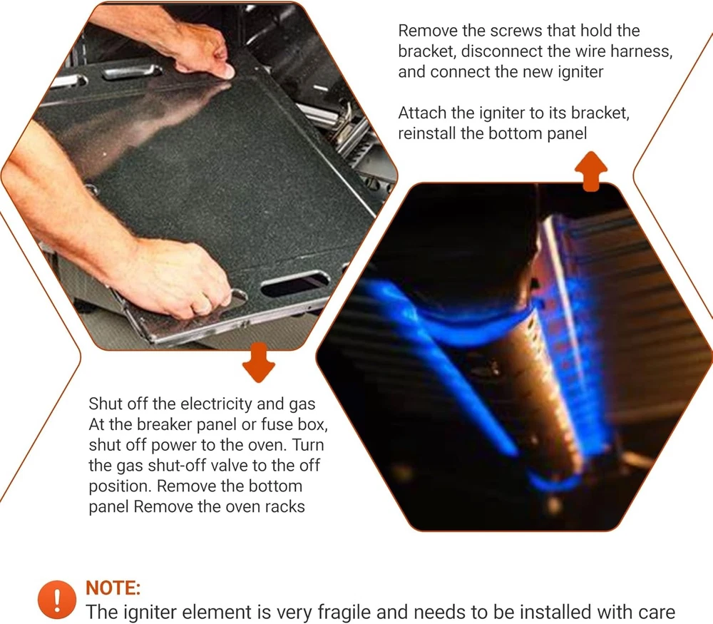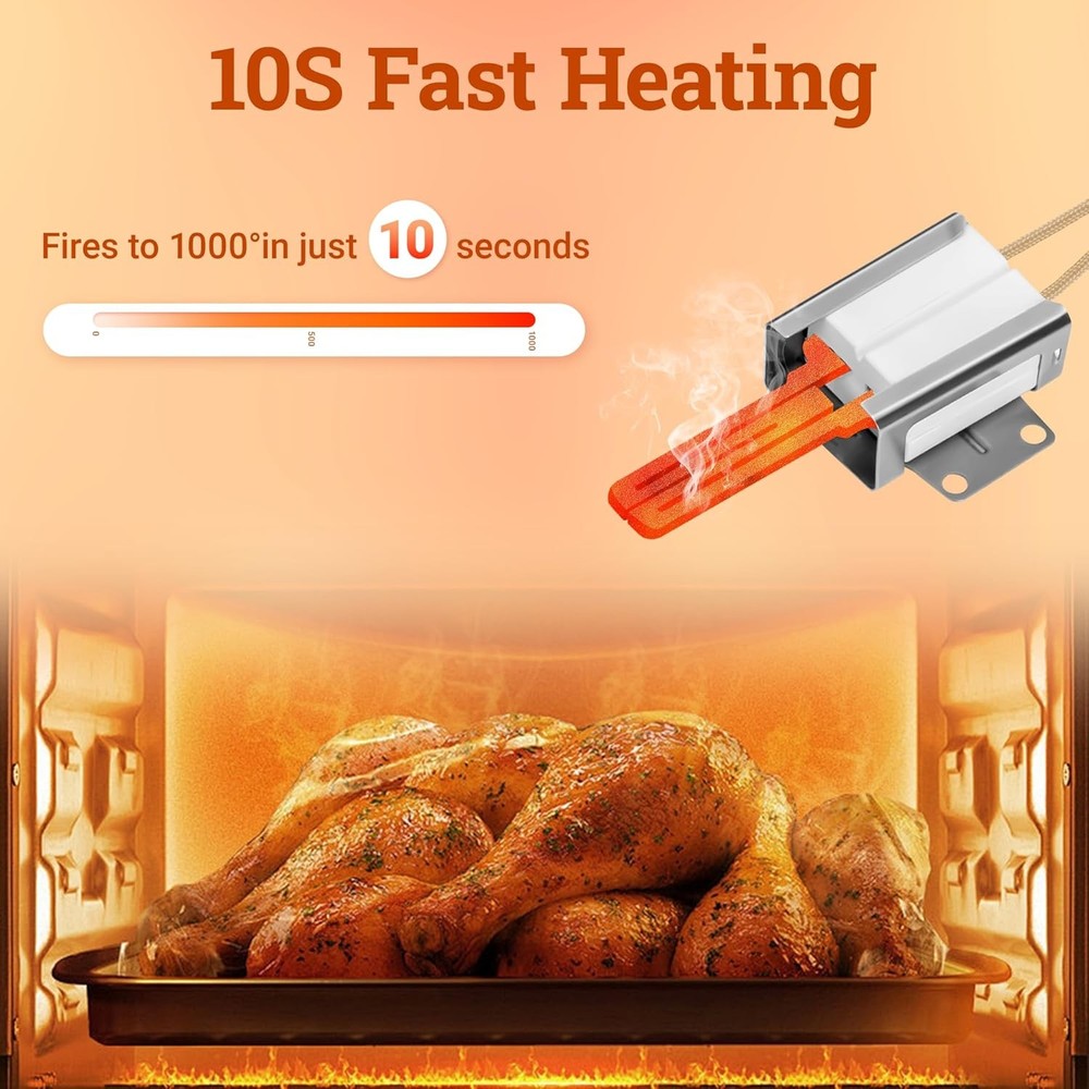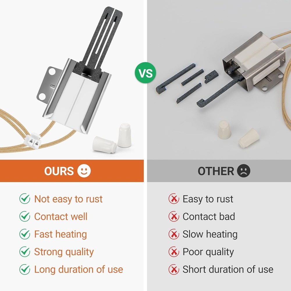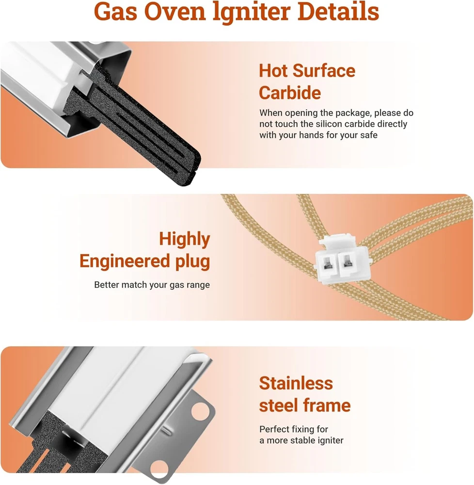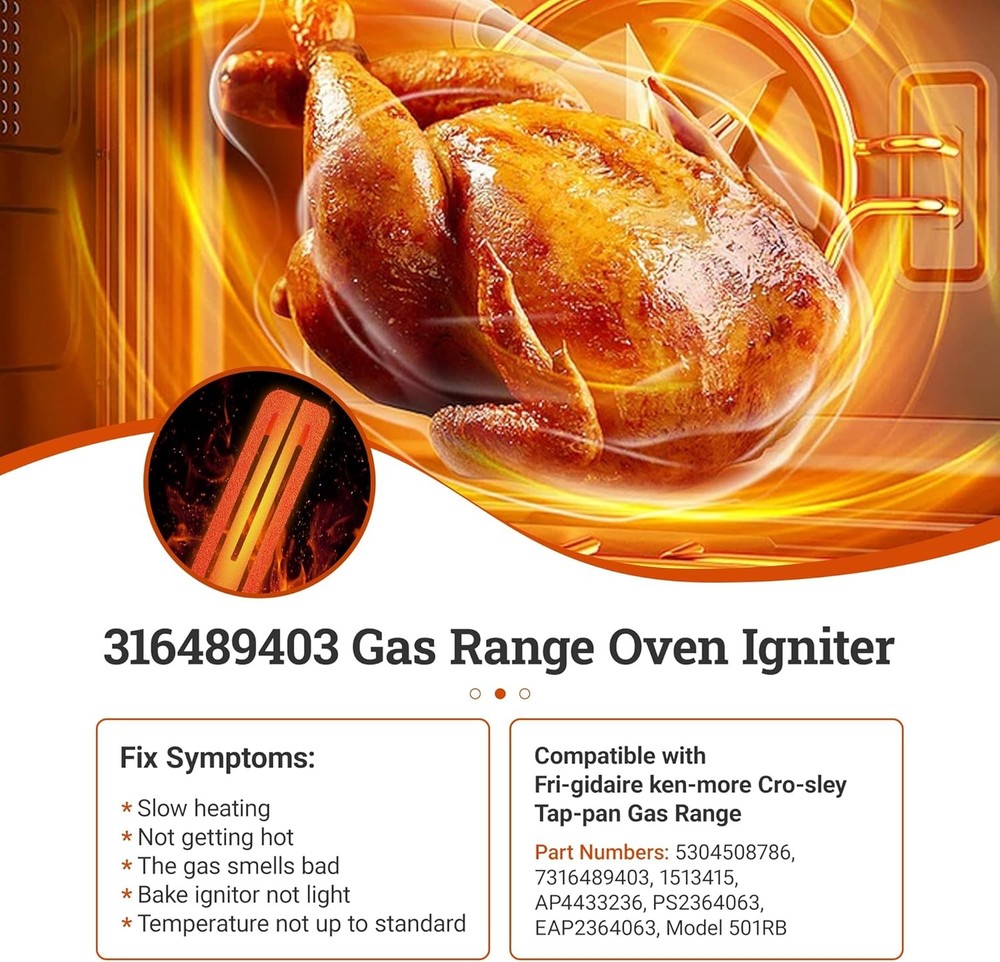 Free Replacement We offer a 60-day exchange service for this 316489403 / 5304508786 oven igniter. Your satisfaction matters to us! Though we pack each igniter with double-layer foam, it may get damaged easily due to its material and long shipping. If you receive a damaged unit or have other issues, please contact us via eBay message first—we’ll resolve it promptly. Buy with confidence! Perfect Compatibility Fits top brands: Frigidaire, Kenmore, Crosley, Electrolux, Tappan, White Westinghouse, and more. Replacement part numbers: 501RB, 5304508786, 7316489403, 1513415, PS2364063, AP4433236, EAP2364063. See below for all compatible models. Autoparts-plus Best choice of motor parts Updated Range Oven Gas Igniter Replacement for Electrolux Frigidaire New Ignitor Free Replacement We offer a 60-day exchange service for this 316489403 / 5304508786 oven igniter. Your satisfaction matters to us! Though we pack each igniter with double-layer foam, it may get damaged easily due to its material and long shipping. If you receive a damaged unit or have other issues, please contact us via eBay message first—we’ll resolve it promptly. Buy with confidence! Perfect Compatibility Fits top brands: Frigidaire, Kenmore, Crosley, Electrolux, Tappan, White Westinghouse, and more. Replacement part numbers : 501RB, 5304508786, 7316489403, 1513415, PS2364063, AP4433236, EAP2364063. See below for all compatible models. Package List Includes 1 gas stove igniter, 1 connector plug, 2 ceramic wire nuts. Wire length: 8 inches Ceramic rod length: 1.5 inches Note : If connections don’t match, cut the wires and attach with the included nuts. Premium Quality Made of high-quality silicon carbide, tested to meet OEM standards. This igniter heats up to 2800°F in 1 minute, solving issues like oven not heating, failing to ignite, or igniter malfunction. Please Note The 501RB igniter element is fragile—do not touch it to avoid damage or contamination. If your igniter looks “used,” it’s normal: our staff test each unit, leaving a protective silica film. Compatible Models ( Press "Ctrl + F", then enter your model number for a quick search. ) Kenmore Gas Range : 79078883900, 79078883901, 79078883902, 79078883903, 79078889900, 79078889902, 79078889903, 79078889904, 79078893900, 79078893902, 79078893903, 79078893904, 79079653705, 79079653706, 79079653707, 79079653708, 79079653709, 7907965370A, 79072402010, 79072404010, 79072408010, 79072409010, 79074033312, 79074132311, 79074134311, 79074139311, 79074334311, 79074339311, 79074343311, 79074032312, 79074033313, 79074039312, 79074132313, 79074133313, 79074134313, 79074139313, 79074232313, 79074233313, 79074239313, 79074332313, 79074333313, 79074334313, 79074339313, 79074343313, 79074132312, 79074133312, 79074134312, 79074139312, 79074232312, 79074233312, 79074239312, 79074332312, 79074334312, 79074339312, 79074343312, 79075232311, 79075233311, 79075232312, 79075233312, 79075239312, 79075353313, 79071342704, 79071342705, 79071342706, 79071343706, 79071343707, 79071343708, 79071343709, 79071349704, 79071349705, 79071349706, 79071362705, 79071362706, 79071362707, 79071363708, 79071363709, 7907136370A, 7907136370B, 79071369705, 79071369706, 79071369707, 79071382705, 79071382706, 79071382707, 79071382708, 79071383707, 79071383708, 79071383709, 7907138370A, 79071384705, 79071384706, 79071384707, 79071384708, 79071389705, 79071389706, 79071389707, 79071389708, 79072301010, 79072301011, 79072302010, 79072302011, 79072302012, 79072303010, 79072303011, 79072309010, 79072309012, 79072311110, 79072311111, 79072311112, 79072312010, 79072312011, 79072312012, 79072312013, 79072312014, 79072312015, 79072313010, 79072313011, 79072313012, 79072313013, 79072313014, 79072313015, 79072319010, 79072319011, 79072319012, 79072319013, 79072319014, 79072319015, 79072333010, 79072333011, 79072333012, 79072333013, 79072333014, 79072333015, 79072402012, 79072402013, 79072402014, 79072403011, 79072403012, 79072403013, 79072404012, 79072404013, 79072404014, 79072408012, 79072408013, 79072408014, 79072409012, 79072409013, 79072409014, 79072502010, 79072502011, 79072503010, 79072503011, 79072509010, 79072509011, 79072602010, 79072602011, 79072602012, 79072602013, 79072603010, 79072603011, 79072603012, 79072603013, 79072609010, 79072609011, 79072609012, 79072609013, 79072633210, 79072633211, 79072633212, 79072702010, 79072702011, 79072702012, 79072703010, 79072703011, 79072703012, 79072704010, 79072704011, 79072704012, 79072709010, 79072709011, 79072709012, 79072712210, 79072712211, 79072712212, 79072713210, 79072713211, 79072713212, 79072719210, 79072719211, 79072719212, 79072802010, 79072802011, 79072802012, 79072803010, 79072803011, 79072803012, 79072809010, 79072809011, 79072809012, 79072902010, 79072902011, 79072902012, 79072902013, 79072902014, 79072902015, 79072903010, 79072903011, 79072903012, 79072903013, 79072903014, 79072903015, 79072904010, 79072904011, 79072904012, 79072904013, 79072904014, 79072904015, 79072909010, 79072909011, 79072909012, 79072909013, 79072909014, 79072909015, 79074003310, 79074032310, 79074032311, 79074033310, 79074033311, 79074039311, 79074043310, 79074132310, 79074133310, 79074133311, 79074134310, 79074139310, 79074232310, 79074232311, 79074233310, 79074233311, 79074239310, 79074332310, 79074332311, 79074333310, 79074333311, 79074334310, 79074339310, 79074343310, 79075232310, 79075233310, 79075239310, 79075332310, 79075333310, 79075333311, 79074032313, 79074032314, 79074033314, 79074039313, 79074039314, 79074132314, 79074133314, 79074134314, 79074139314, 79074142710, 79074142711, 79074143710, 79074143711, 79074149710, 79074149711, 79074232314, 79074232315, 79074232316, 79074233314, 79074233316, 79074233317, 79074237710, 79074237711, 79074237712, 79074237713, 79074239314, 79074239315, 79074332314, 79074333314, 79074333315, 79074334314, 79074339314, 79074339315, 79074452810, 79074453810, 79074455810, 79074457810, 79074459810, 79074512910, 79074513910, 79074519910, 79074